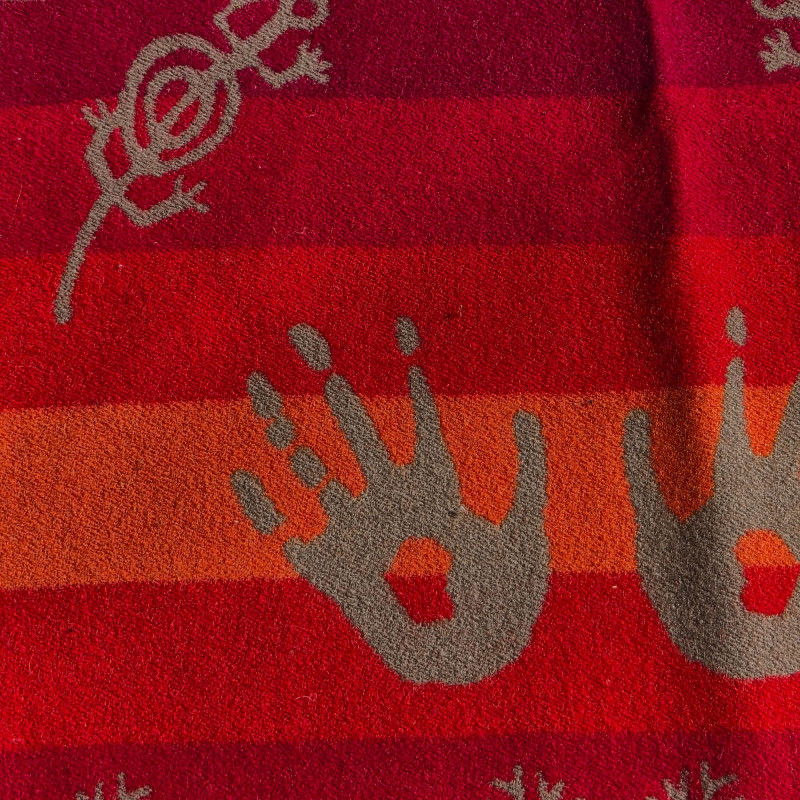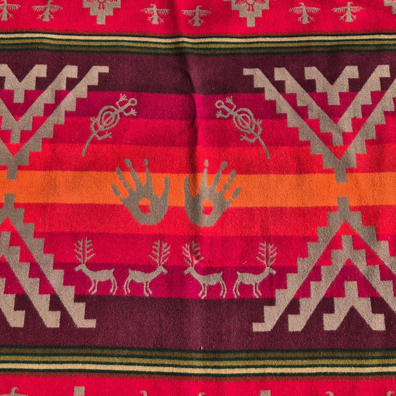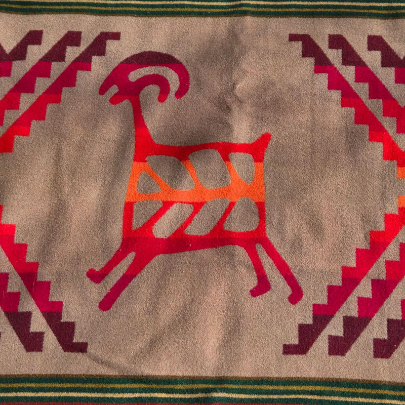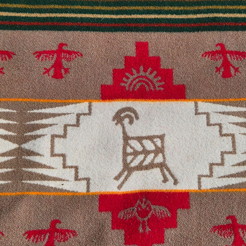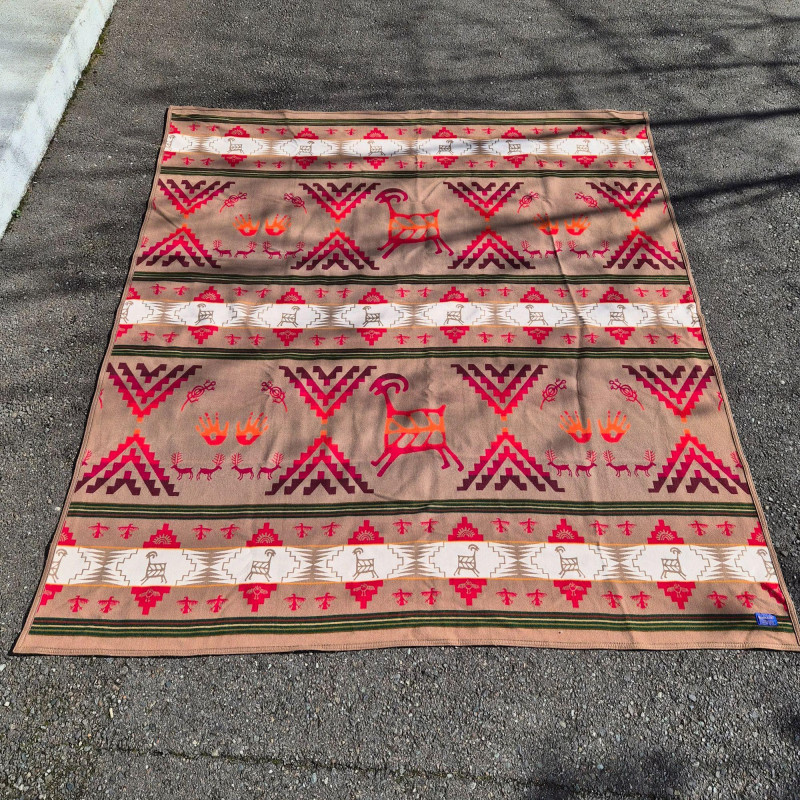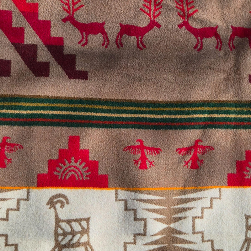 Large Pendleton cotton‑wool blanket measuring 92" x 82", featuring bold woven patterning in warm, saturated tones with stylized animal and geometric motifs. Soft, mid‑weight construction suitable for use as a bed covering or decorative textile. Estate‑found with expected wear for age; see photos for color, weave detail, and overall condition.