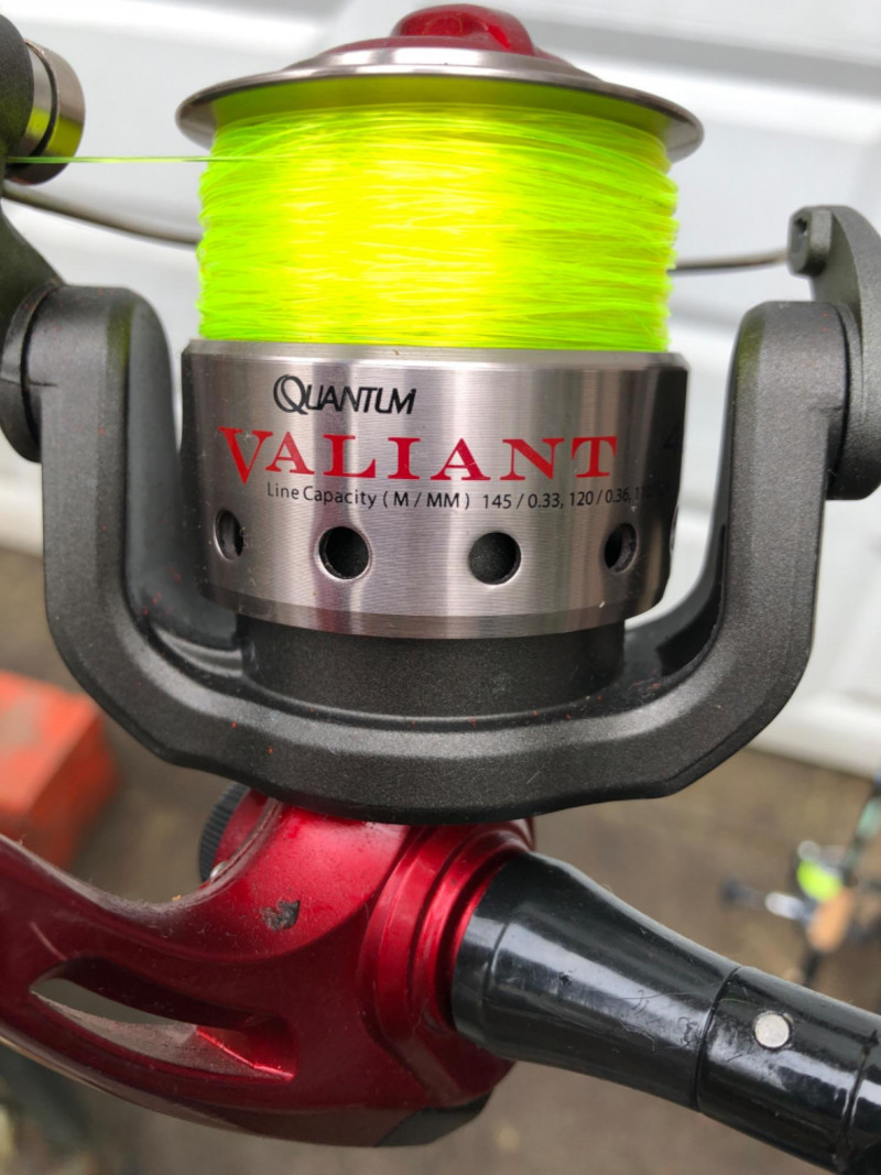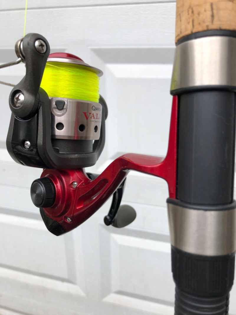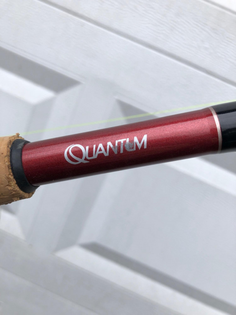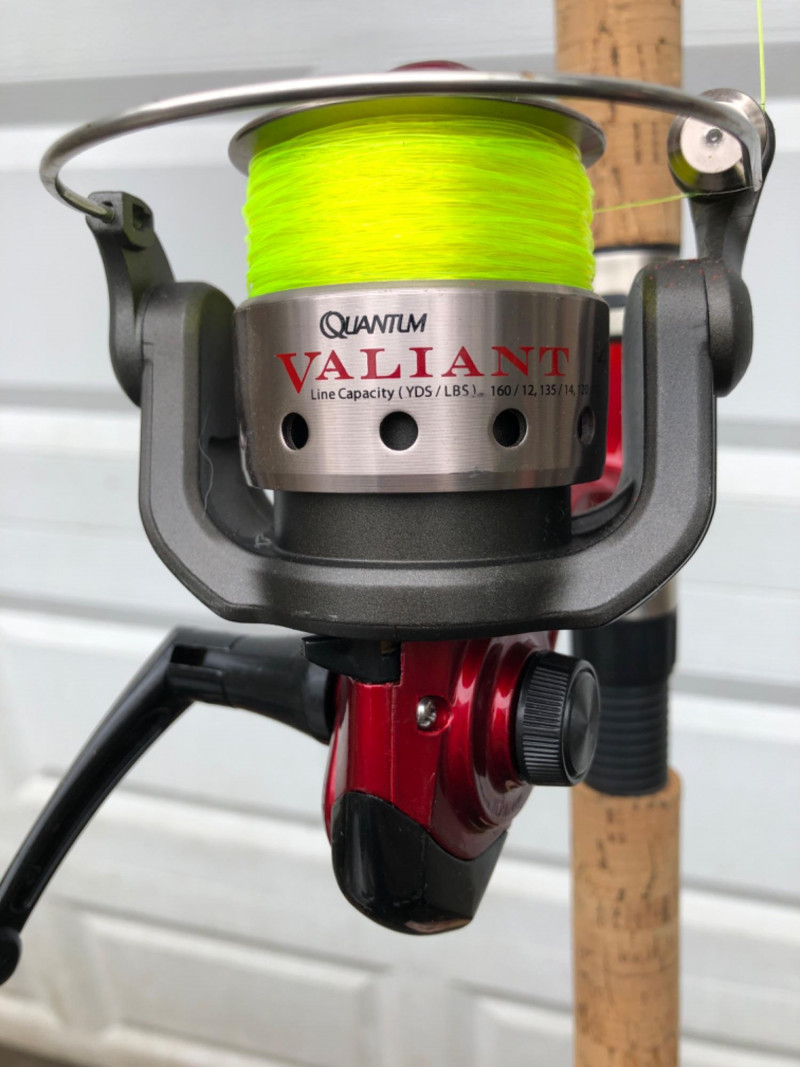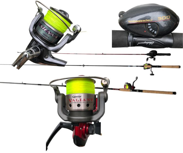 Group of three fishing rod and reel combos, each paired and ready for freshwater use. Includes: Quantum Valiant reel on Quantum Valiant QXcp graphite composite rod - 8.5 feet long
