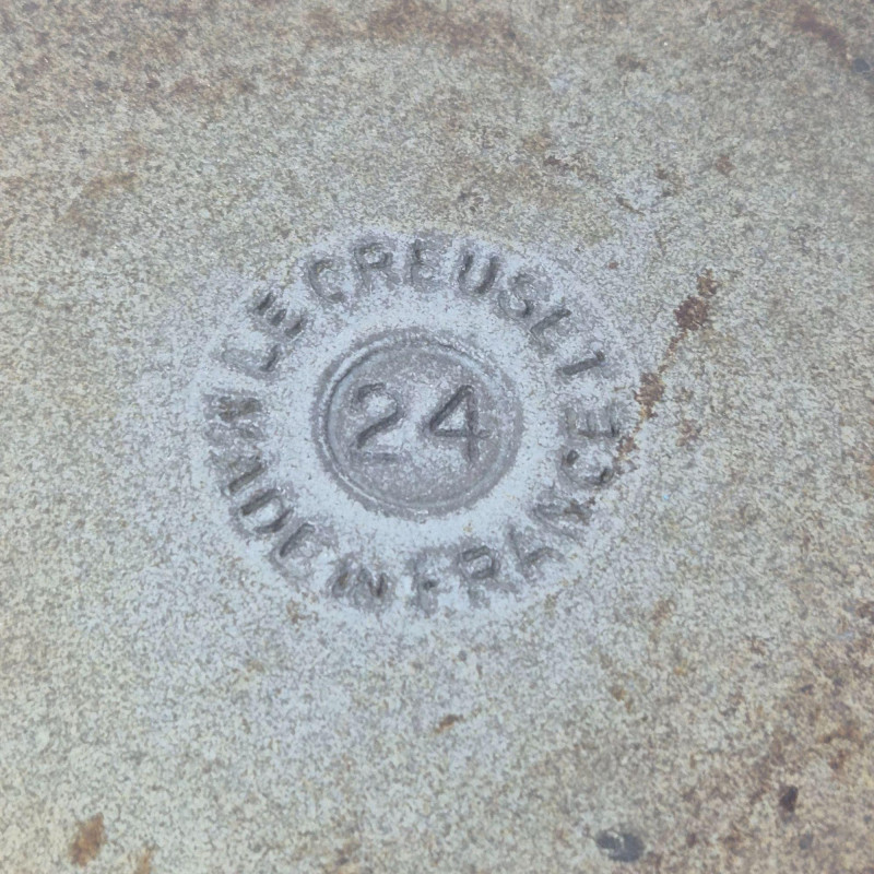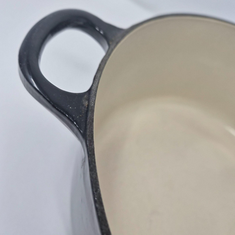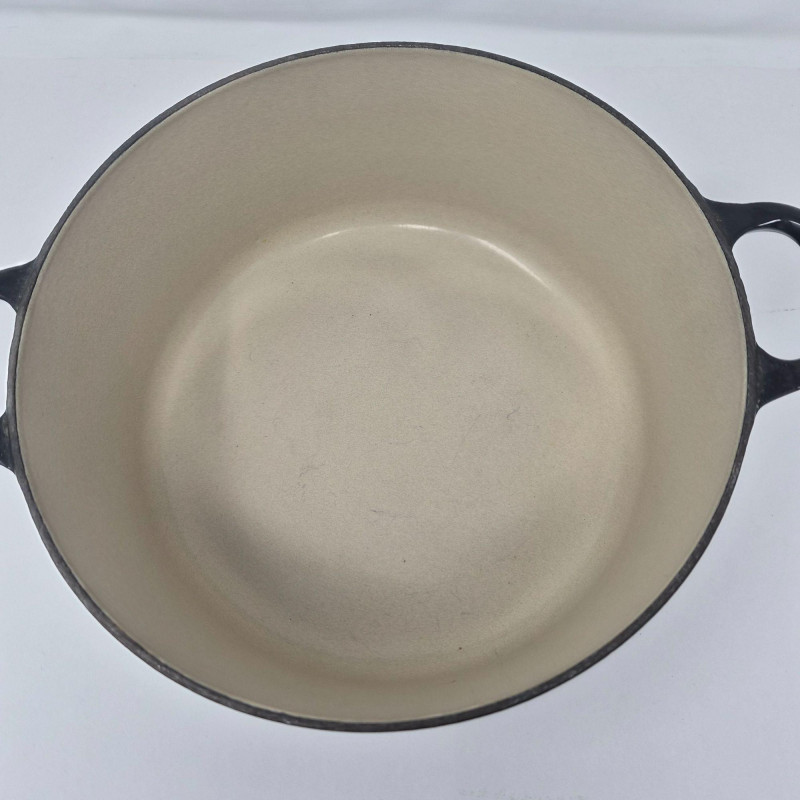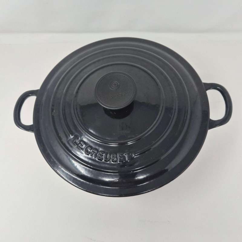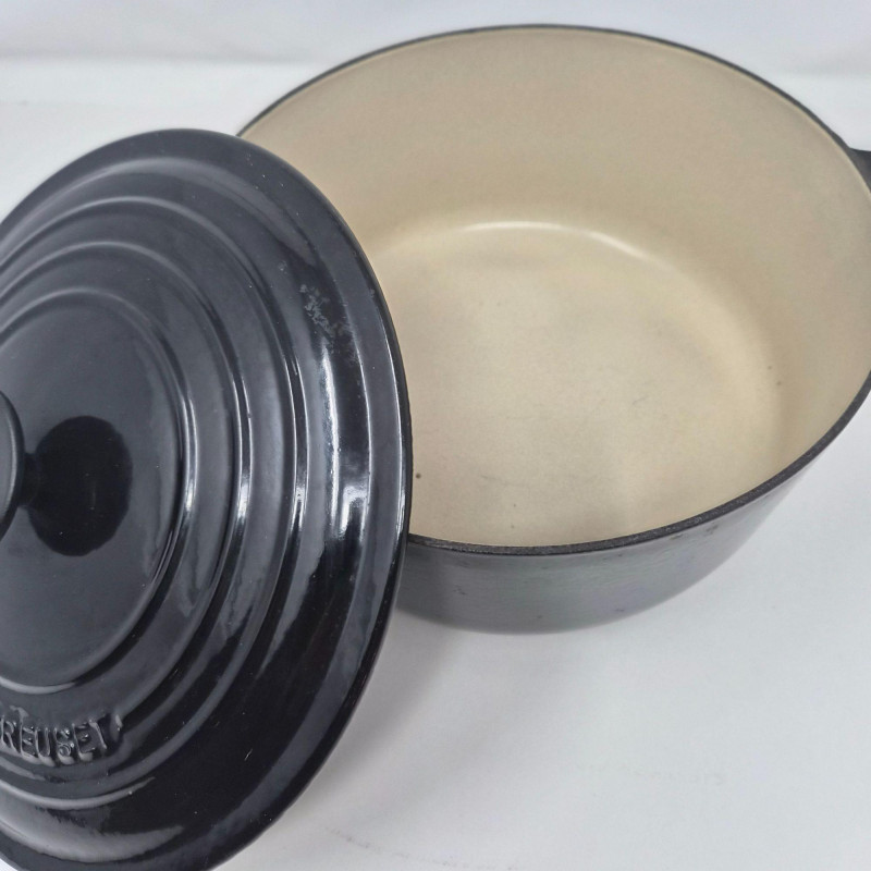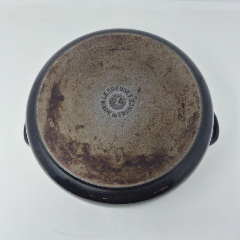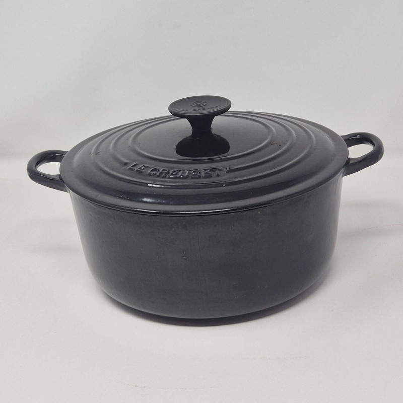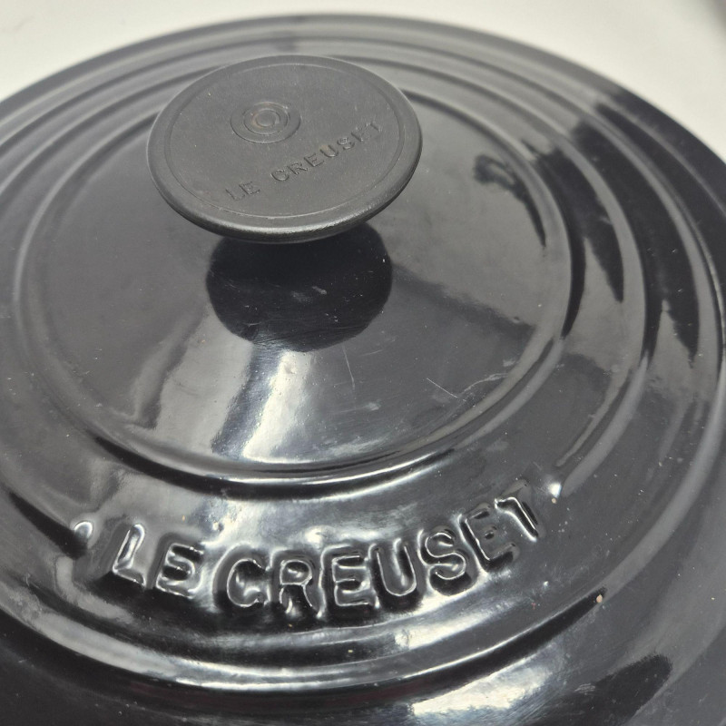 Le Creuset No. 24 round enameled cast‑iron Dutch oven in black, complete with matching lid and embossed branding. The matching lid includes the traditional Le Creuset knob and fits securely. This 4.5‑quart size is ideal for soups, stews, braising, and oven‑to‑table cooking. Classic Le Creuset construction provides excellent heat retention and even cooking. Shows light wear consistent with use; see photos for enamel condition, interior, and lid details.