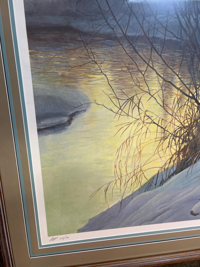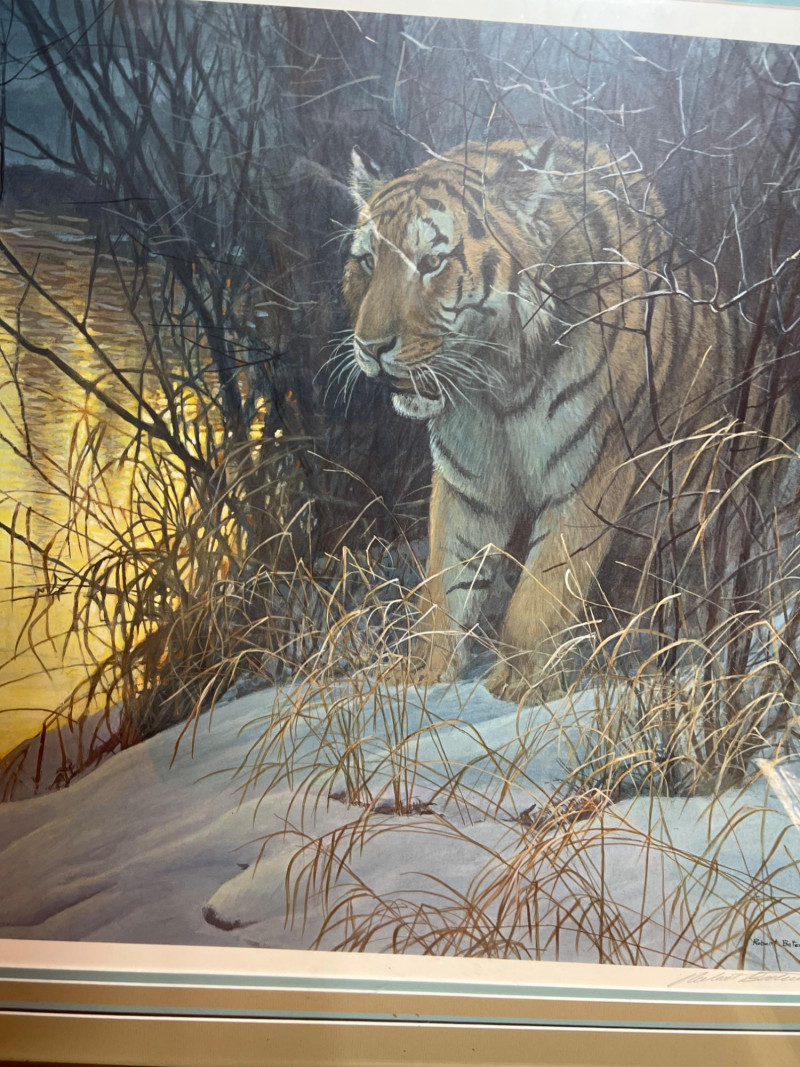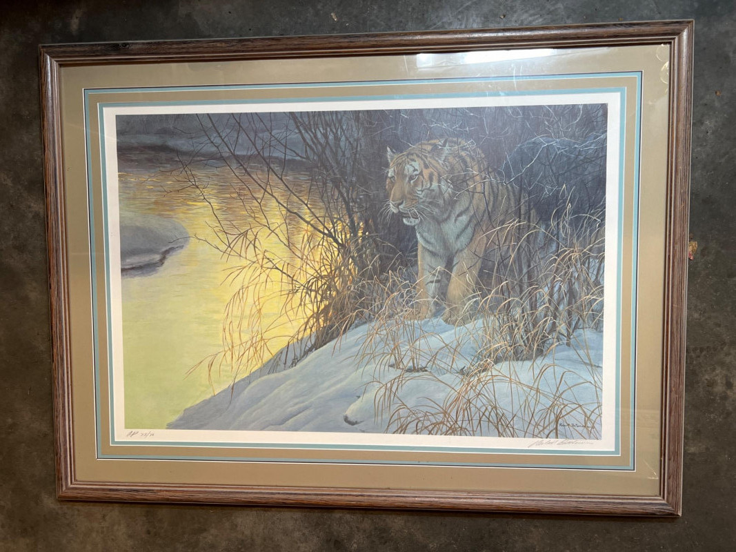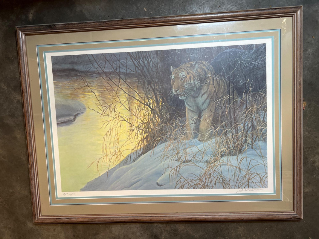 Limited edition Artist’s Proof (AP) 73/76 wildlife print by renowned Canadian naturalist painter Robert Bateman. Features a tiger emerging through winter grasses beside reflective water, rendered in Bateman’s signature realistic style. Professionally framed with layered mats and wooden frame. Hand‑signed and numbered by the artist. Offered as shown; see photos for framing, matting, and condition.