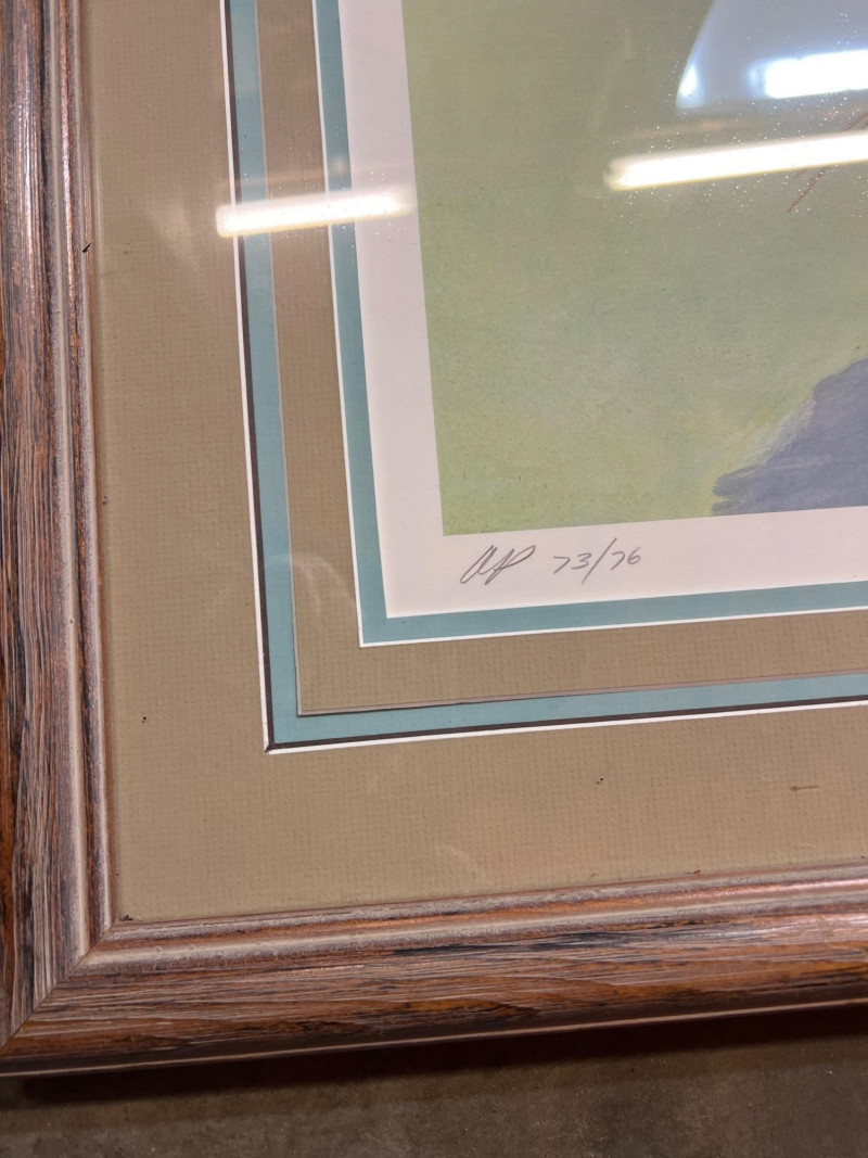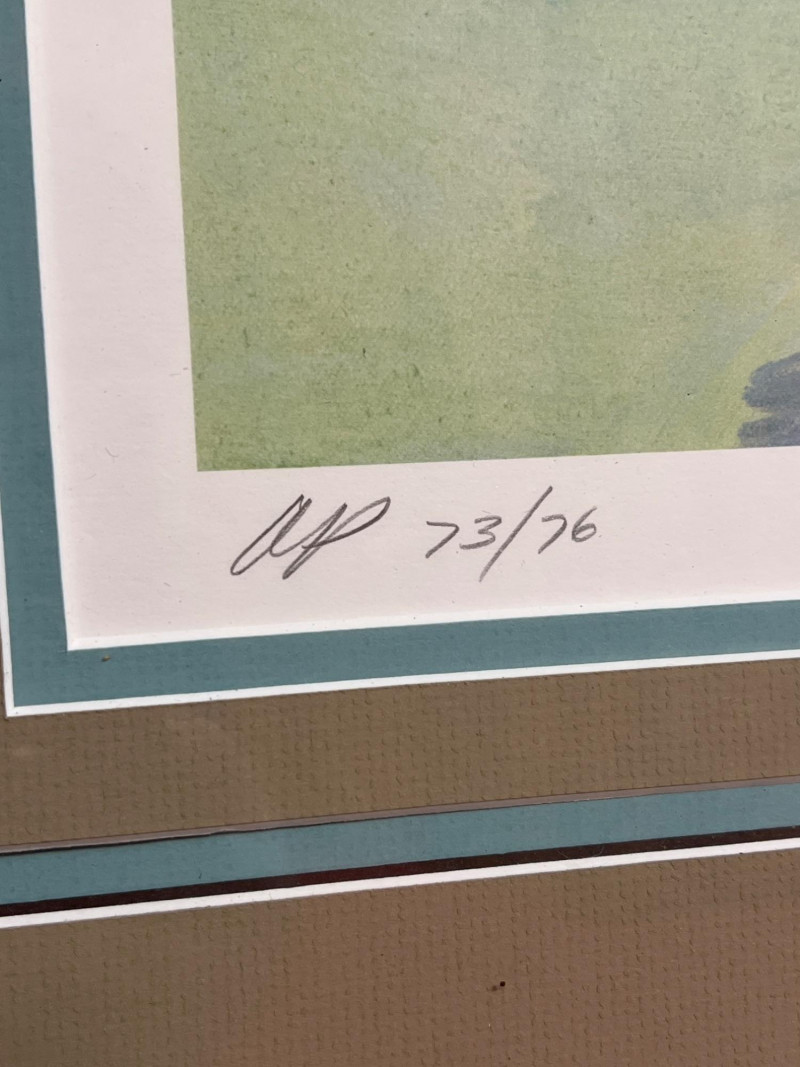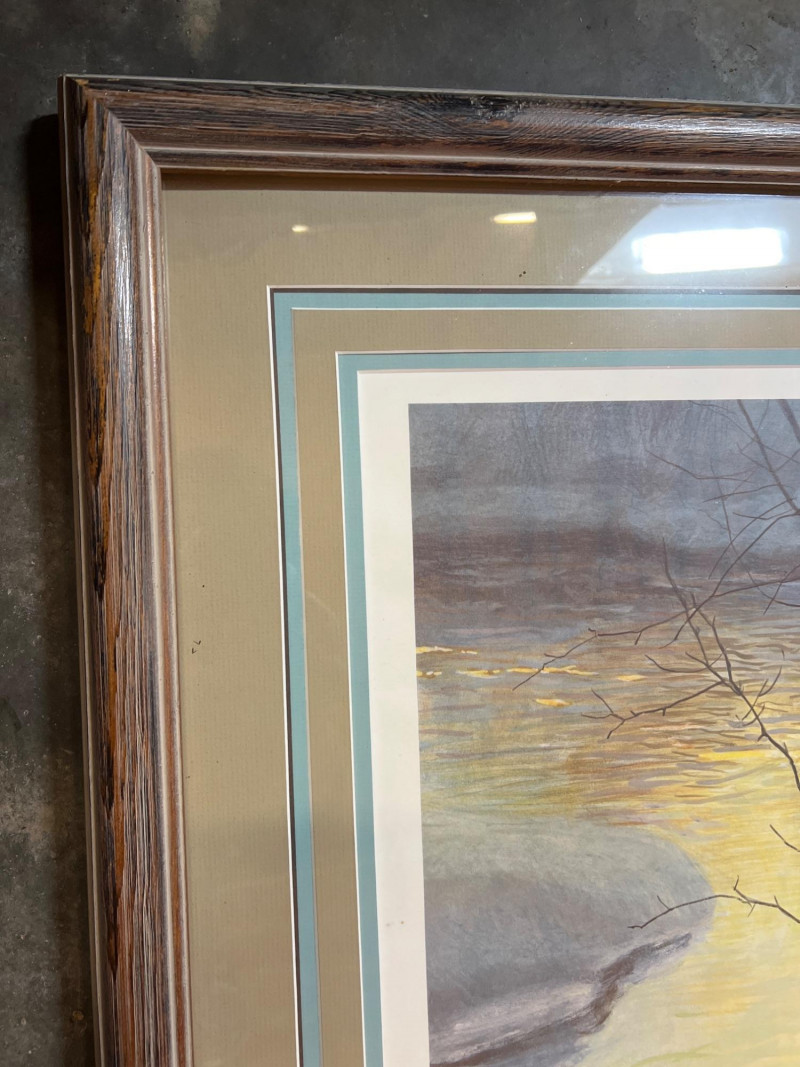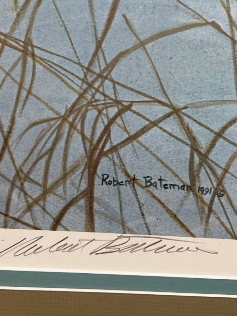 Limited edition Artist’s Proof (AP) 73/76 wildlife print by renowned Canadian naturalist painter Robert Bateman. Features a tiger emerging through winter grasses beside reflective water, rendered in Bateman’s signature realistic style. Professionally framed with layered mats and wooden frame. Hand‑signed and numbered by the artist. Offered as shown; see photos for framing, matting, and condition.