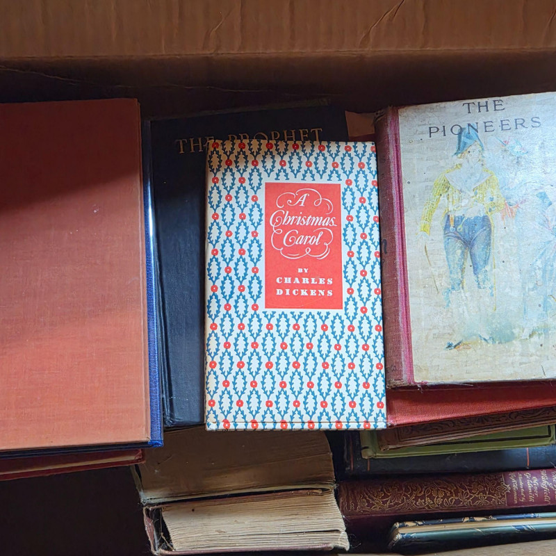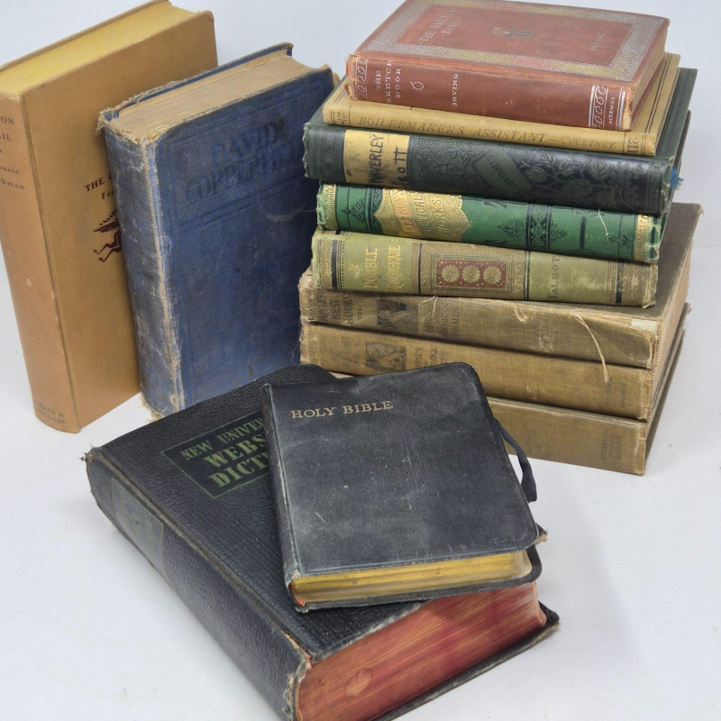A varied collection of early to mid‑20th‑century hardback books, packed into two sturdy cardboard boxes. This assortment spans literature, reference works, classic stories, and historical writings. Publication years and conditions vary, with some showing typical age wear and others remaining in solid, readable shape. Some with embossed covers and beautiful illustrations. A sampling of included titles within these two boxes are: