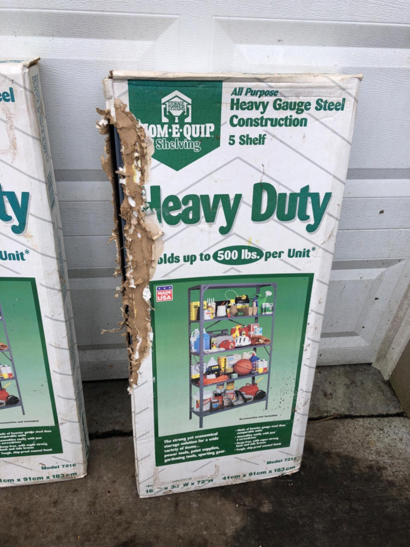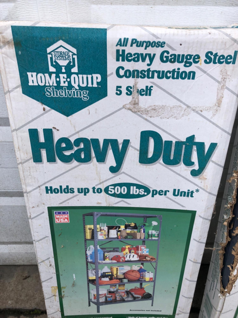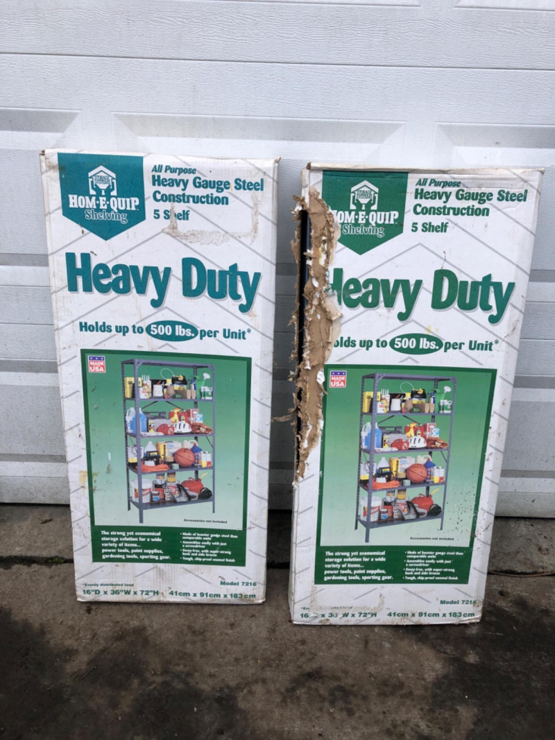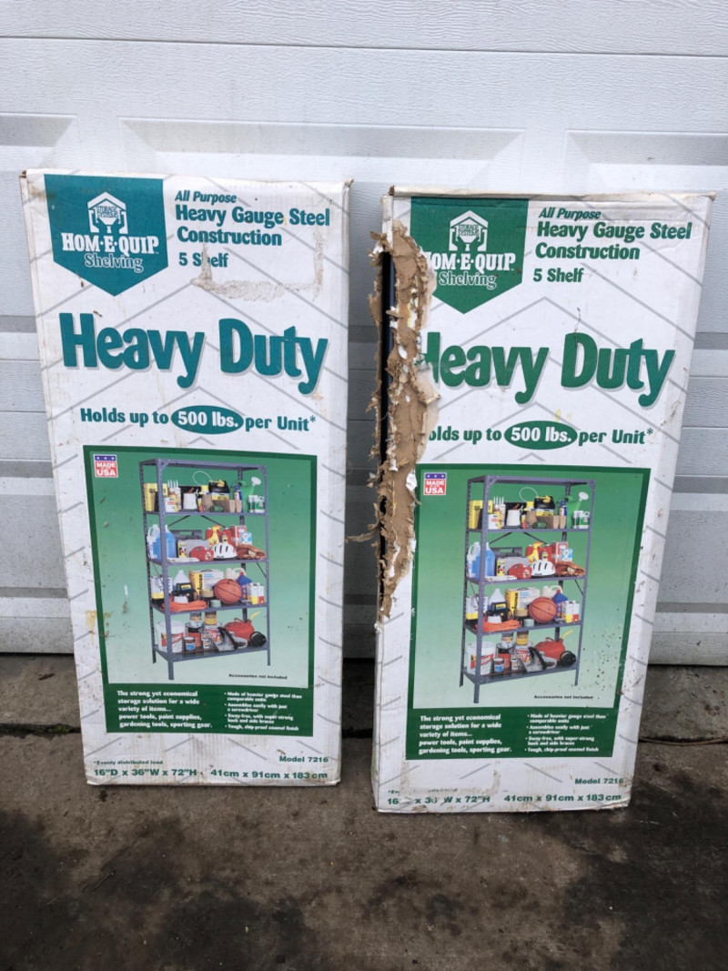 A pair of five-shelf, heavy‑duty steel shelving units - Each measuring 16" deep × 36" wide × 72" tall. These all‑purpose shelves feature heavy‑gauge steel construction, adjustable shelves, and a durable powder‑coated finish. Each unit is rated to hold up to 500 lbs, making them ideal for garages, workshops, basements, or utility storage. Both units are new in box, though the boxes show noticeable wear.