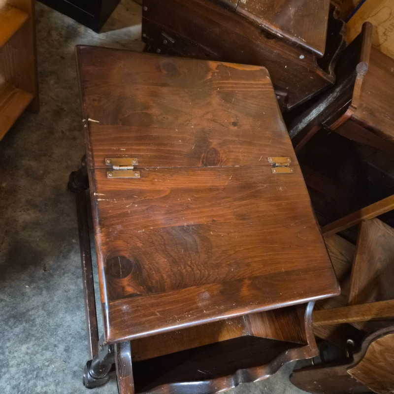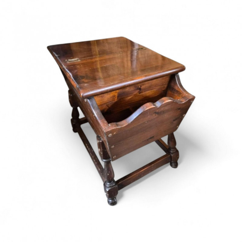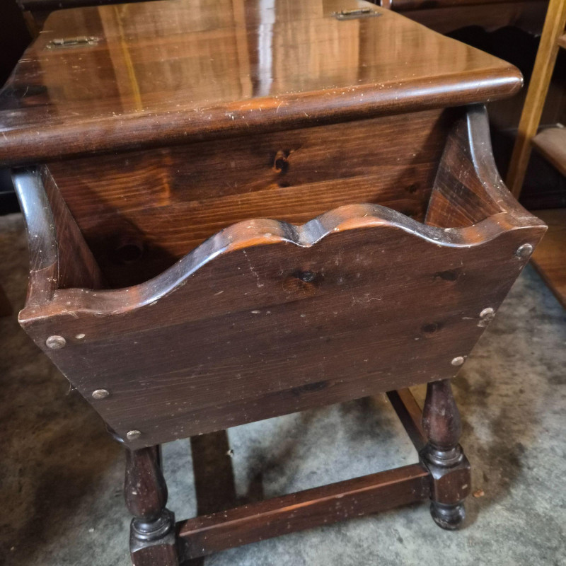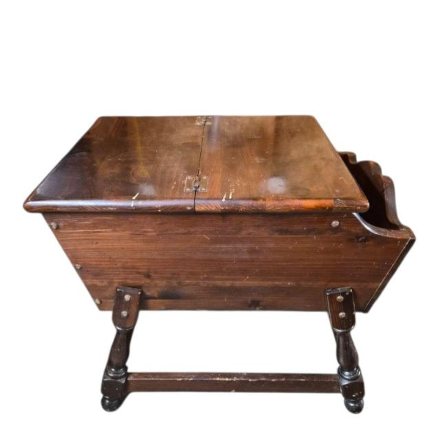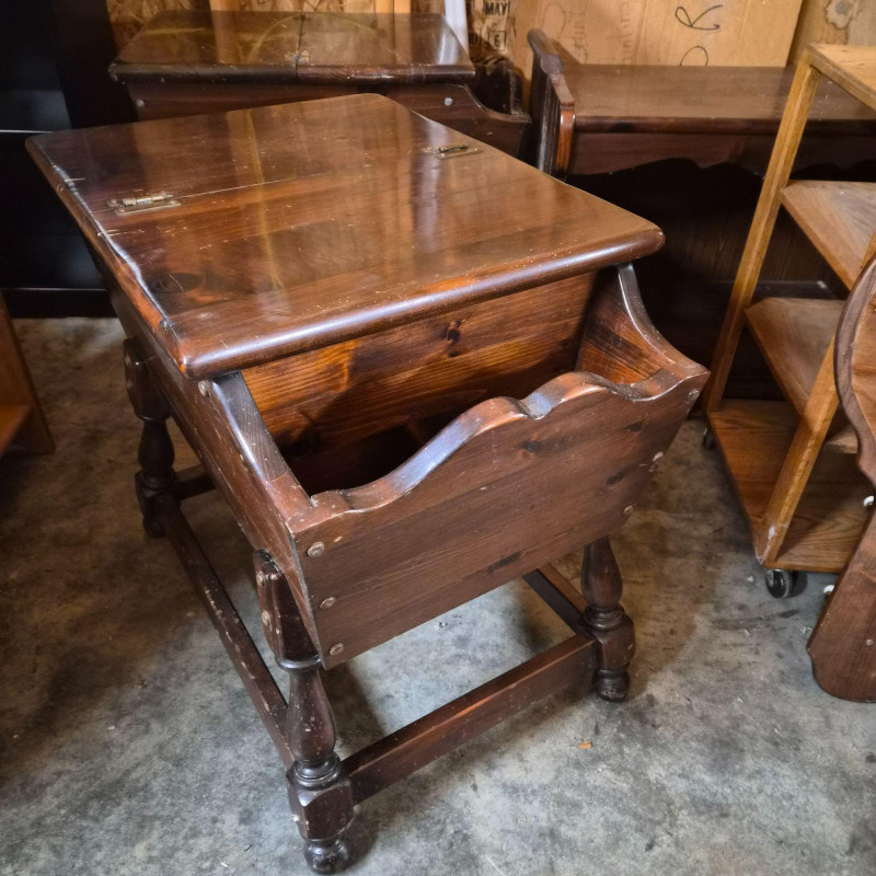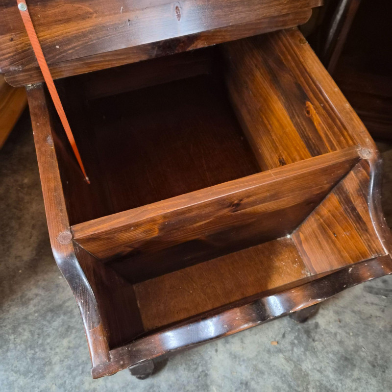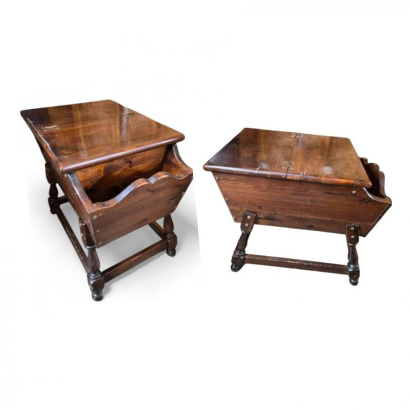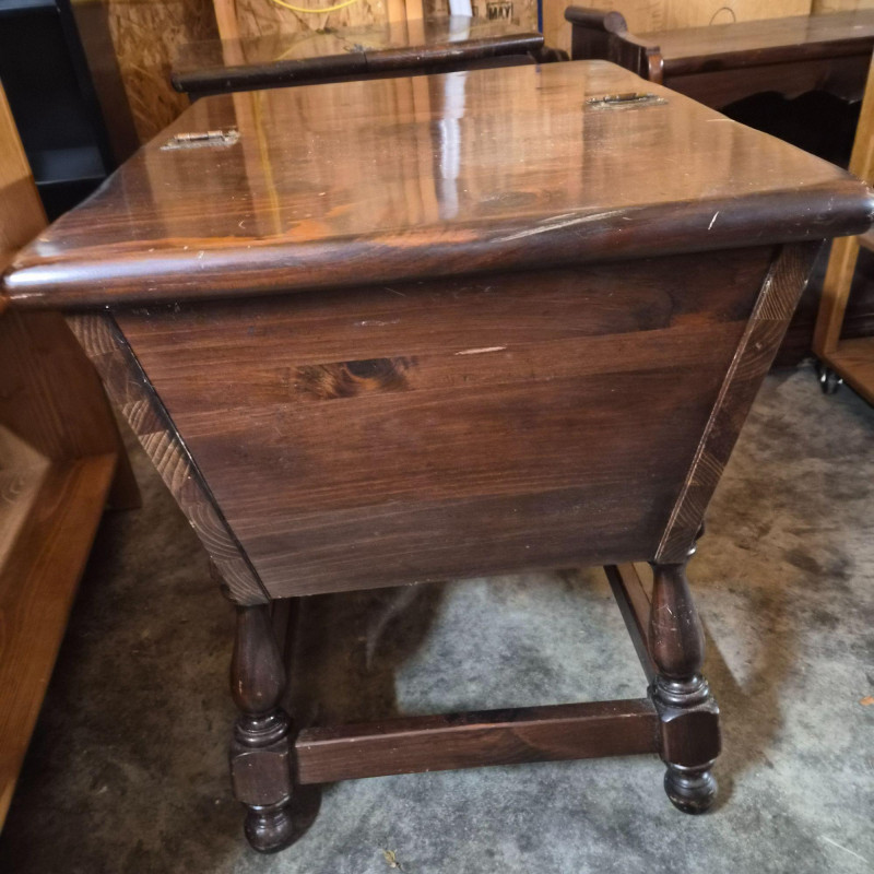 A handsome pair of dark wood side tables in the Ethan Allen style, each featuring a hinged lift‑top compartment for discreet storage. These tables offer classic, traditional lines with substantial presence—perfect beside a sofa, reading chair, or as multifunctional accent pieces. Both tables show surface wear and scratches consistent with age and use and would make a rewarding vintage restore for someone who appreciates bringing classic wood furniture back to life while remaining sturdy and functional. The underside tables are stamped: 12 8026 212 43 1083.