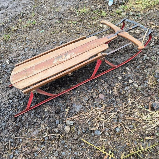 Vintage Flexible Flyer wooden sled featuring the classic steerable front bar, red steel runners, and the original eagle‑and‑banner logo on the deck. Constructed with wooden slats and metal hardware, this traditional downhill runner sled reflects mid‑century American winter design. The sled shows weathering, fading, and surface wear consistent with age and outdoor storage, adding to its vintage character. Suitable for display, décor, or restoration. See photos for logo detail, runner condition, and overall wear.