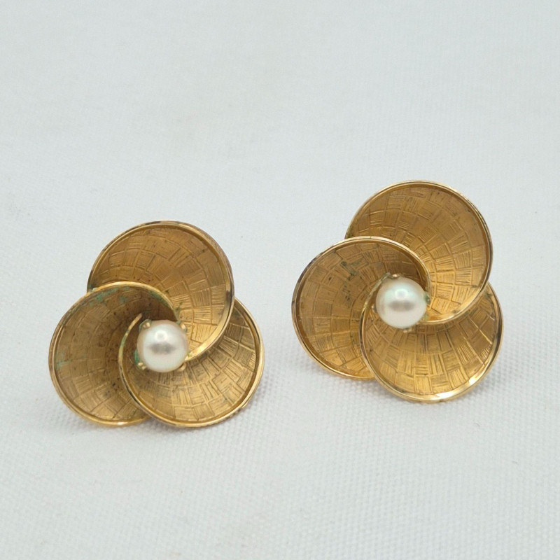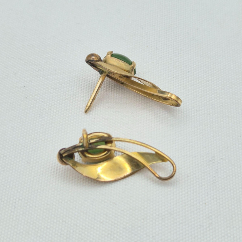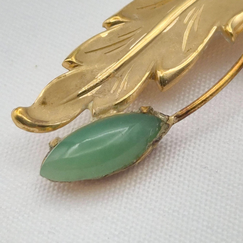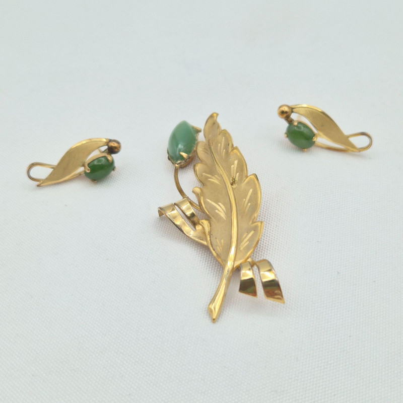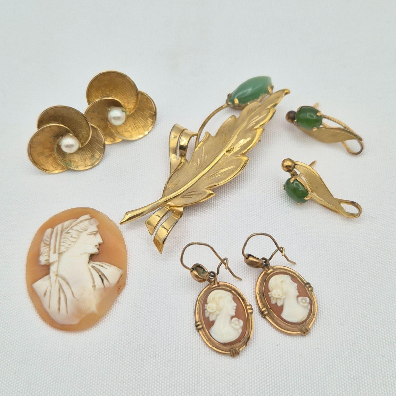 Mixed jewelry lot including a nephrite stone pinmeasuring 2.5" x .75"with matching pierced earringsat .75" long. The pin is as‑is, with two missing prongs, though the stone remains securely glued. Also included is a pair of 12KGF swirl floral pierced earringswith genuine pearl centers. The lot further features an unmounted carved shell cameomeasuring 1.5" x 1", and a pair of resin carved right‑facing cameo dangle earringsmeasuring .5" x .5". Estate‑found with age‑appropriate wear; see photos for cameo detail, stone surfaces, and metal condition. **This lot qualifies for shipping**