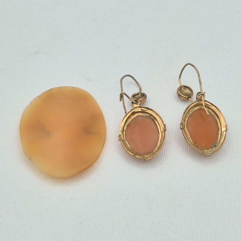 Lot # 95 - Nephrite Pin & Earrings, 12KGF Pearl Earrings, Shell & Resin Cameos
