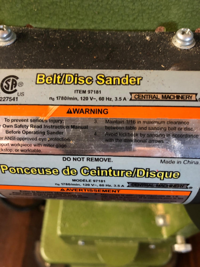 Central Machinery belt/disc sander, Item 97181, powered by a 120V, 60 Hz, 3.5A motor with a 1780 RPM no‑load speed. Features both belt and disc sanding surfaces for shaping, smoothing, and material removal. Safety labels and bilingual instructions are present. Unit shows typical shop wear and is presented as found.