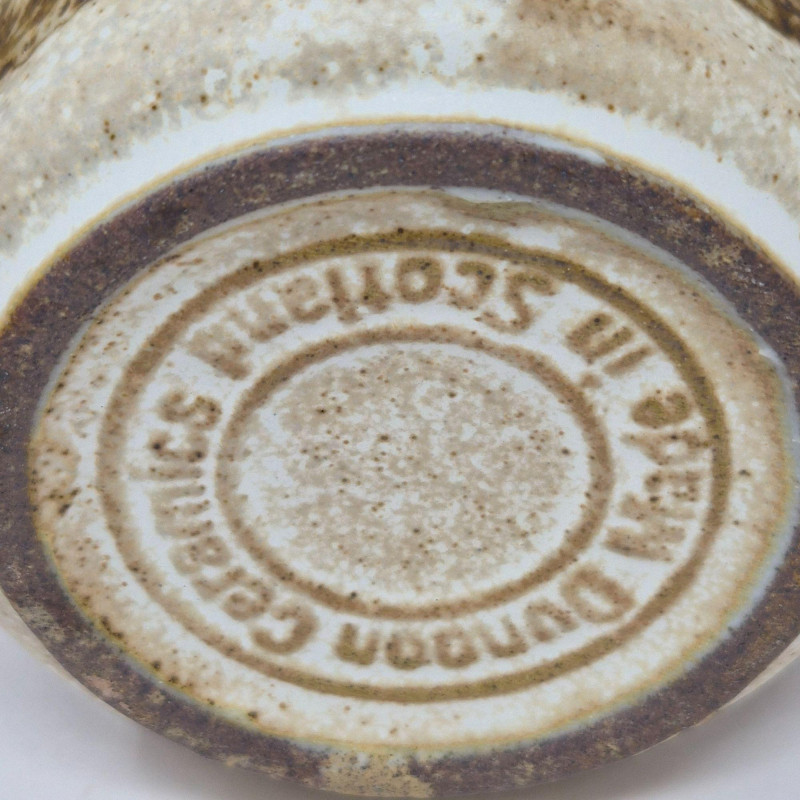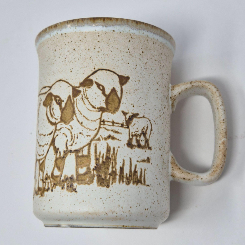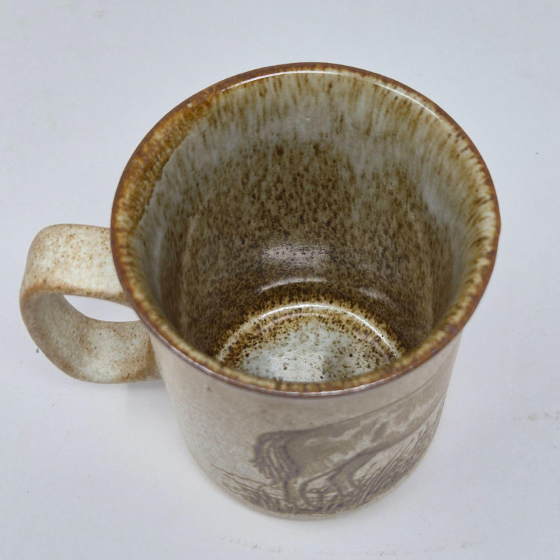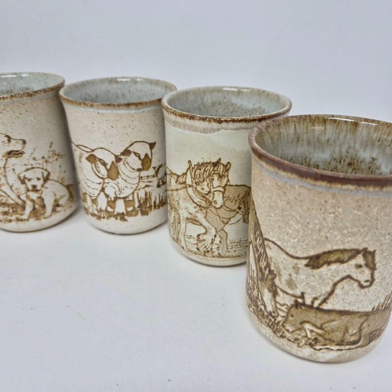 Set of seven Dunoon Ceramics mugs made in Scotland, each featuring rustic farm and countryside illustrations in warm sepia tones. Speckled stoneware glaze with pastoral scenes including horses, cattle, pigs, and rural landscapes. Classic Dunoon craftsmanship with a handmade aesthetic and stamped maker’s mark on the base. Offered as shown; see photos for designs and details. **This lot qualifies for shipping**