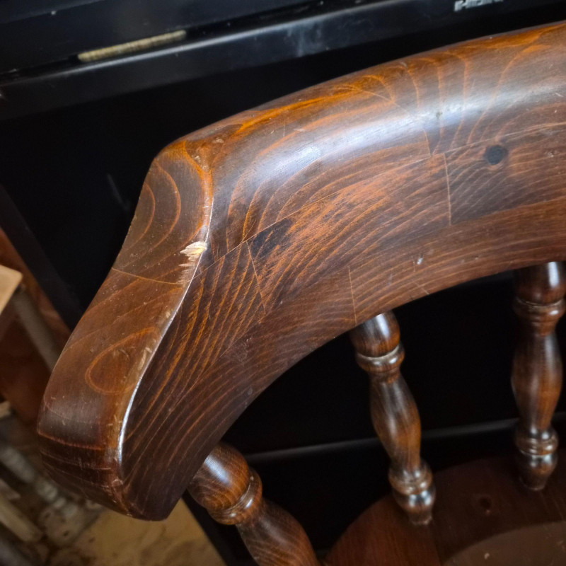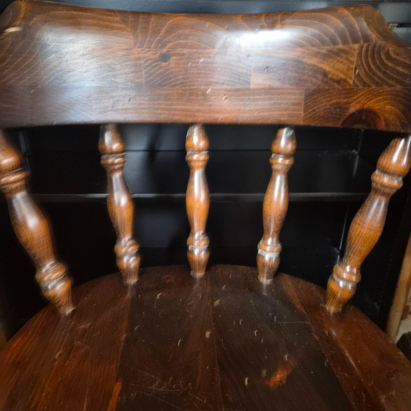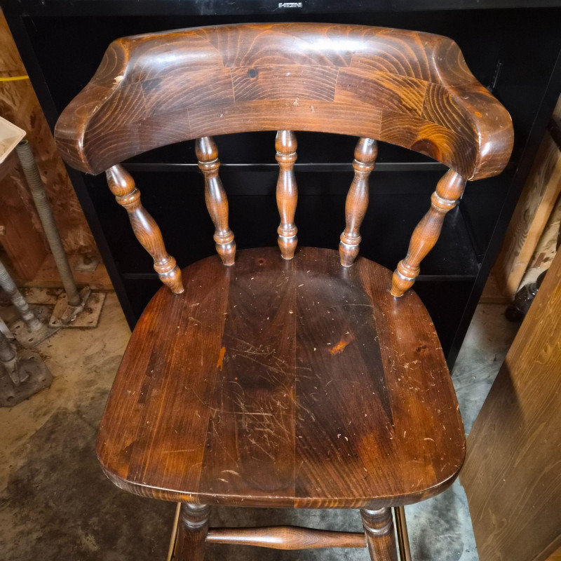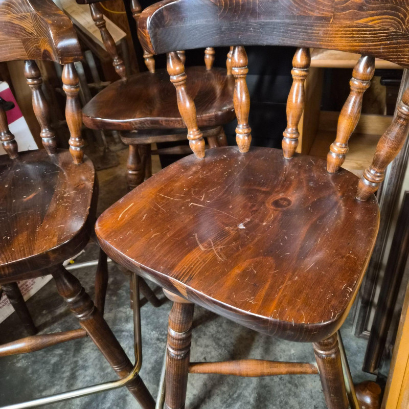 A classic set of three vintage Ethan Allen dark wood bar stools, each built with the brand’s well‑known traditional styling and solid craftsmanship. Two stools currently swivel smoothly; the third will need an adjustment to restore its swivel function. Traditional Colonial / Early American Revival Key Style Features Visible Undersides are stamped with Ethan Allen production numbers: 12 9505 1 90388 and 3 1688, confirming Ethan Allen manufacture. The stools show normal signs of wear and surface scratching consistent with age and use and would benefit from a good cleaning. A timeless set for kitchen islands, home bars, or rustic‑traditional interiors.