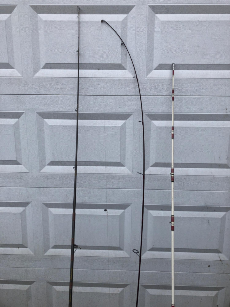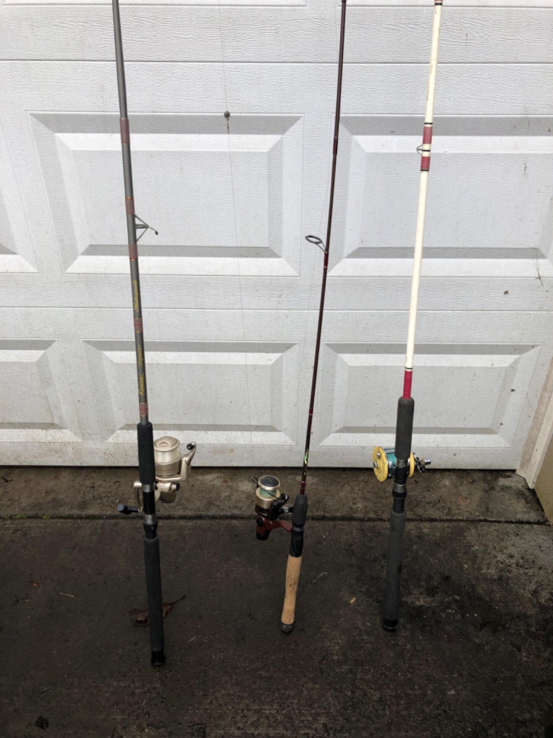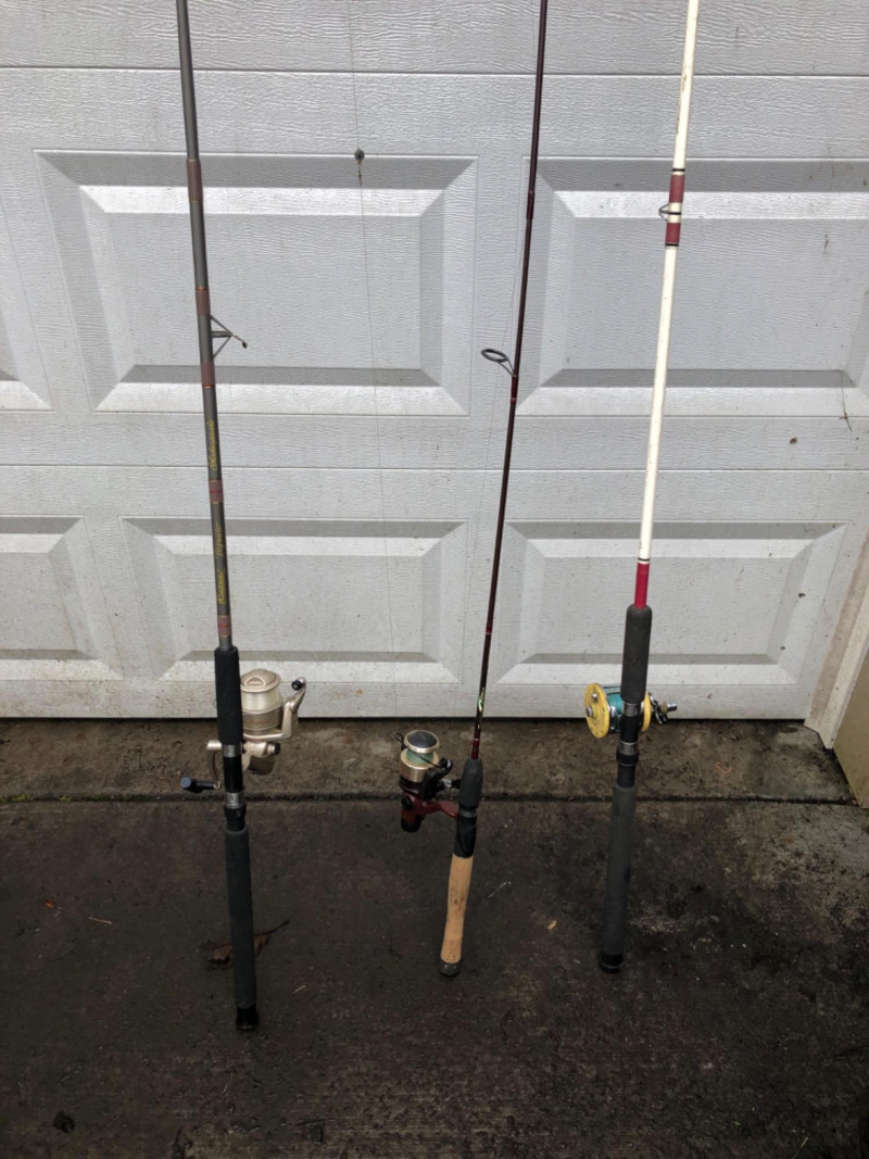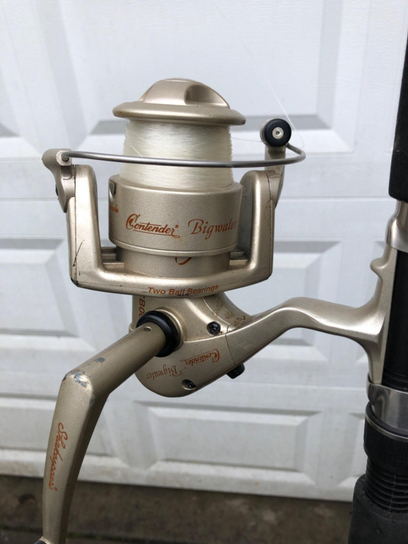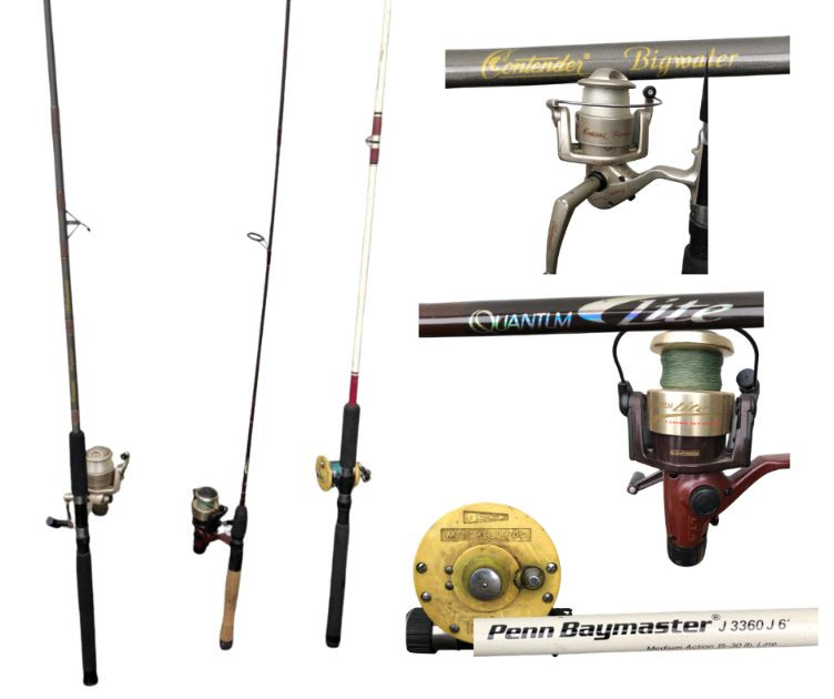 A versatile trio of freshwater/saltwater sport‑fishing rod and reel combinations, ideal for anglers looking for dependable performance across multiple conditions. This set includes a Shakespeare Contender Bigwater rod and reel, a lightweight Quantum Lite graphite setup, and a classic Penn Baymaster paired with a Mitchell 602 Garcia France reel. All rods and reels show normal use consistent with active fishing but remain functional and ready for the water. Shakespeare Contender® Bigwater 7 Foot Rod & Reel Matching Contender Bigwater spinning reel Built for strength and durability in larger freshwater or light saltwater applications Rod length approx. 7' Quantum Lite Graphite 7 Foot Rod with Quantum Lite Long Stroke LT4 Reel Lightweight graphite construction for sensitivity and control Quantum Lite LT4 reel known for smooth long‑stroke casting Ideal for lake and river fishing Penn Baymaster® J 3360 J Rod with Mitchell 602 Garcia France Reel Rod marked Medium Action – 15–30 lb line, 6 Feet long Classic Mitchell 602 reel, made in France A sturdy, reliable setup for heavier freshwater species A great multi‑purpose bundle for anglers, collectors, or anyone wanting ready‑to‑use gear with trusted brand names.Included: