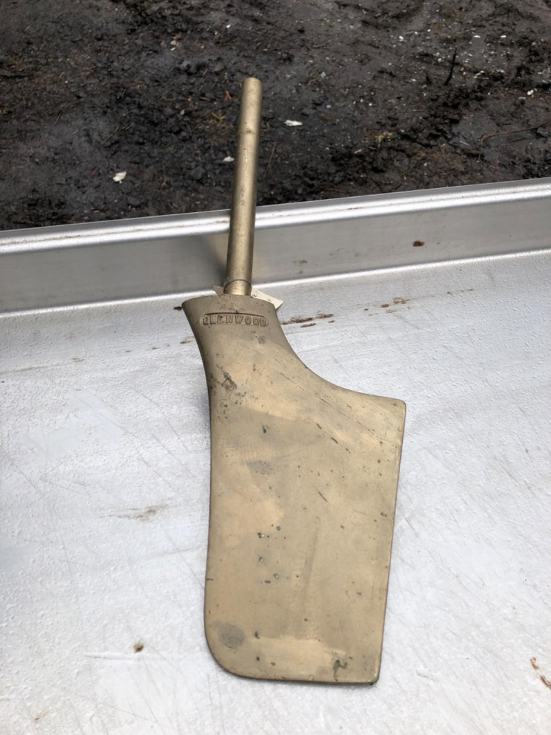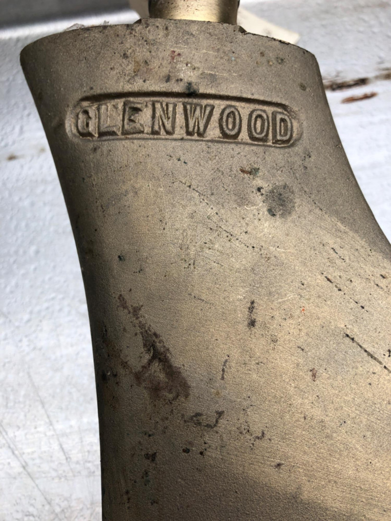 Set of two bronze (or brass‑alloy) marine 14 inch propellers paired with a Glenwood 24 inch bronze rudder. Propellers feature classic three‑blade design with tapered hubs; both show age, patina, and surface wear consistent with long‑term storage. Glenwood rudder is solid bronze with smooth blade and cylindrical stock, suitable for restoration, parts, or nautical décor.