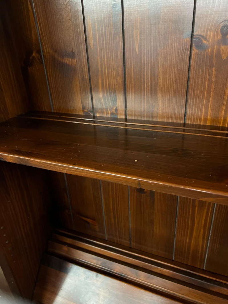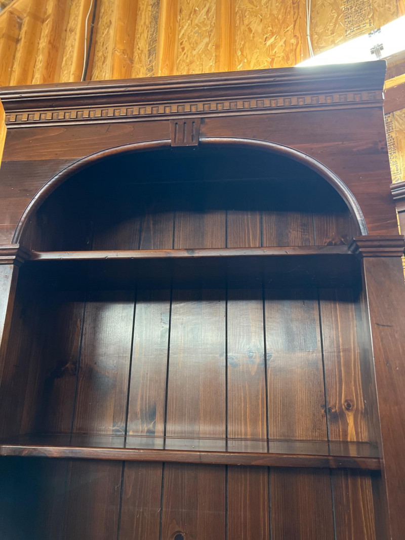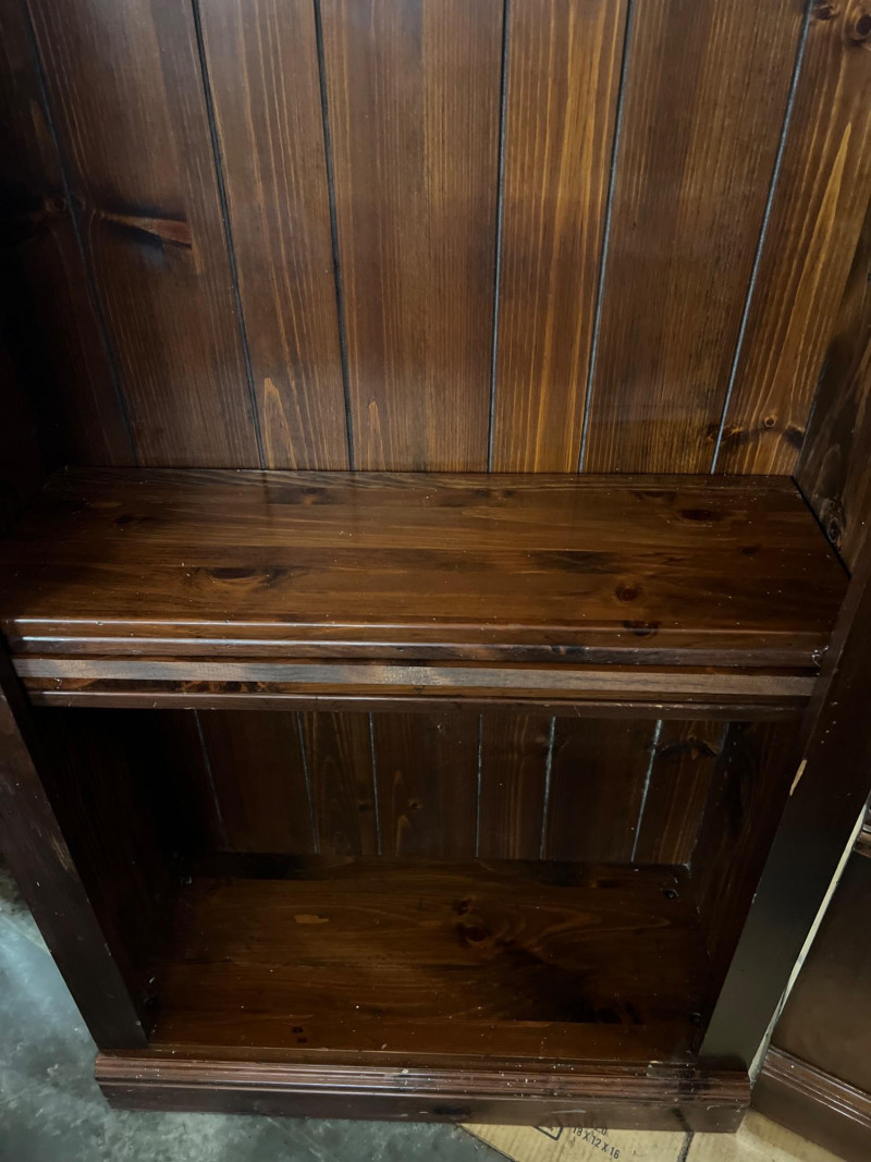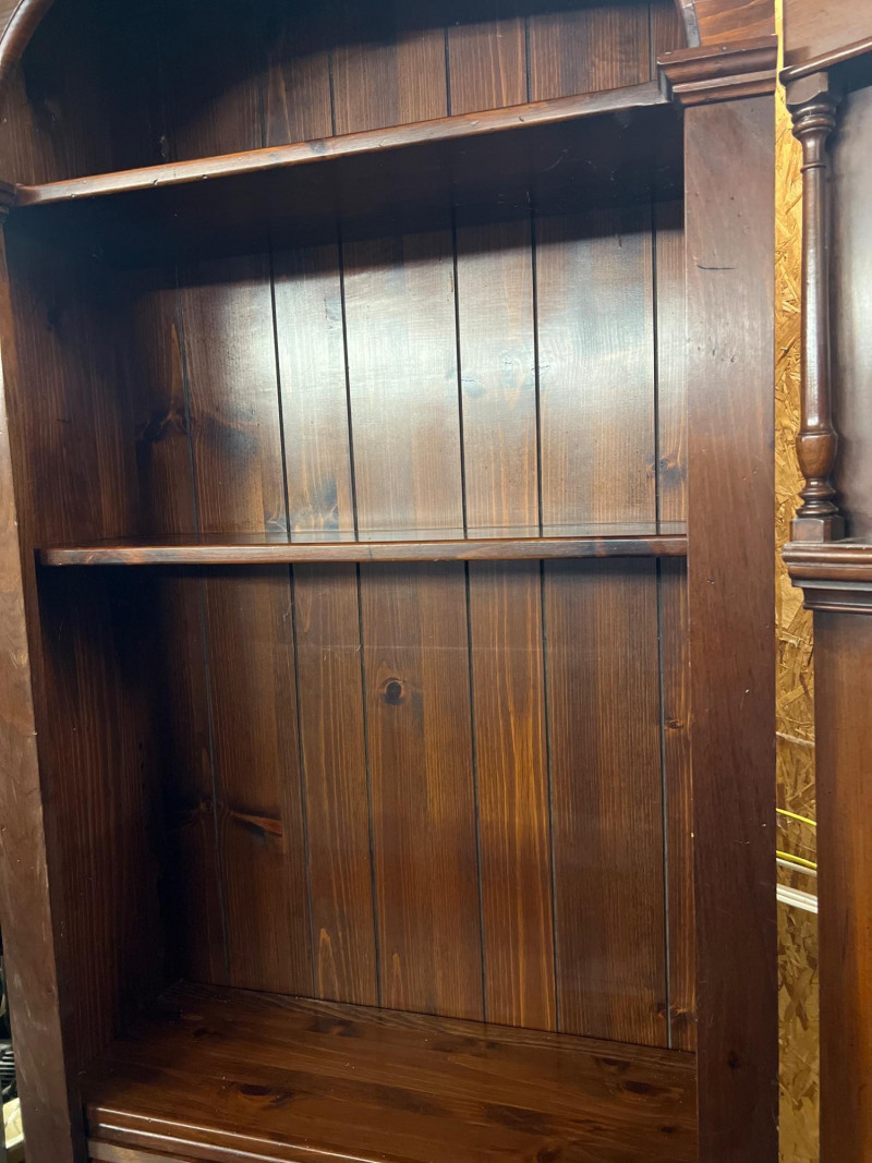 Pair of Ethan Allen–style wooden bookcases with arched bonnet tops, carved center medallions, and vertical paneled backs. Each case features three fixed shelves and four additional adjustable shelves and a warm traditional finish consistent with Ethan Allen’s Early American and Georgian Revival collections. Solid, substantial construction suitable for display, books, or décor.