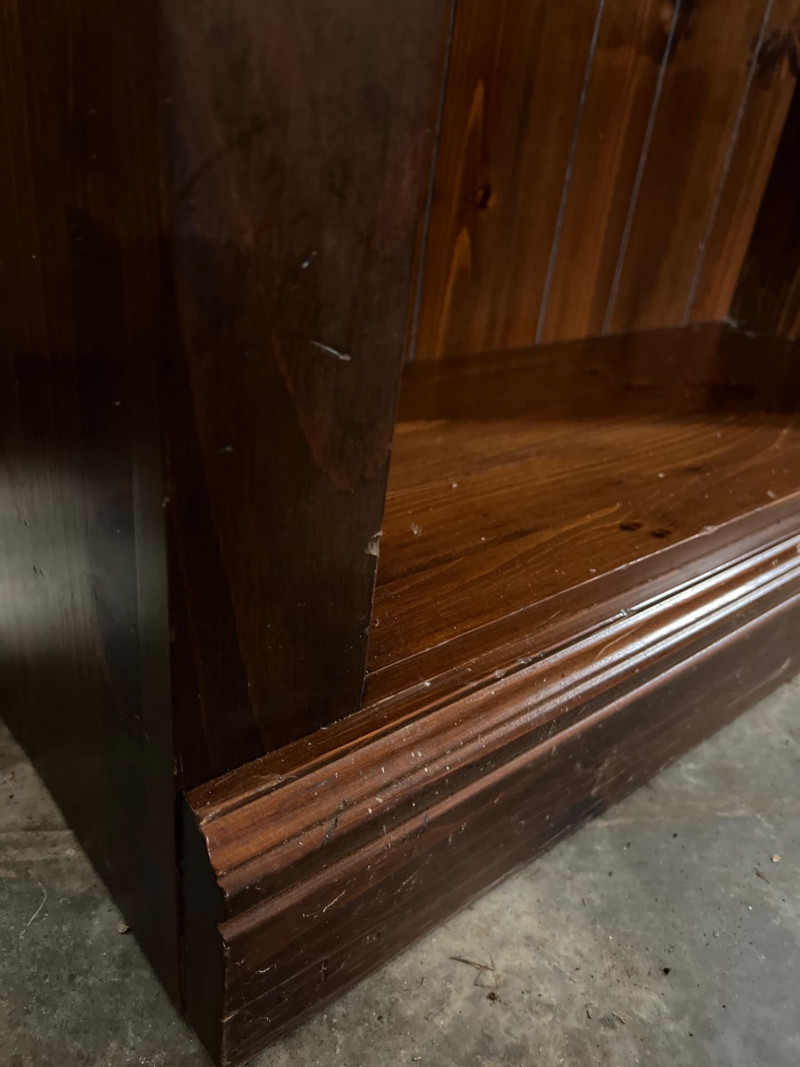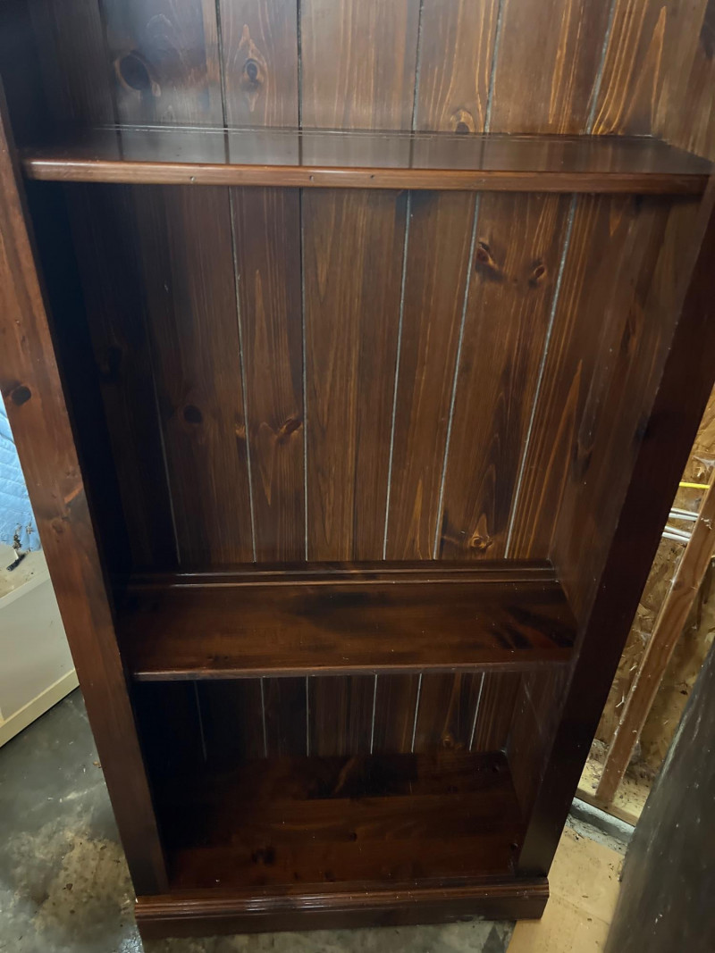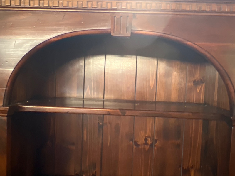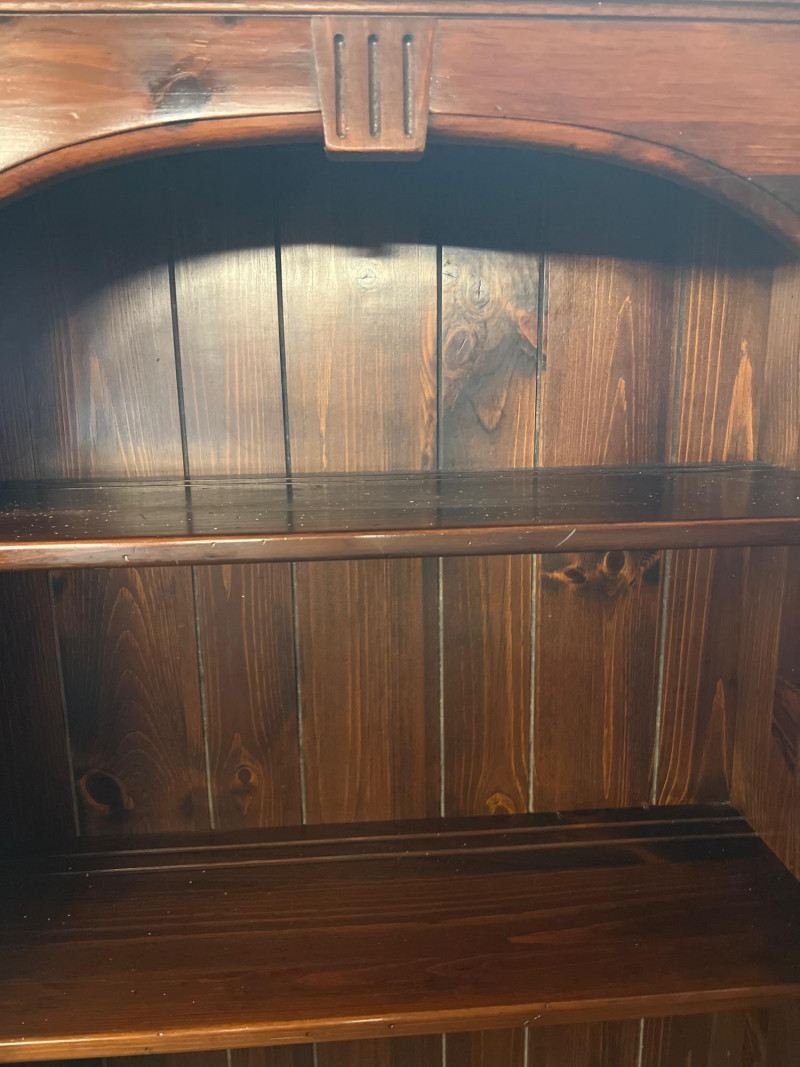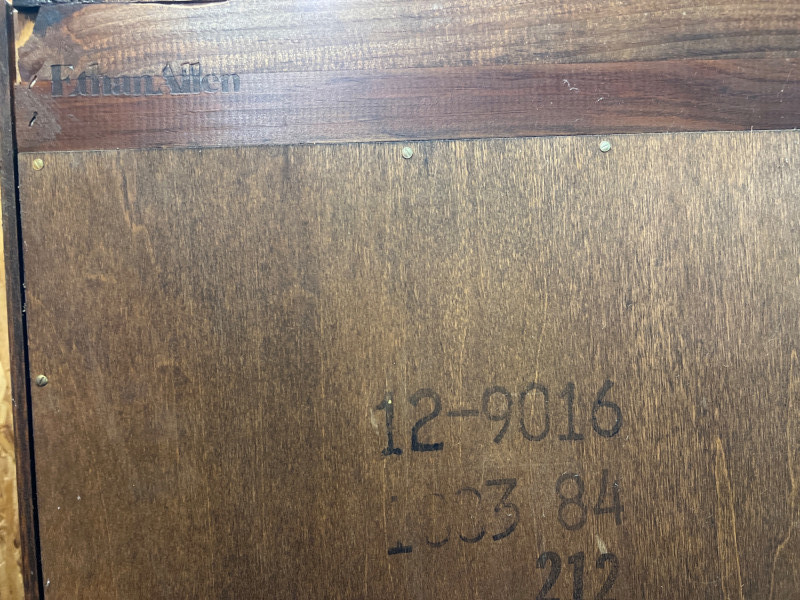 Pair of Ethan Allen–style wooden bookcases with arched bonnet tops, carved center medallions, and vertical paneled backs. Each case features three fixed shelves and four additional adjustable shelves and a warm traditional finish consistent with Ethan Allen’s Early American and Georgian Revival collections. Solid, substantial construction suitable for display, books, or décor.