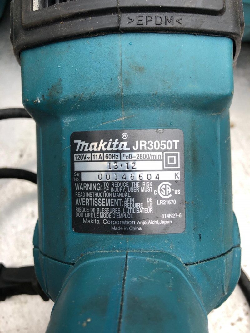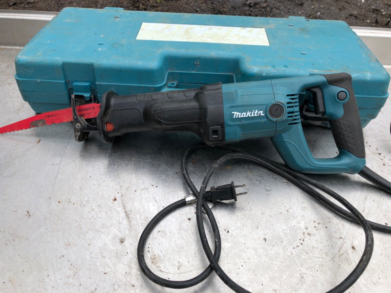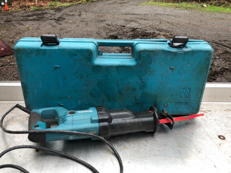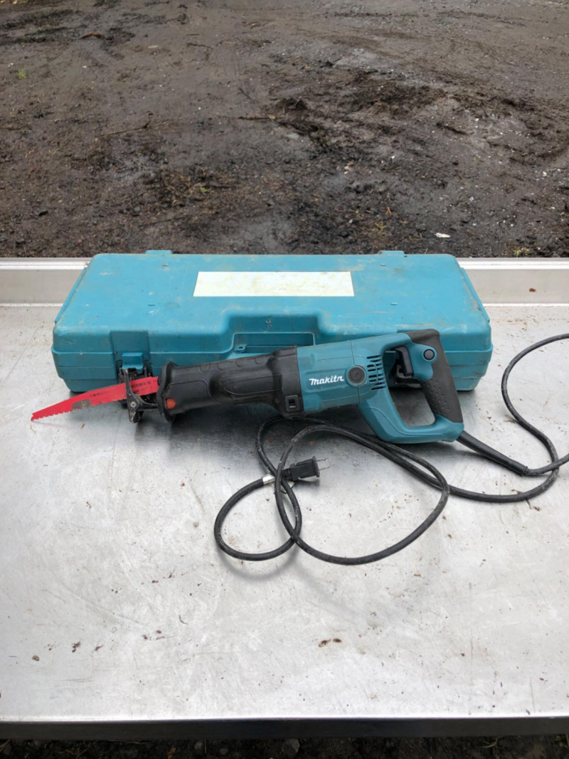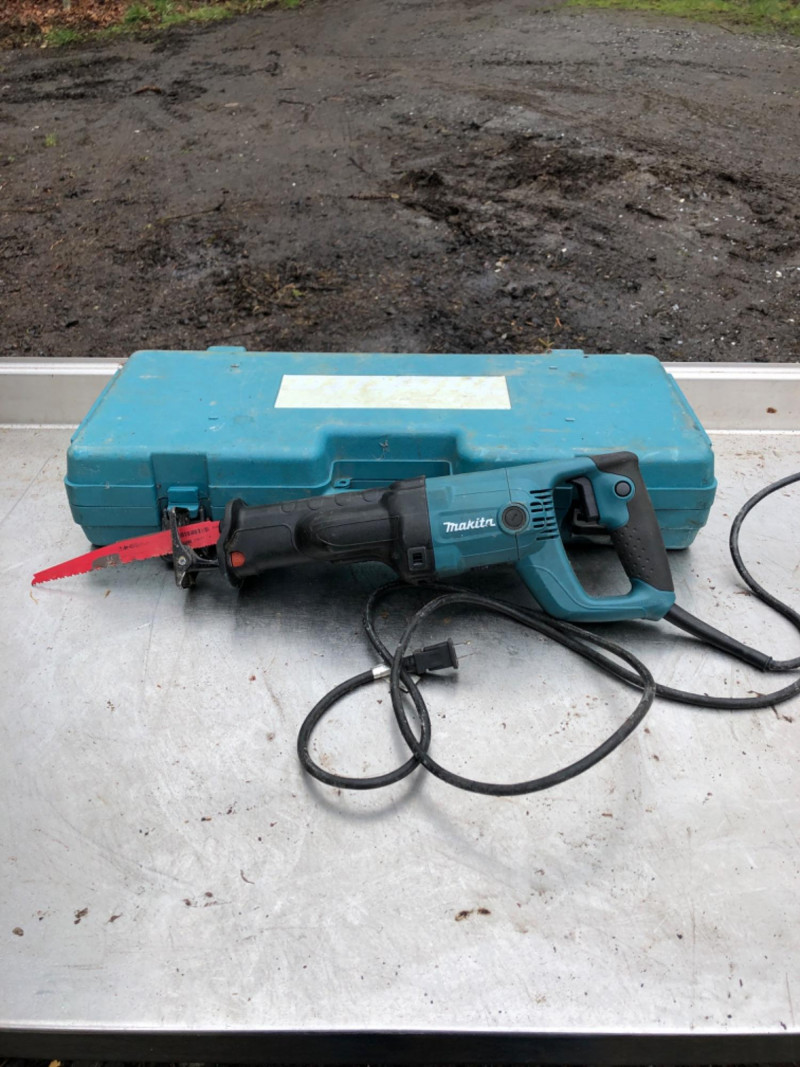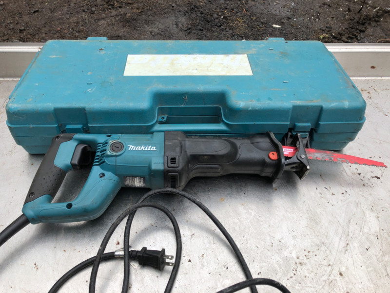Makita JR3050T reciprocating saw, a solid corded power tool ideal for demolition, construction, and general cutting tasks. This model features an 11‑amp motor with a variable speed range of 0–2800 strokes per minute, giving it the power and control needed for wood, metal, and plastic cutting. The saw includes: Makita’s JR3050T line is known for durability, straightforward maintenance, and dependable performance on job sites and in home workshops. Shows normal wear from use but appears complete.