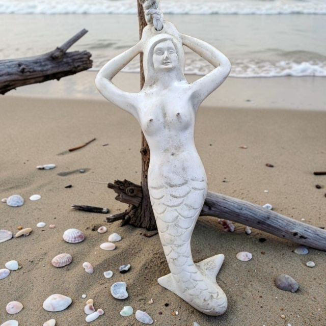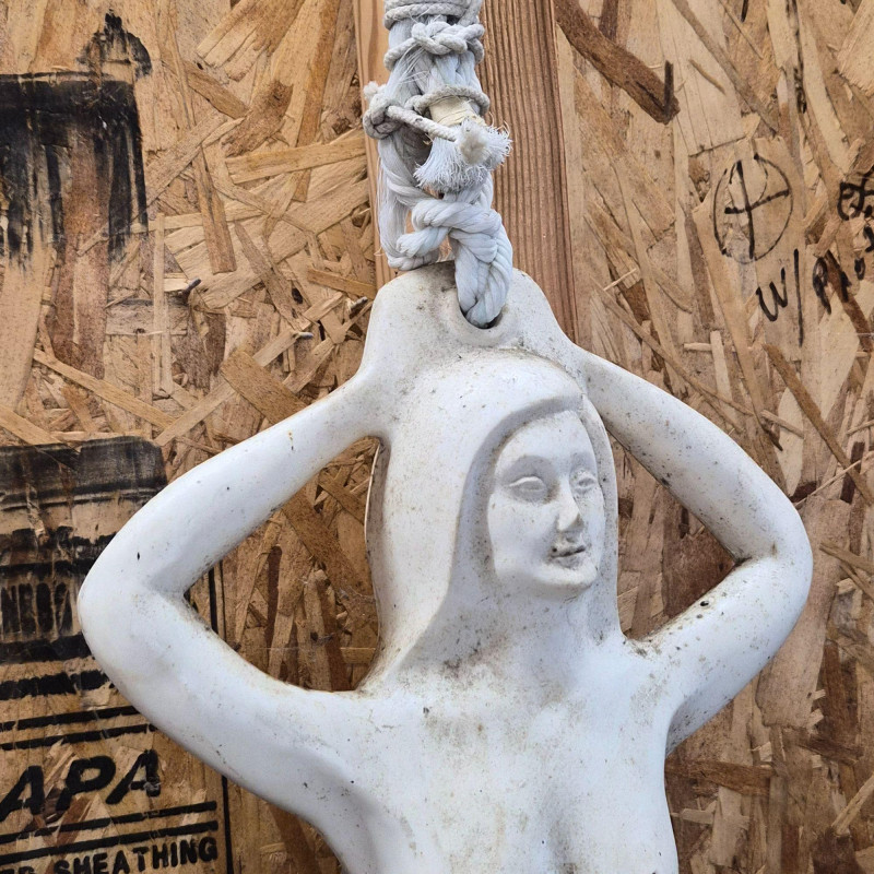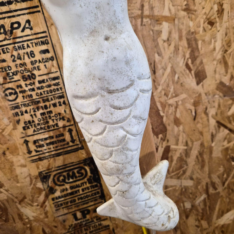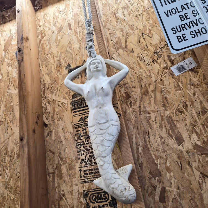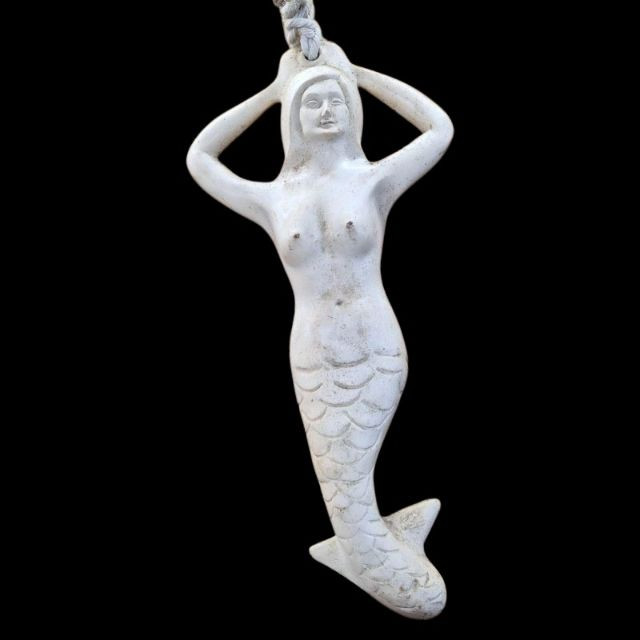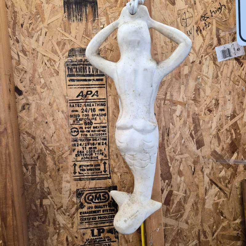 A unique sculptural mermaid‑shaped rubber buoy manufactured by N.A. Taylor & Co., Inc. This whimsical nautical piece measures 22 inches long and features a stylized mermaid form crafted in durable molded rubber. It comes attached to a long rope, as originally designed for functional marine use. Whether displayed as coastal décor, added to a maritime collection, or used as a conversation‑starting accent piece, this buoy blends utility with playful seaside charm. A rare find for collectors of nautical gear, folk‑art‑style marine items, or anyone who loves ocean‑themed décor.