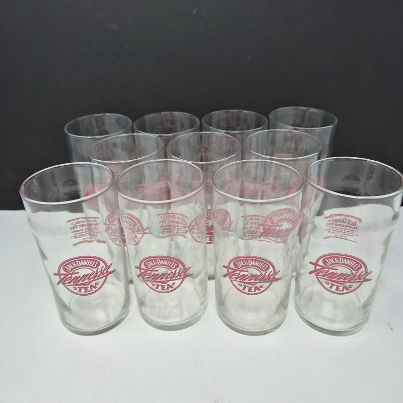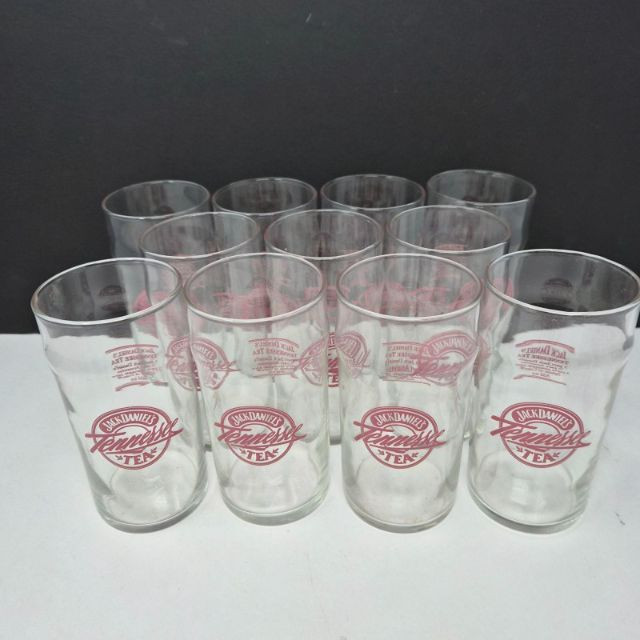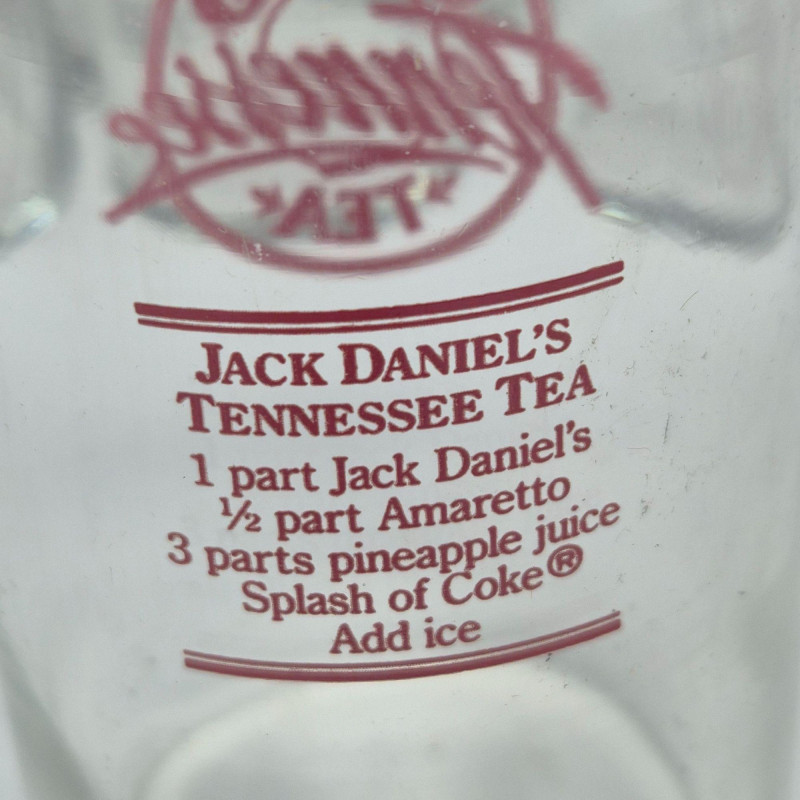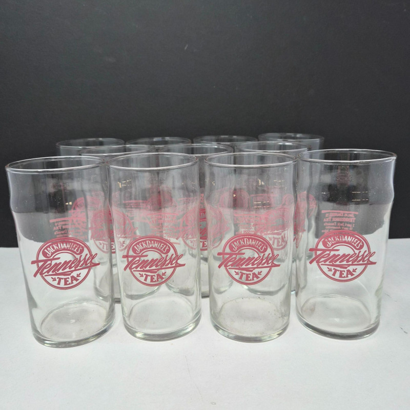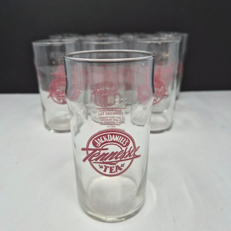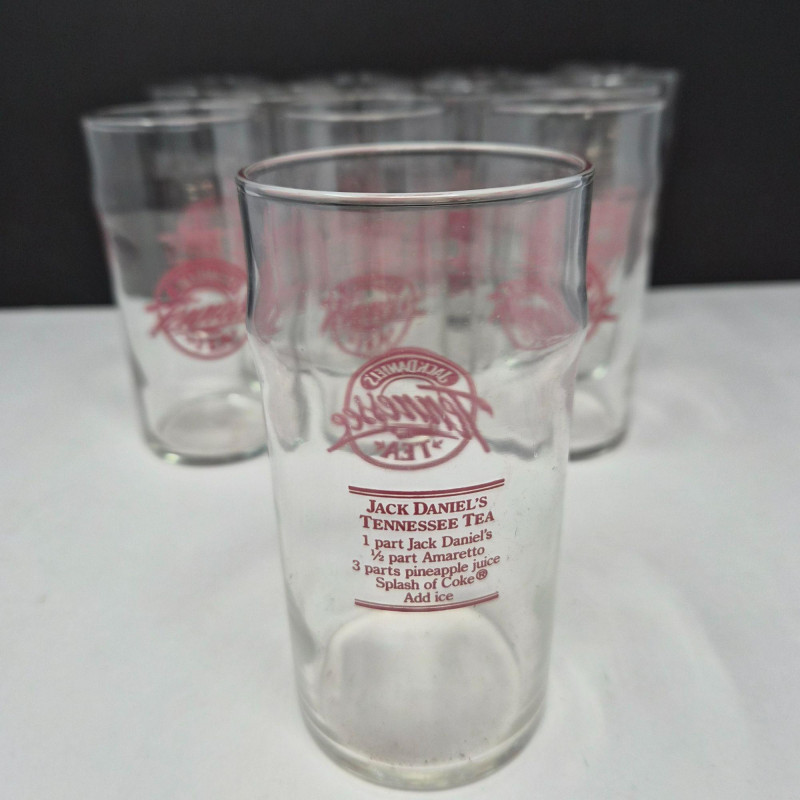 Set of eleven vintage Jack Daniel’s “Tennessee Tea” drinking glasses, each featuring the bold red Jack Daniel’s Tennessee Tea logo on the front and the original cocktail recipe printed on the back. These clear glass tumblers were produced as promotional barware and are now popular collectibles among Jack Daniel’s fans and vintage advertising enthusiasts. Design & Features: Collectibility: Packaging: