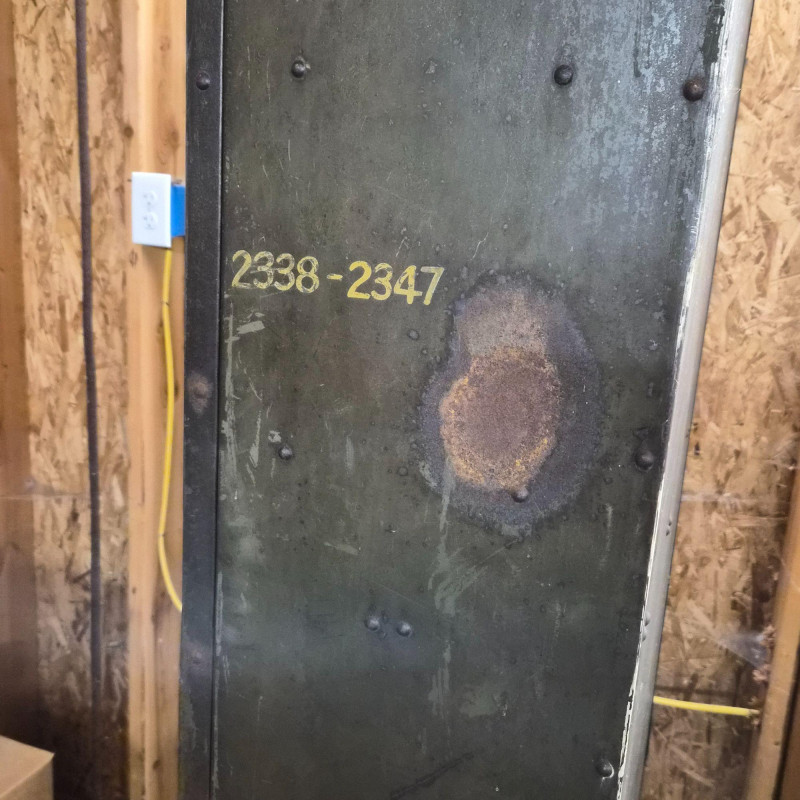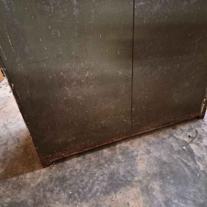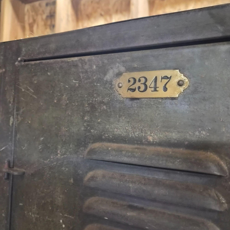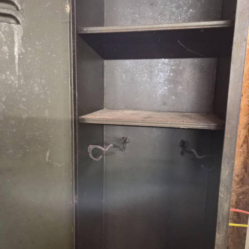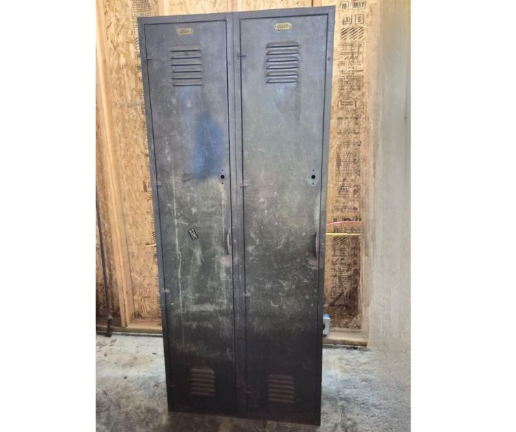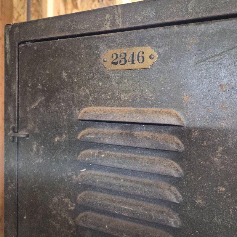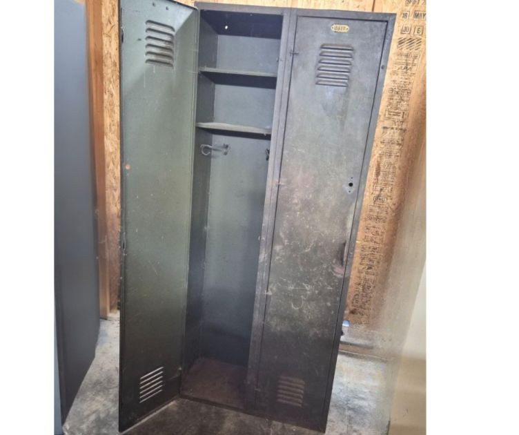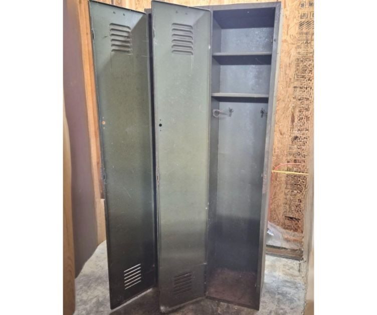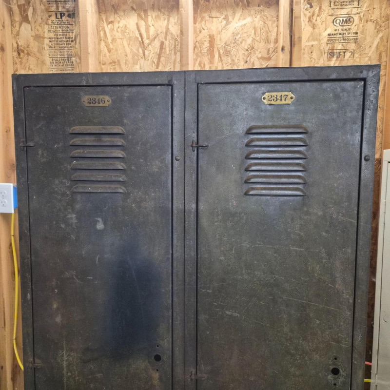 Pair of connected vintage metal lockers in an army‑greenfinish, each with original vented doors and numbered plates 2346and 2347. Interior includes upper shelving and hanging hooks, with wear consistent with age and shop or school use. Solid steel construction with a classic industrial look, ideal for storage, décor, or workshop organization. Presented as found; see photos for condition and interior layout.