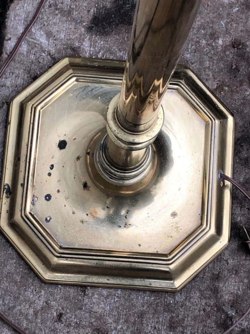 Vintage polished brass torchiere‑style floor lamp in Hollywood Regency / Neoclassical Revival design. Features a flared trumpet‑form top, tall slender column, and octagonal stepped base. Classic 1970s decorative brass lighting with warm reflective finish. Lamp is in working condition. Offered as shown; see photos for patina and overall condition.