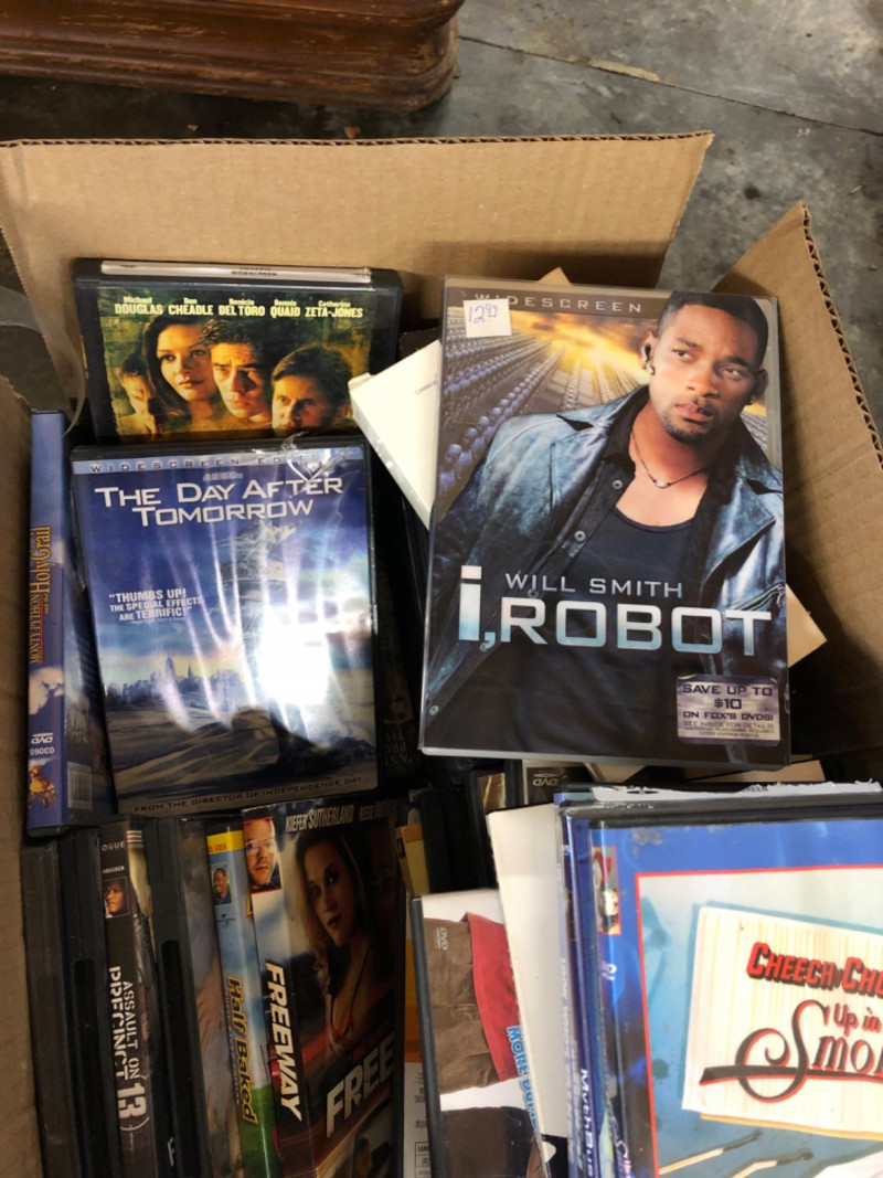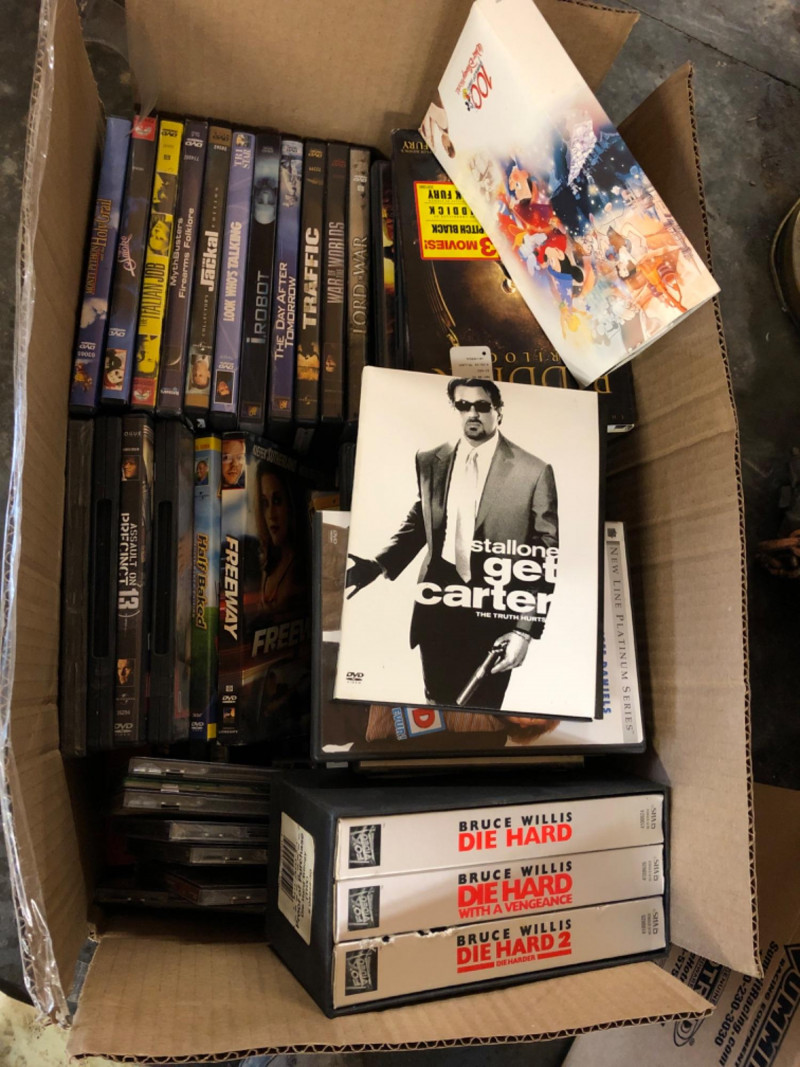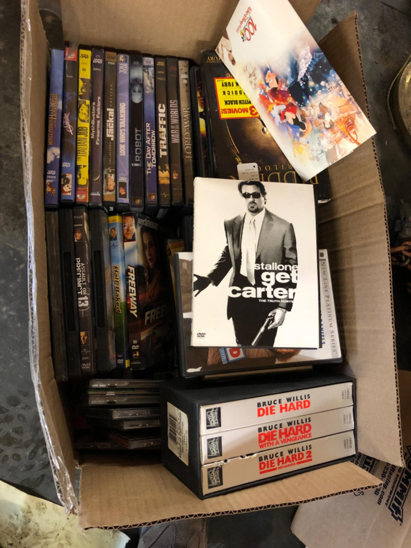 Box filled with a variety of DVDs, CDs, and VHS tapes, including action, drama, and classic titles. Visible films include Get Carter, Traffic, I, Robot, The Day After Tomorrow, Lord of War, and others, along with three Die Hard VHS tapes. Mix of genres and formats; discs and tapes show typical wear from use and storage. Great bulk lot for collectors, resellers, or media enthusiasts. Contents include additional titles not visible in photos.