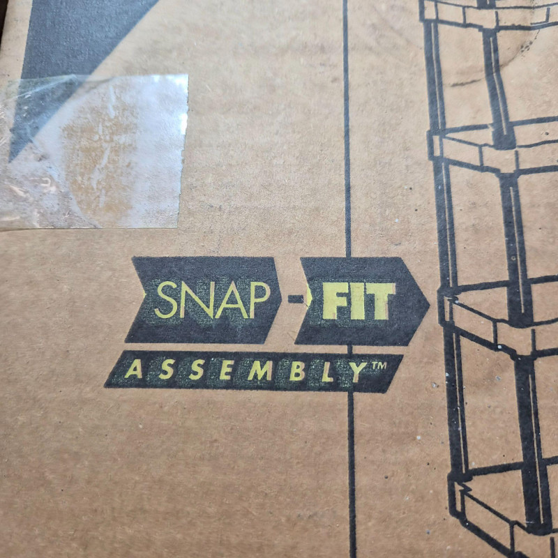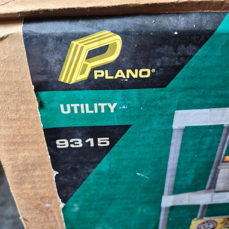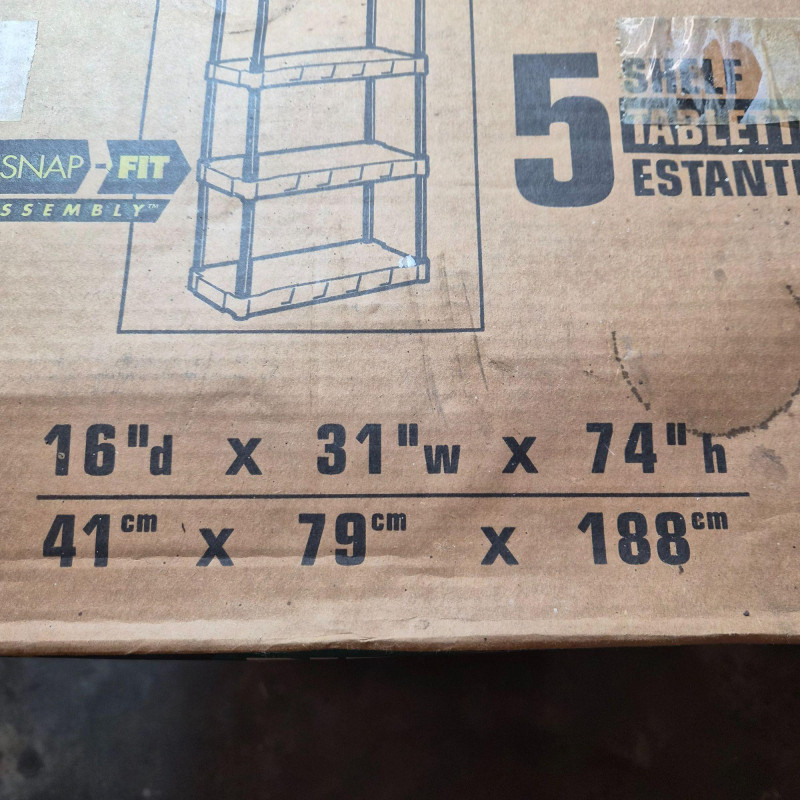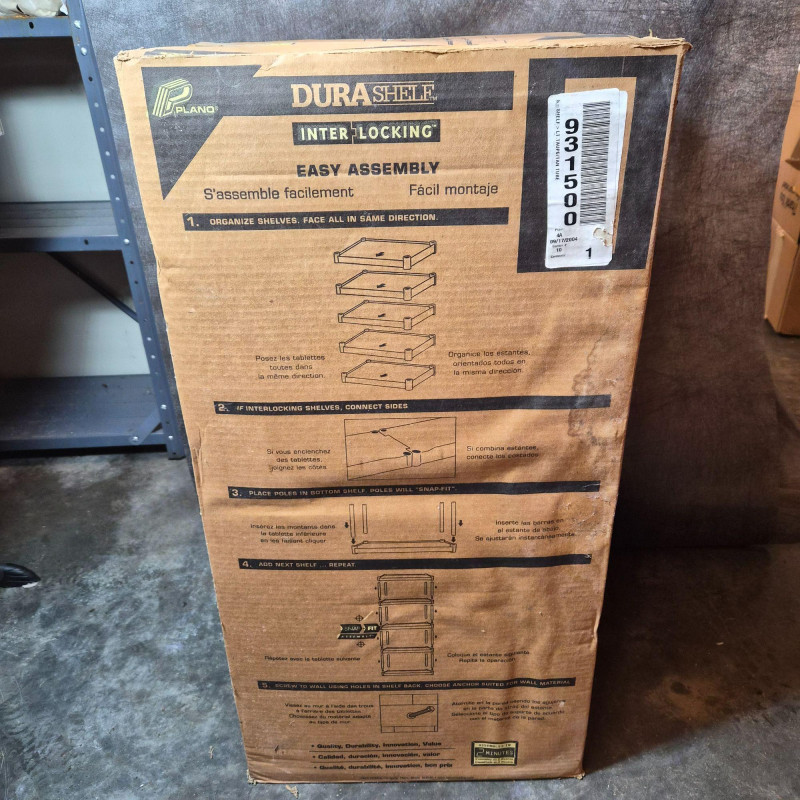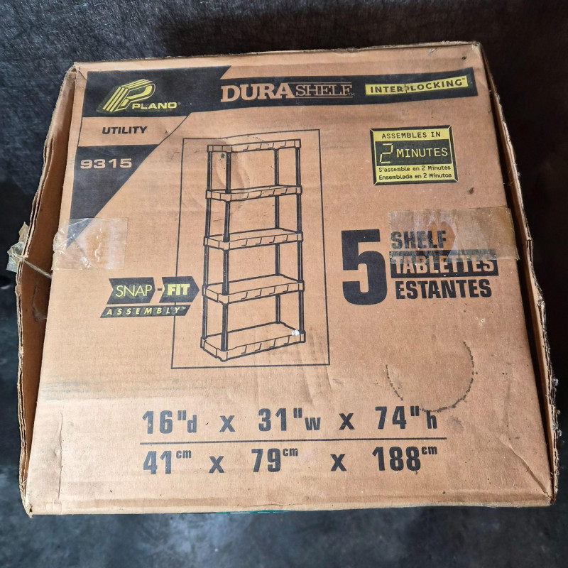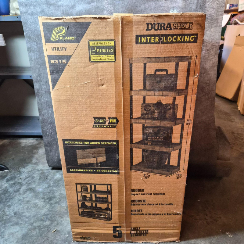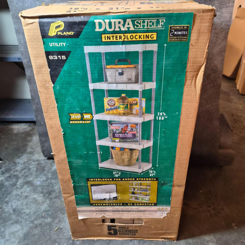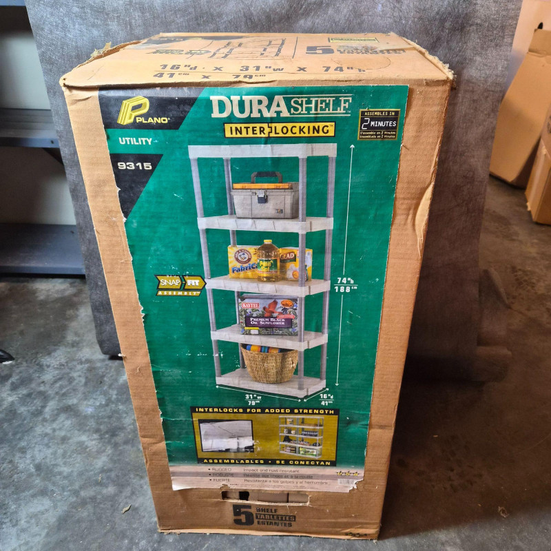 NIB. Durable DuraShelf Interlocking storage unit featuring five plastic shelves and an easy snap‑fit assembly design—no tools required. This lightweight yet sturdy shelving system is ideal for garages, basements, workshops, utility rooms, or pantry storage. The unit measures approximately 74" tall x 31" wide x 16" deep, offering generous vertical storage in a compact footprint. Interlocking components provide added stability, and the plastic construction resists moisture, rust, and corrosion—perfect for long‑term household or utility use. Packaging shows handling wear, but the shelving components appear complete based on the boxed contents.