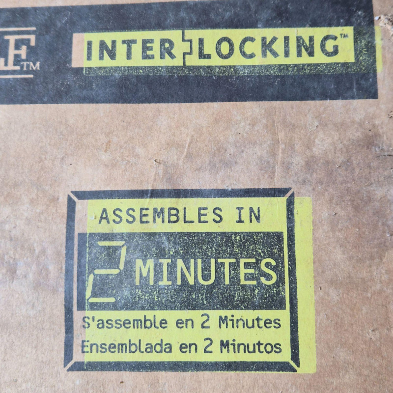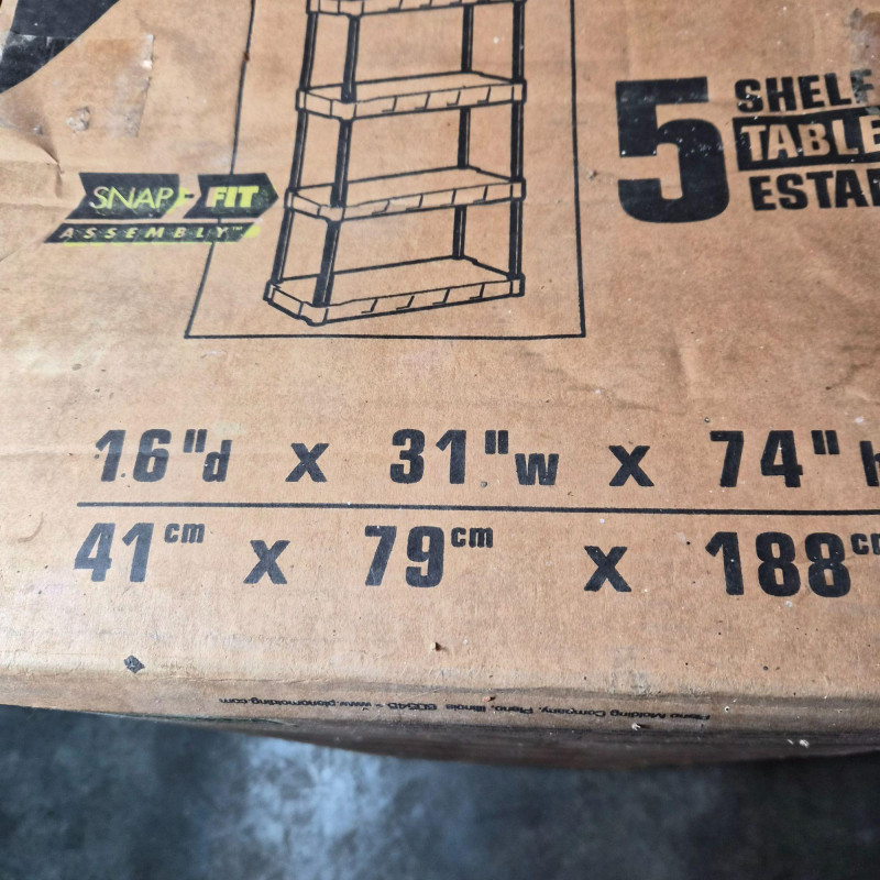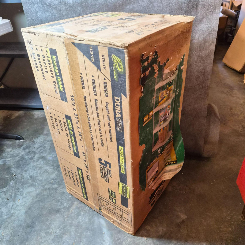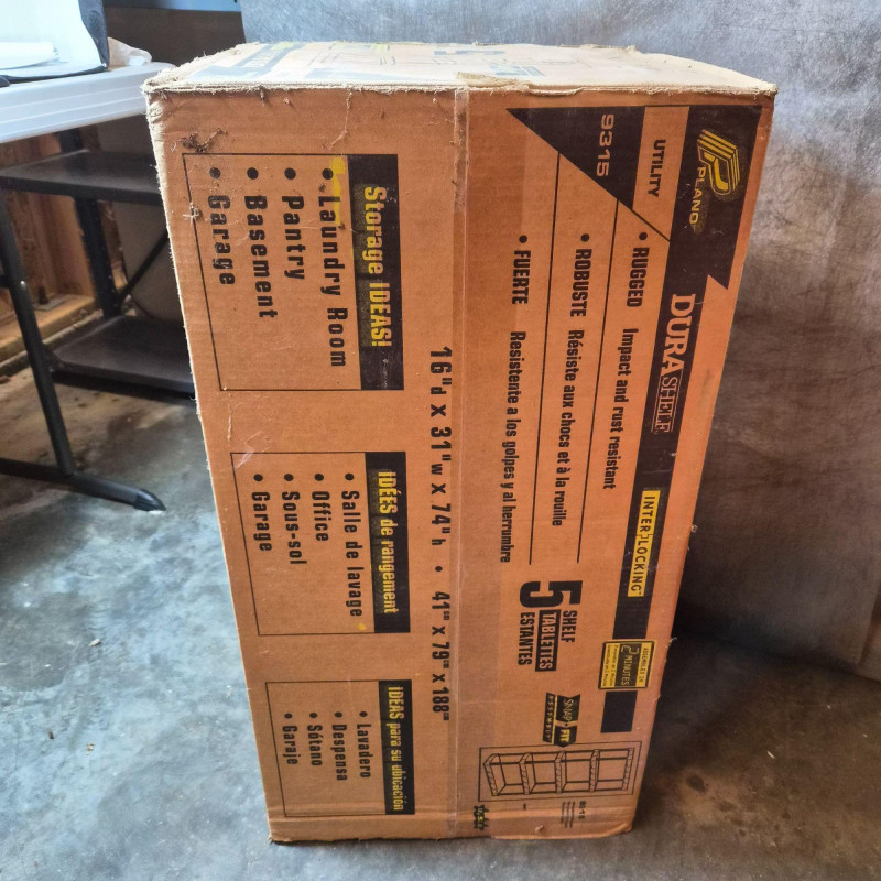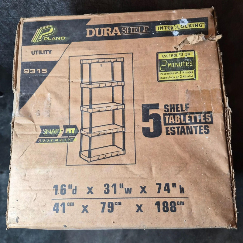 New in box. Durable DuraShelf Interlocking storage unit featuring five plastic shelves and an easy snap‑fit assembly design—no tools required. This lightweight yet sturdy shelving system is ideal for garages, basements, workshops, utility rooms, or pantry storage. The unit measures approximately 74" tall x 31" wide x 16" deep, offering generous vertical storage in a compact footprint. Interlocking components provide added stability, and the plastic construction resists moisture, rust, and corrosion—perfect for long‑term household or utility use. Packaging shows handling wear, but the shelving components appear complete based on the boxed contents.