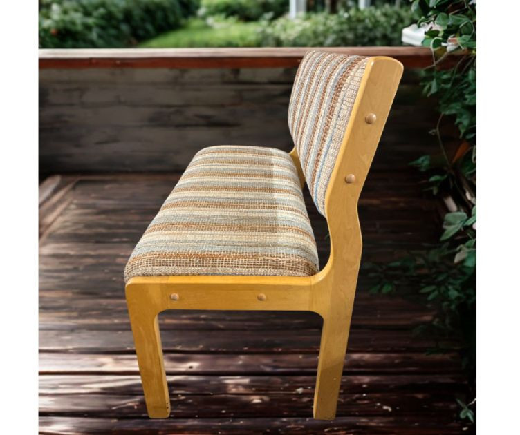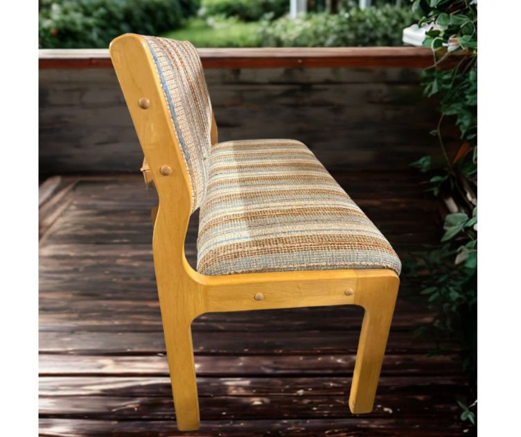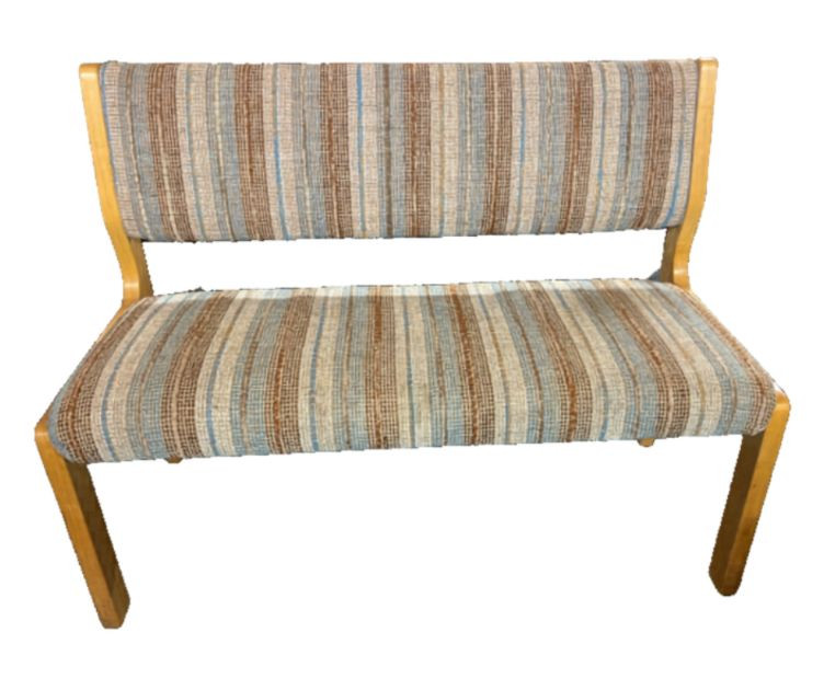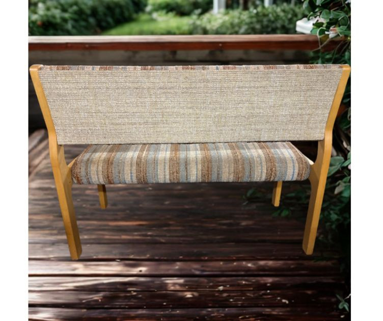 Modern‑retro Daystrom Furniture bench featuring a vertically striped upholstered seat and backrest in earth‑tone shades of brown, beige, and muted blue. The fabric brings a warm, grounded palette with just enough color variation to feel lively without overwhelming a space. The bench sits on a light wood frame with gently curved legs and a slightly angled back, giving it a soft, sculptural silhouette. Its minimalist profile and compact footprint make it ideal for entryways, waiting areas, bedrooms, or office seating. A versatile accent piece with a relaxed mid‑century influence and Daystrom’s signature sturdy construction.