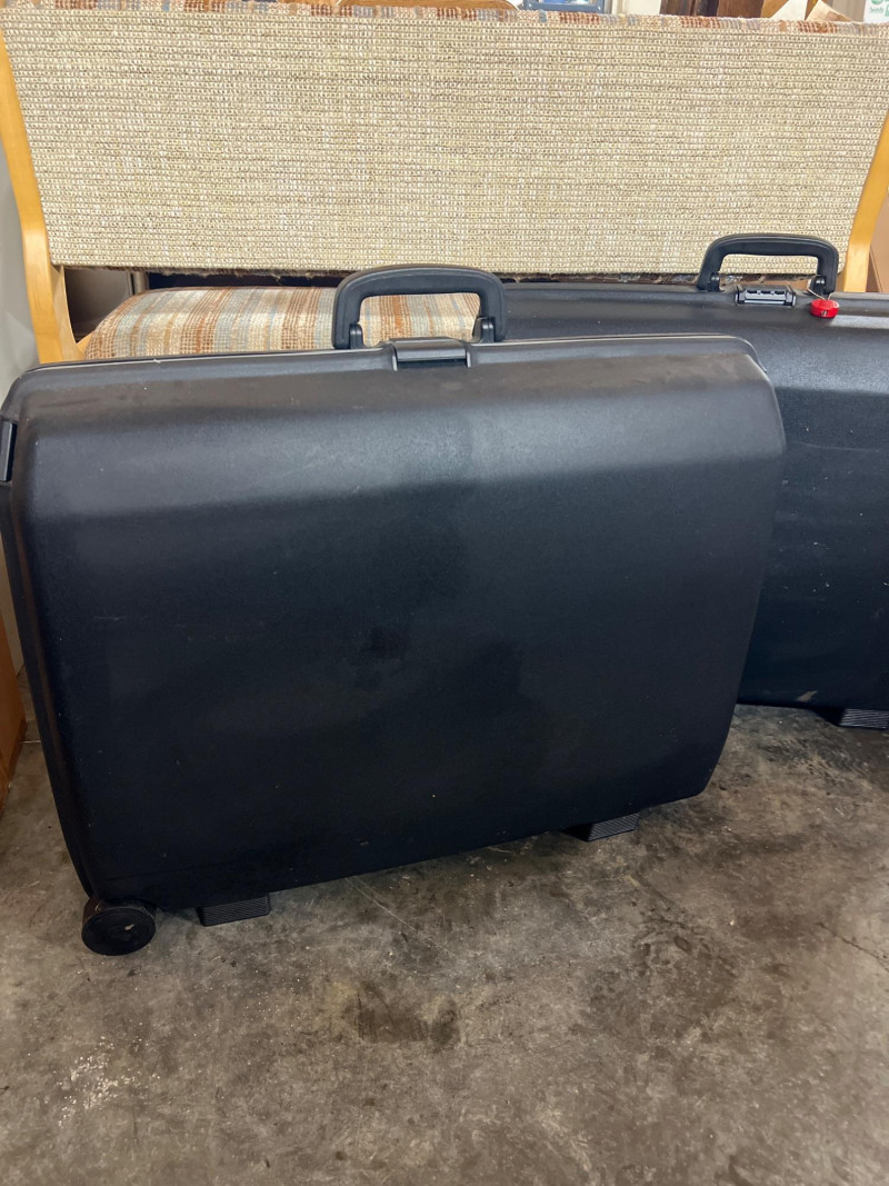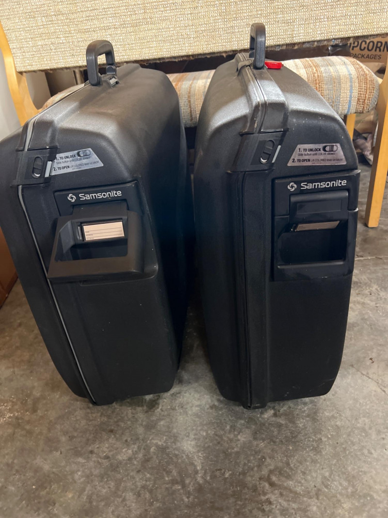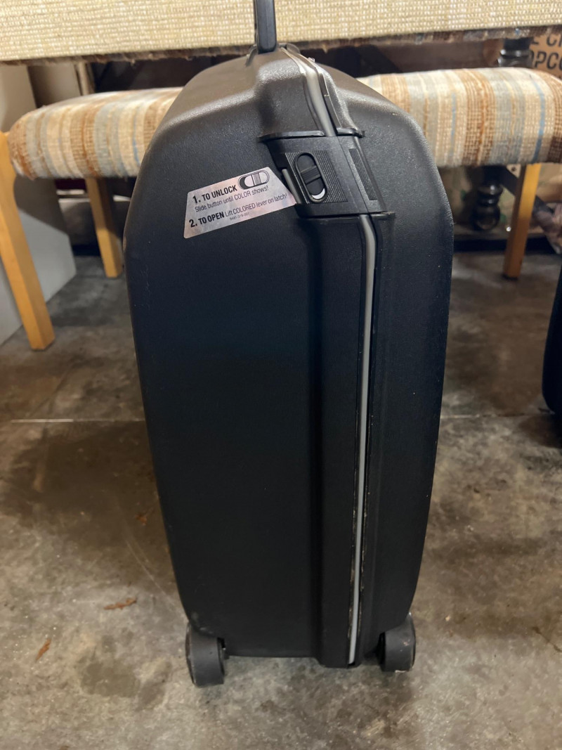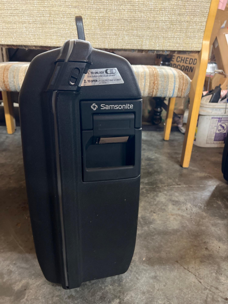 Pair of 1994 Samsonite Estes hardshell rolling suitcases in classic black. Made in the USA, this line is known for its durable molded shells, reinforced edges, and smooth‑rolling wheels designed for heavy travel use. Both cases include pull handles, interior straps, and original hardware. Light to moderate wear from age and storage. A solid, collectible Samsonite set from the mid‑1990s — ideal for travel, prop use, or vintage luggage enthusiasts.