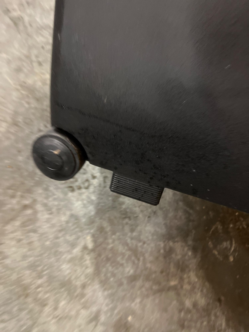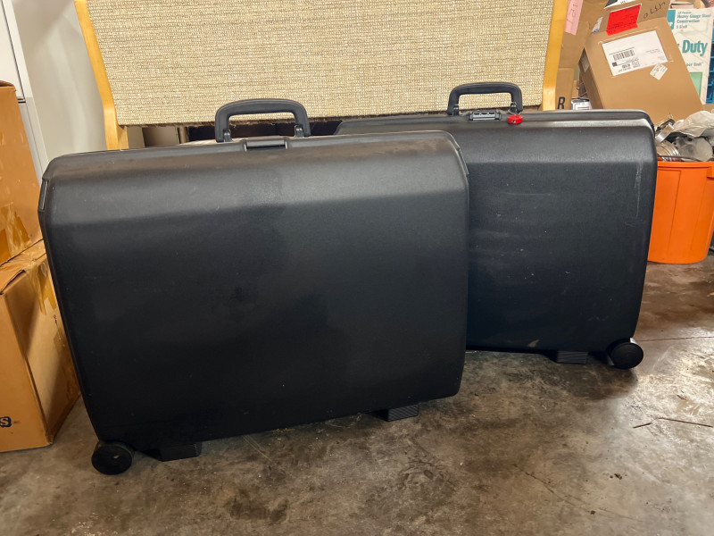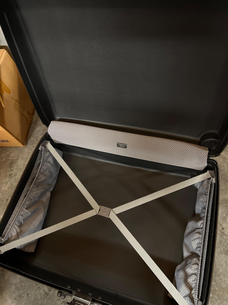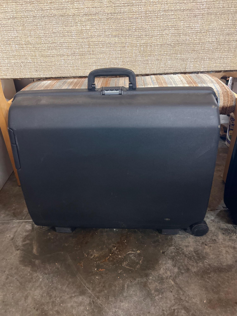 Pair of 1994 Samsonite Estes hardshell rolling suitcases in classic black. Made in the USA, this line is known for its durable molded shells, reinforced edges, and smooth‑rolling wheels designed for heavy travel use. Both cases include pull handles, interior straps, and original hardware. Light to moderate wear from age and storage. A solid, collectible Samsonite set from the mid‑1990s — ideal for travel, prop use, or vintage luggage enthusiasts.