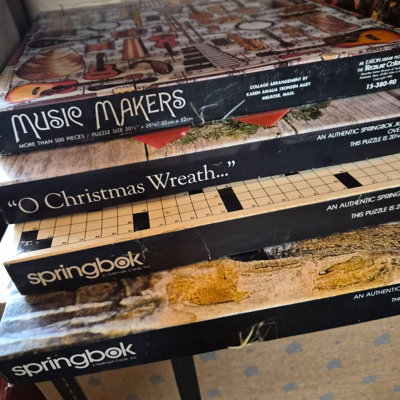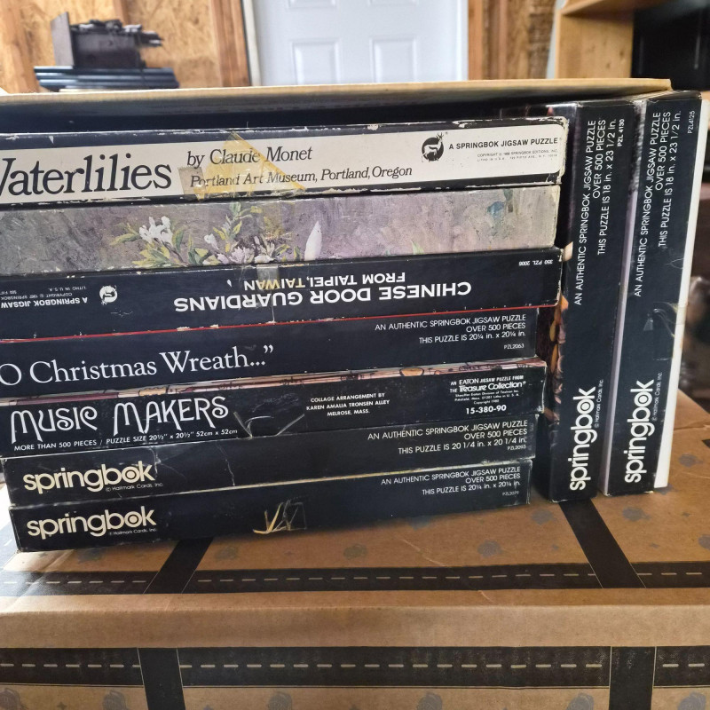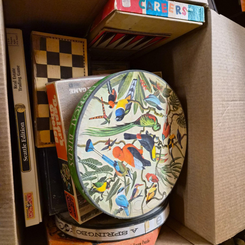 Three boxes of various board and card games including a box of Springbok puzzles and more.