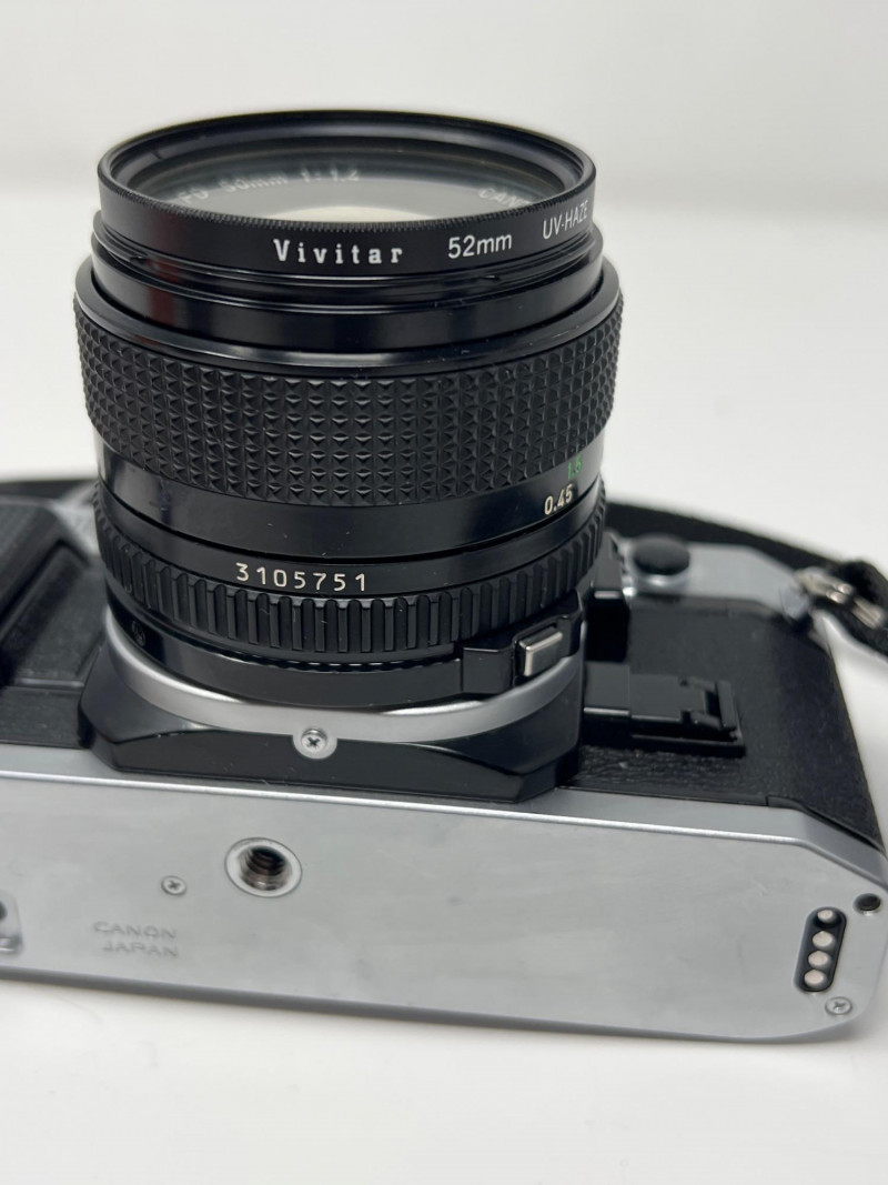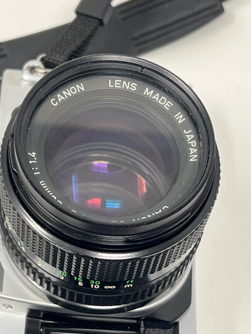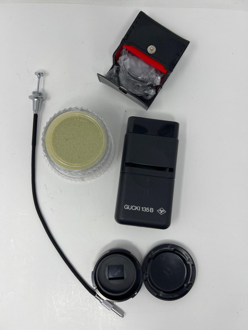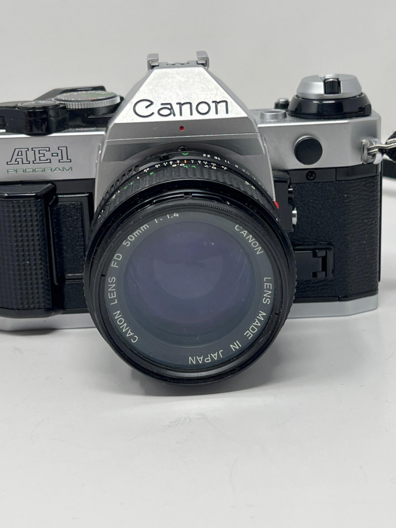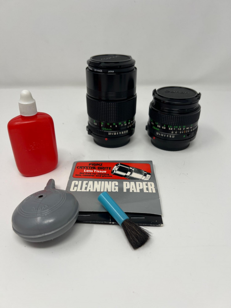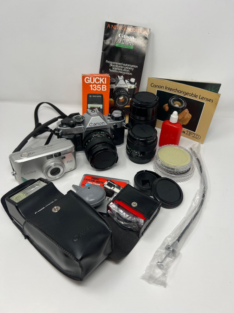 Collection of vintage Canon film photography gear including a Canon AE‑1 Program 35mm SLR, three Canon FD lenses, a Canon SureShot Z155, and multiple accessories. The lot includes a Canon flash unit, shutter release cable, lens caps, cleaning supplies, manuals, and additional third‑party items such as a GUCKI 135B flash and PRINZ filter. Condition varies; cameras and lenses are untested. A strong bundle for collectors, film shooters, or restoration enthusiasts. Canon AE‑1 Program 35mm SLR Three Canon FD‑mount lenses Canon SureShot Z155 compact film camera (powers on, flash unit works) Canon flash unit in case GUCKI 135B electronic flash (boxed) PRINZ Crystal‑Route filter Shutter release cable Lens caps, cleaning items, manuals, and assorted accessories Light wear consistent with age and storage. Sold as‑is.Included: