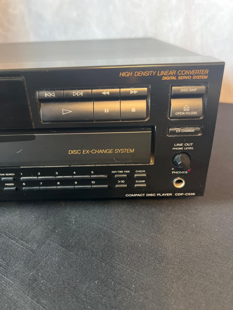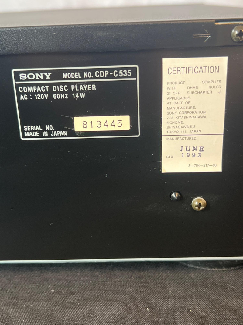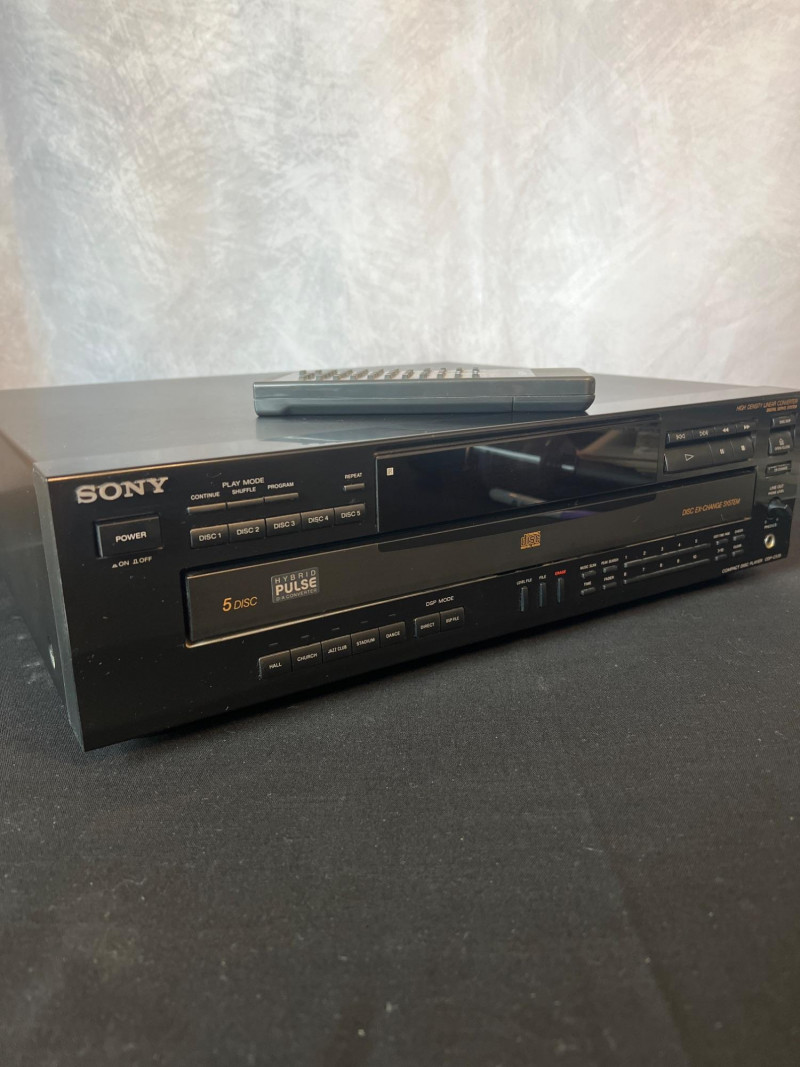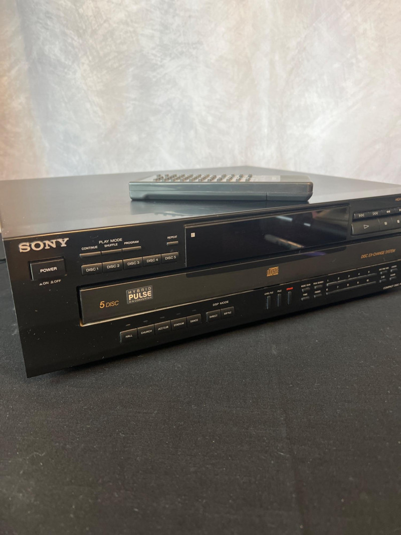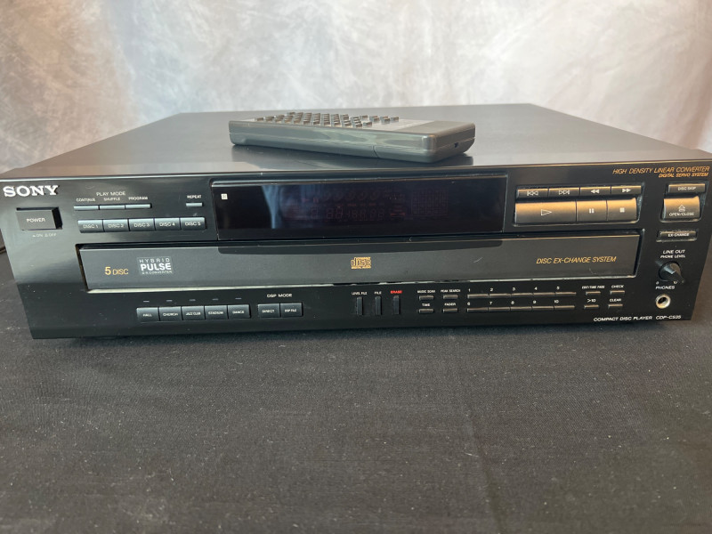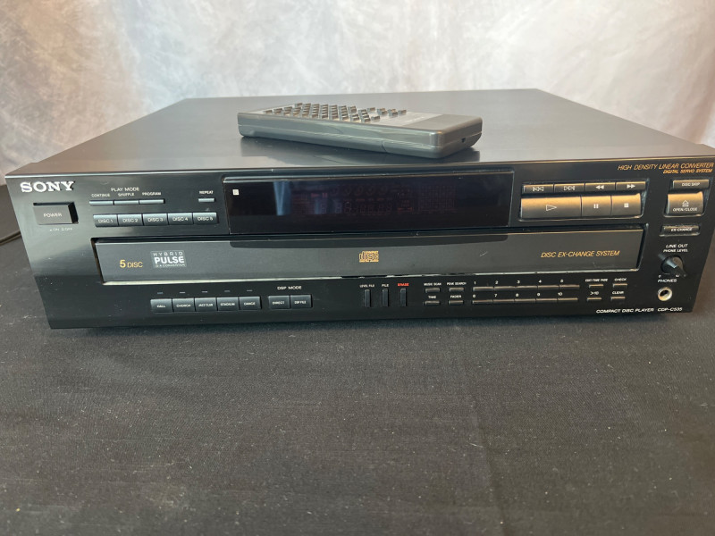 Sony CDP‑C535 five‑disc carousel CD player with matching remote. Features include Disc Ex‑Change operation, Hybrid Pulse digital‑to‑analog conversion, DSP sound modes (Rock, Jazz, Classical, Vocal), front‑panel playback controls, and headphone output with level adjustment. A solid, vintage Sony unit ideal for multi‑disc listening setups. This unit was Made in Japan. Tested for power‑on.