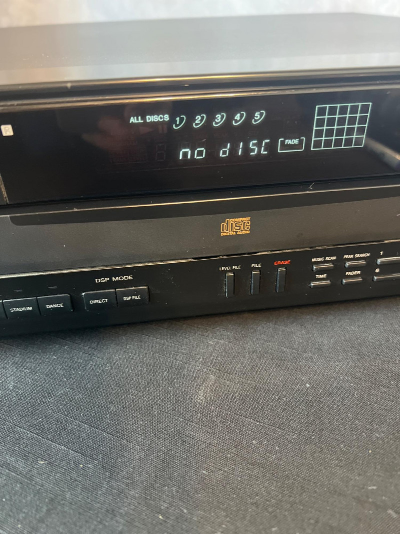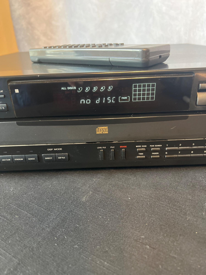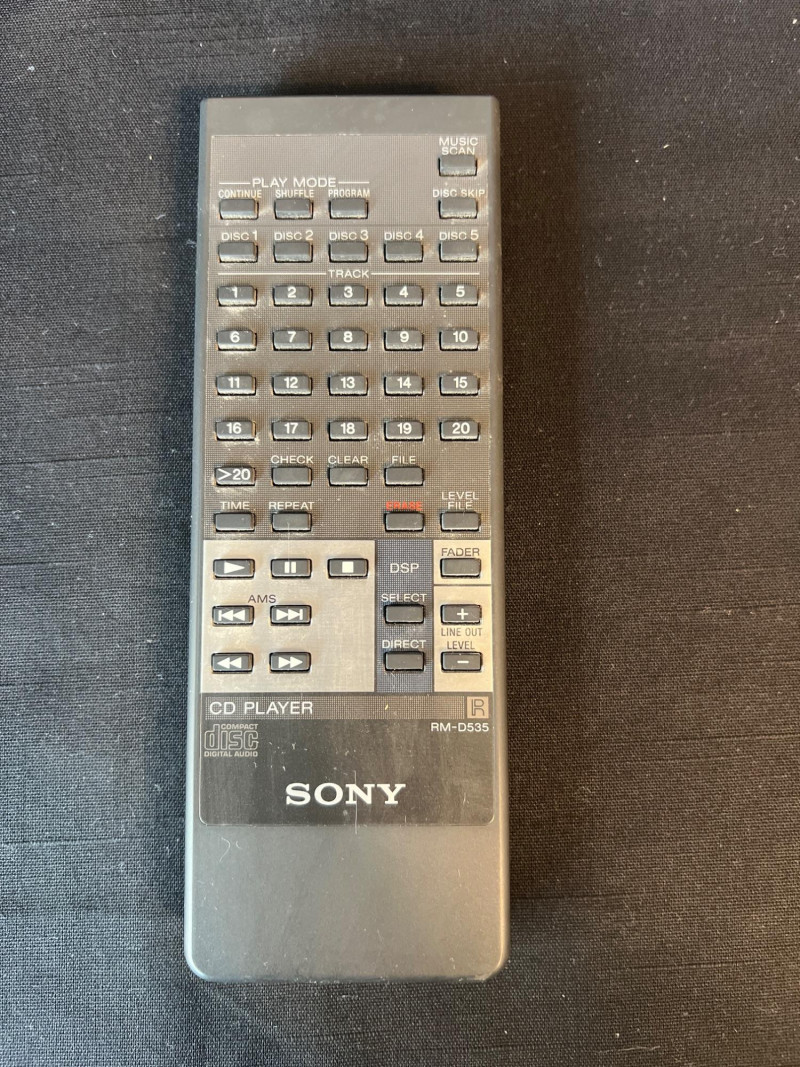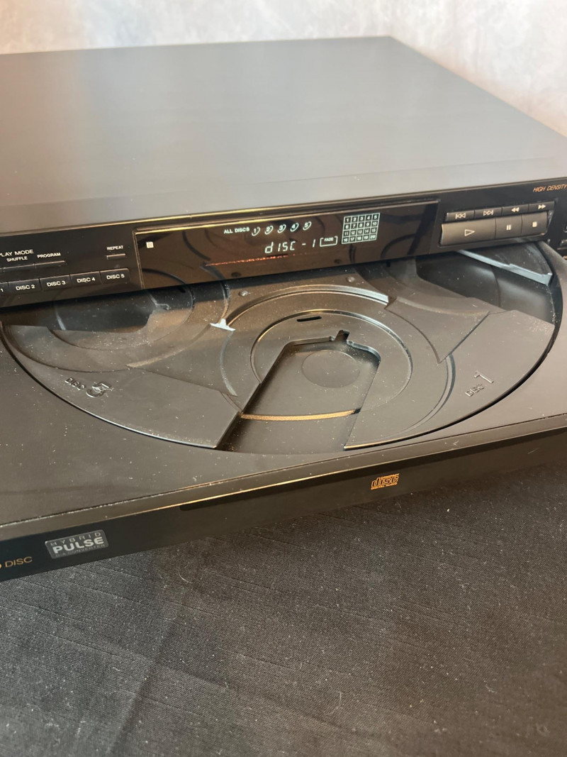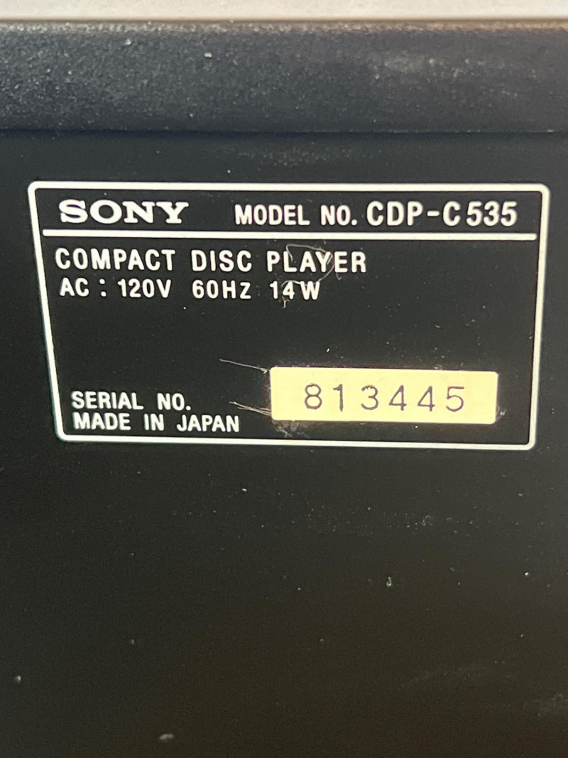 Sony CDP‑C535 five‑disc carousel CD player with matching remote. Features include Disc Ex‑Change operation, Hybrid Pulse digital‑to‑analog conversion, DSP sound modes (Rock, Jazz, Classical, Vocal), front‑panel playback controls, and headphone output with level adjustment. A solid, vintage Sony unit ideal for multi‑disc listening setups. This unit was Made in Japan. Tested for power‑on.