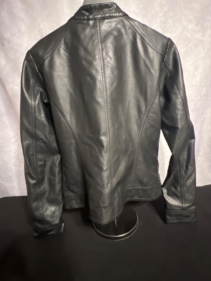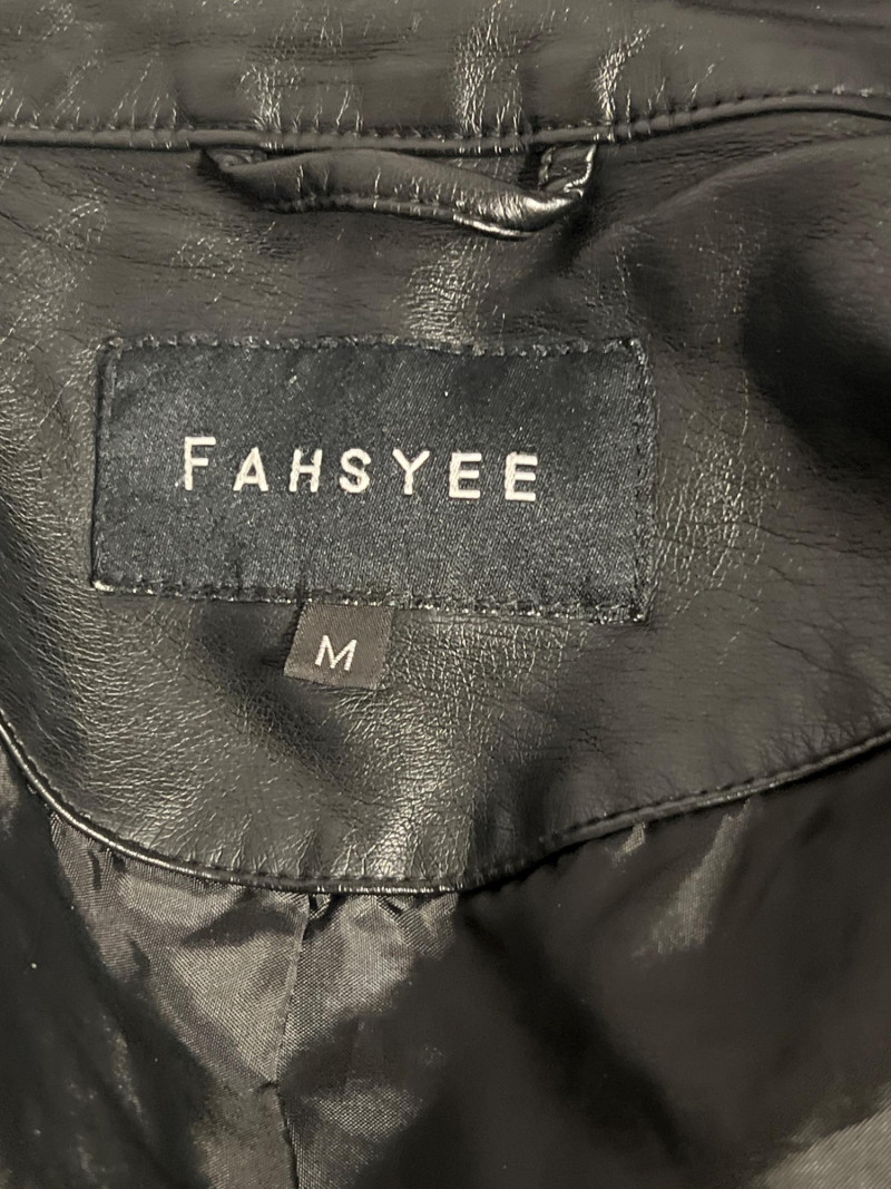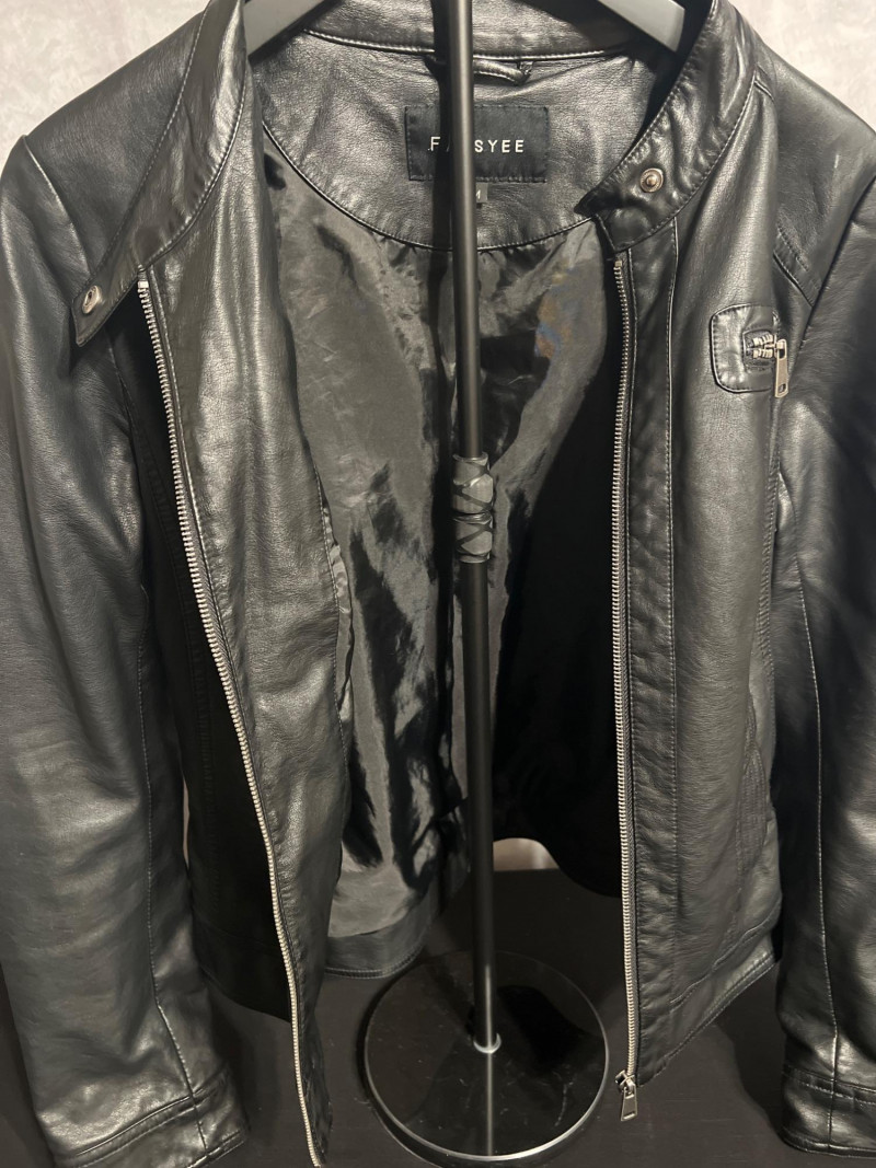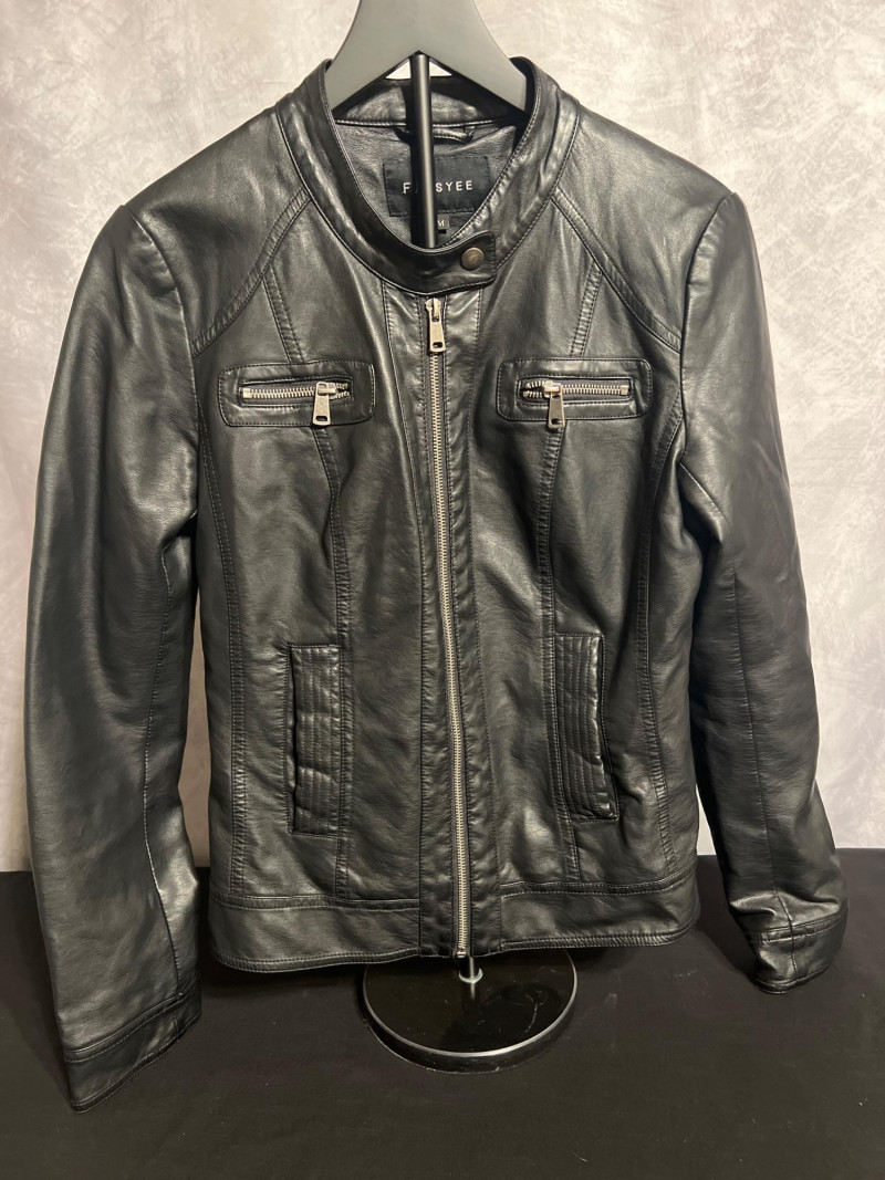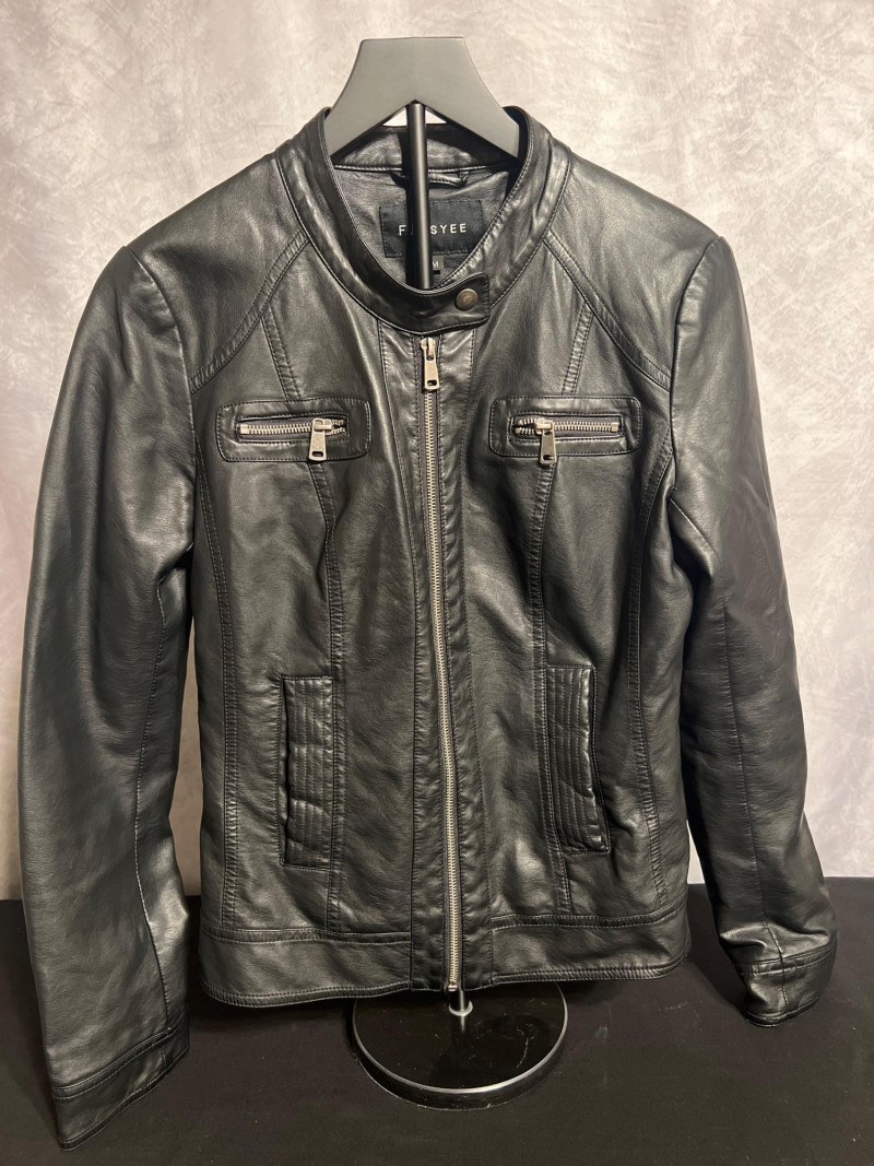 Sleek black Fahsyee faux leather moto jacket in size M, featuring a modern fitted cut with front zip closure, two zippered chest pockets, and stitched detailing along the seams. The design includes a snap‑tab collar and smooth faux‑leather finish, offering a stylish, lightweight outer layer suitable for everyday wear. A great wardrobe staple with a clean, contemporary look.