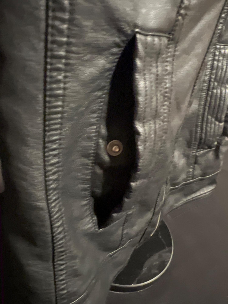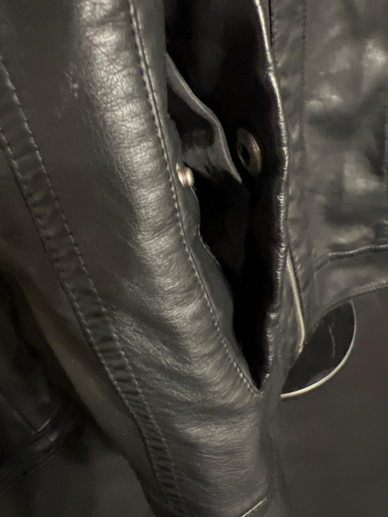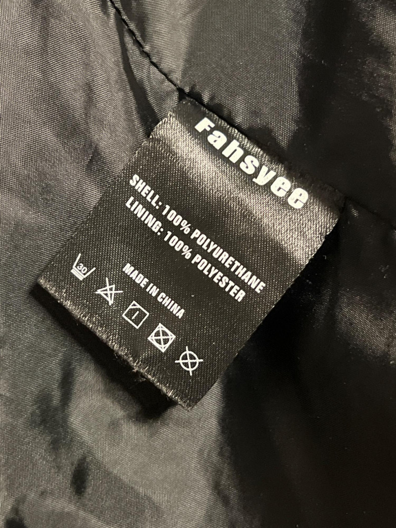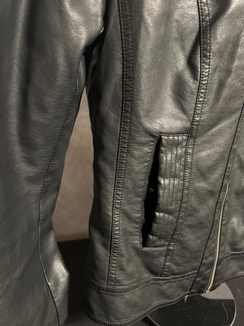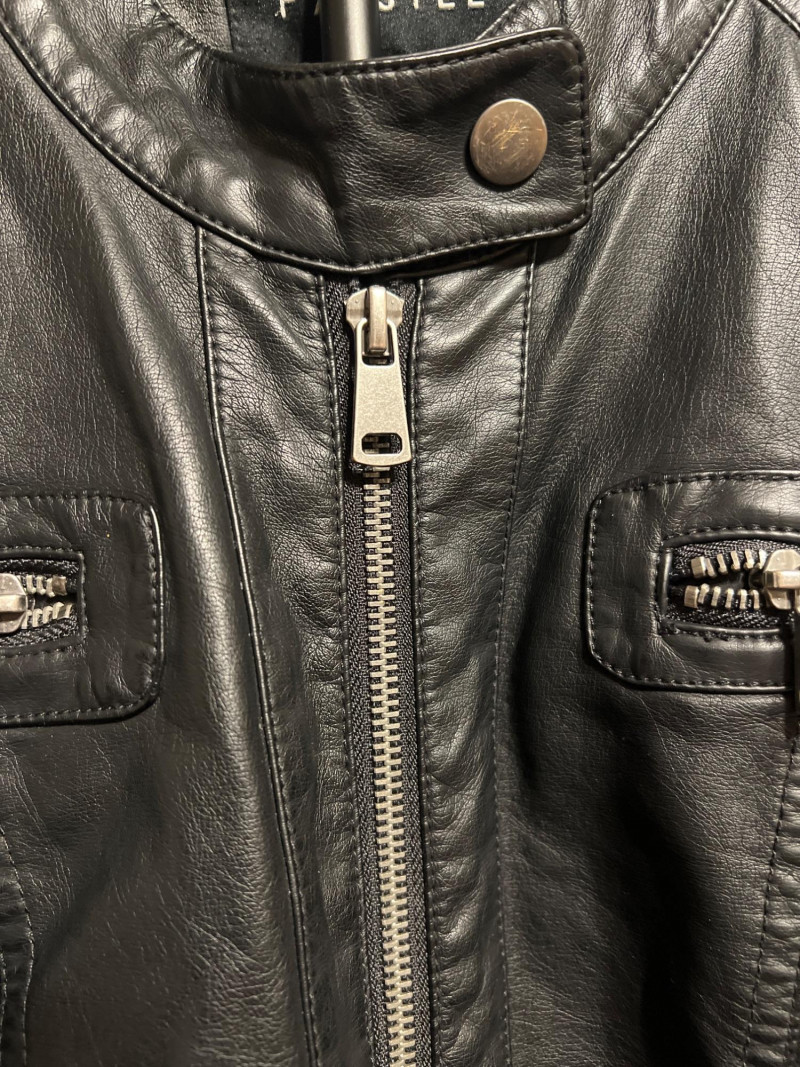 Sleek black Fahsyee faux leather moto jacket in size M, featuring a modern fitted cut with front zip closure, two zippered chest pockets, and stitched detailing along the seams. The design includes a snap‑tab collar and smooth faux‑leather finish, offering a stylish, lightweight outer layer suitable for everyday wear. A great wardrobe staple with a clean, contemporary look.