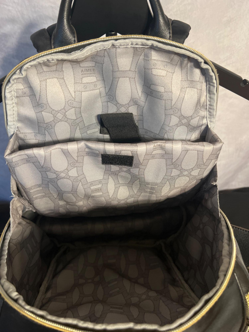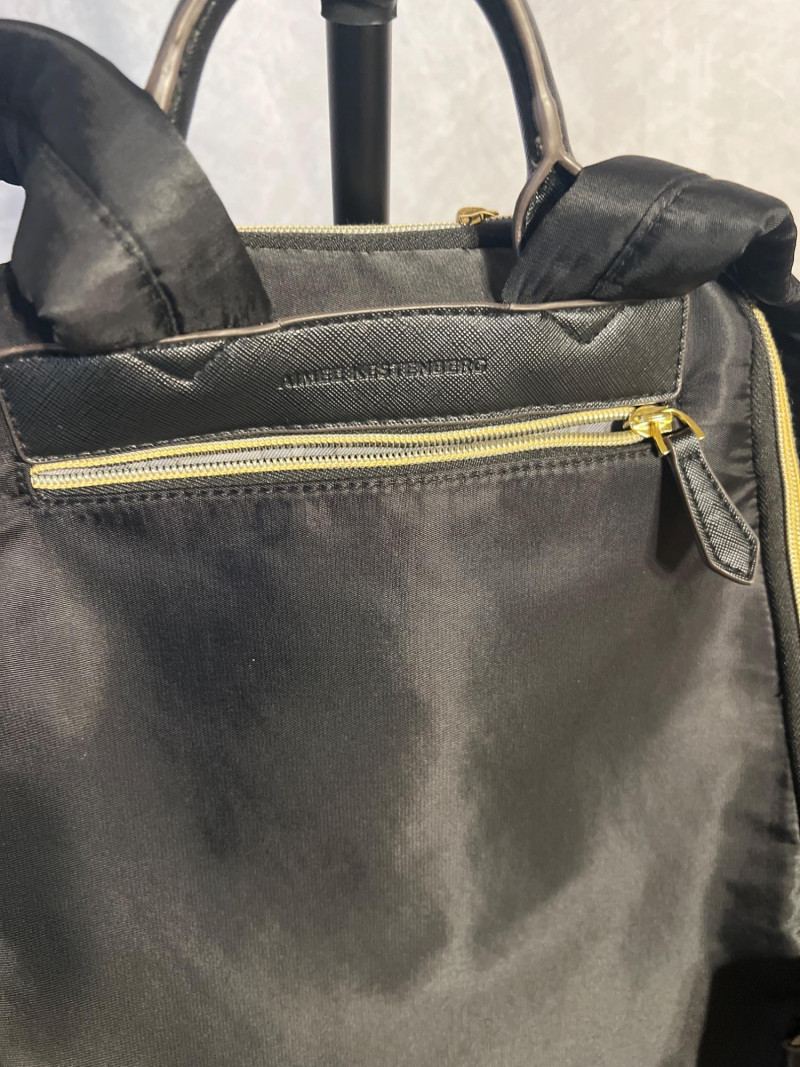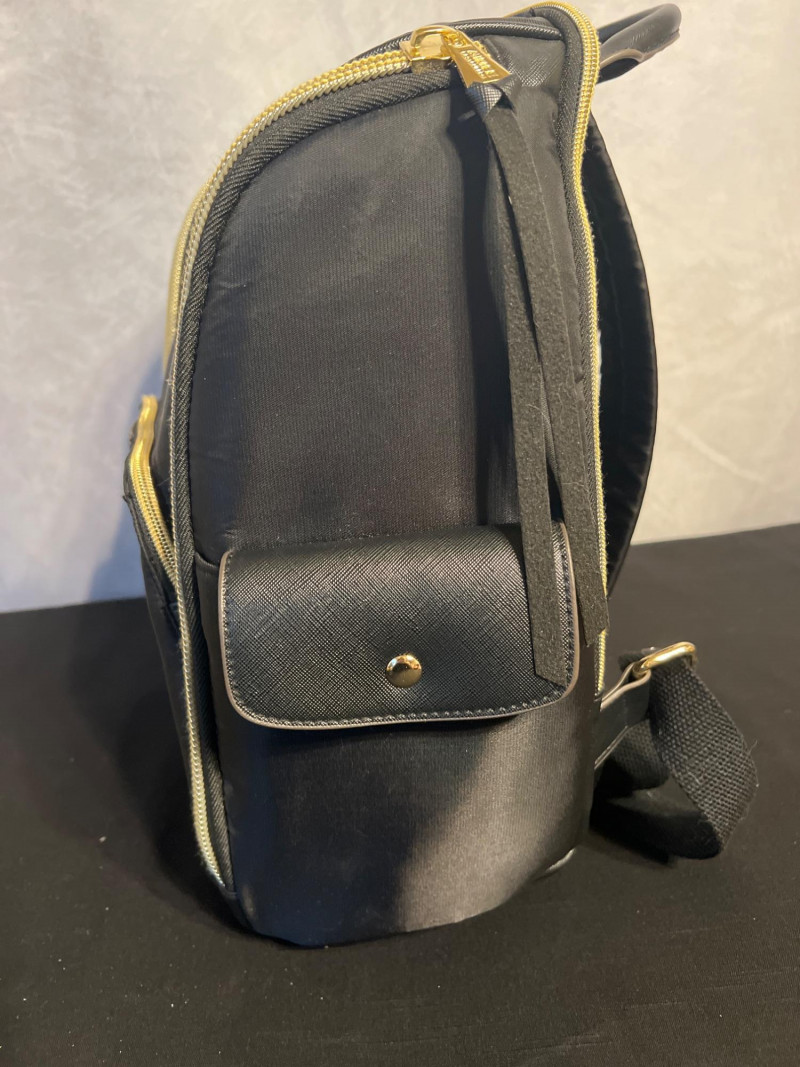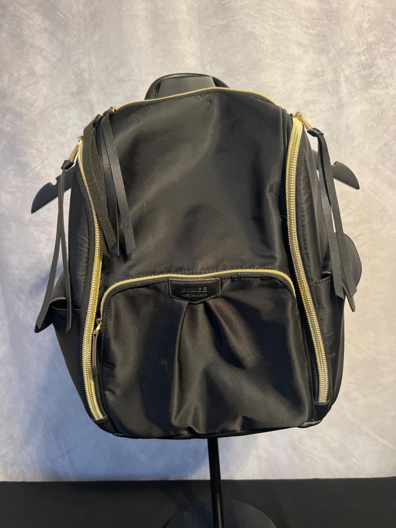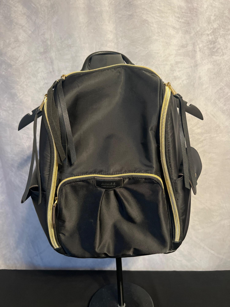 Stylish Aimee Kestenberg black backpack featuring a smooth, modern silhouette with gold‑tone zippers and leather pulls. Designed with multiple compartments for easy organization, including a front zip pocket with the signature Aimee Kestenberg Los Angeles label. Lightweight, versatile, and perfect for everyday use—whether for work, travel, or casual wear.