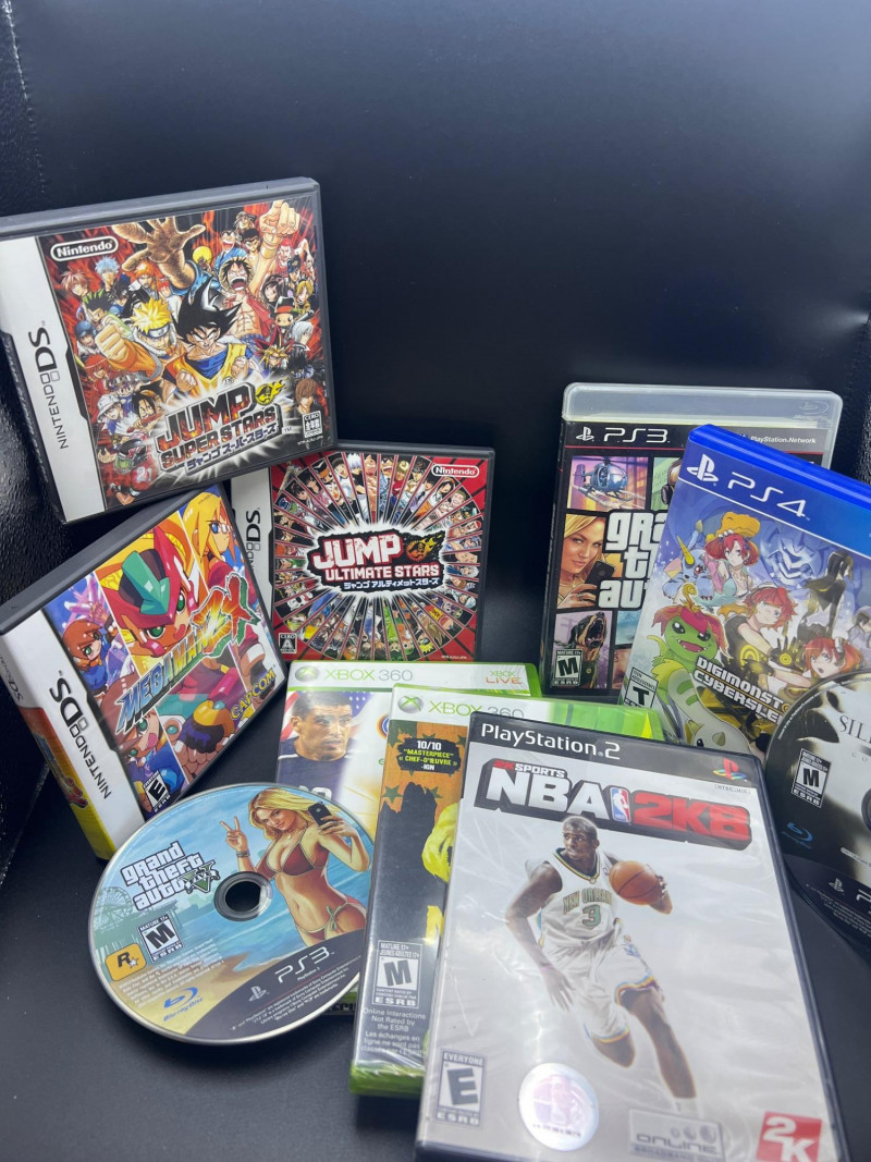 Mixed multi‑platform video game lot featuring titles for PlayStation 2, PlayStation 3, PlayStation 4, Xbox 360, and Nintendo DS. Includes action, sports, RPG, and fighting titles across several generations of consoles. Games included: Nintendo DS: Jump Super Stars, Jump Ultimate Stars, NOTE: Mega Man Star Force is case and manual only. PlayStation 2: NBA 2K8 PlayStation 3: Grand Theft Auto V (case + disc) PlayStation 4: Digimon Story: Cyber Sleuth Xbox 360: Grand Theft Auto IV (two discs - one in case, one without), Call of Duty: Modern Warfare 2, Battlefield Xonox Chuck Norris Double Ender Cartridge: Artillery Duel A diverse bundle ideal for collectors, retro gamers, or resellers looking for cross‑platform inventory.