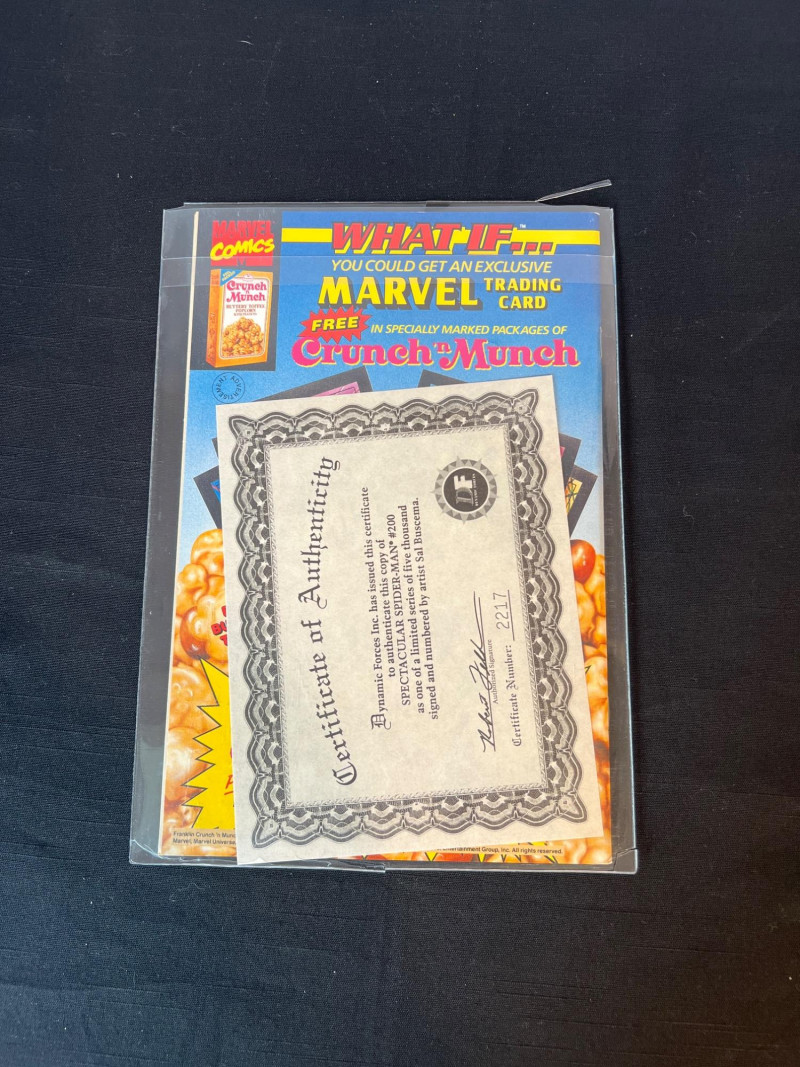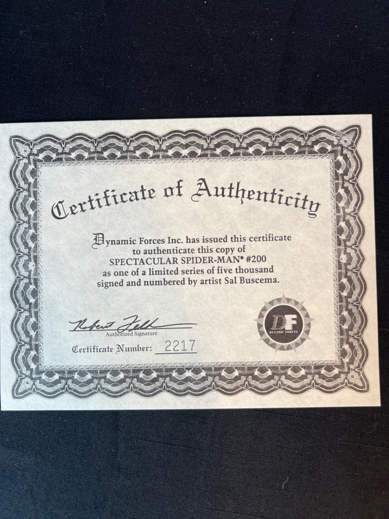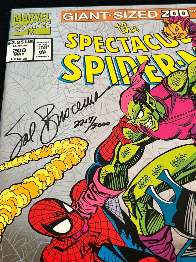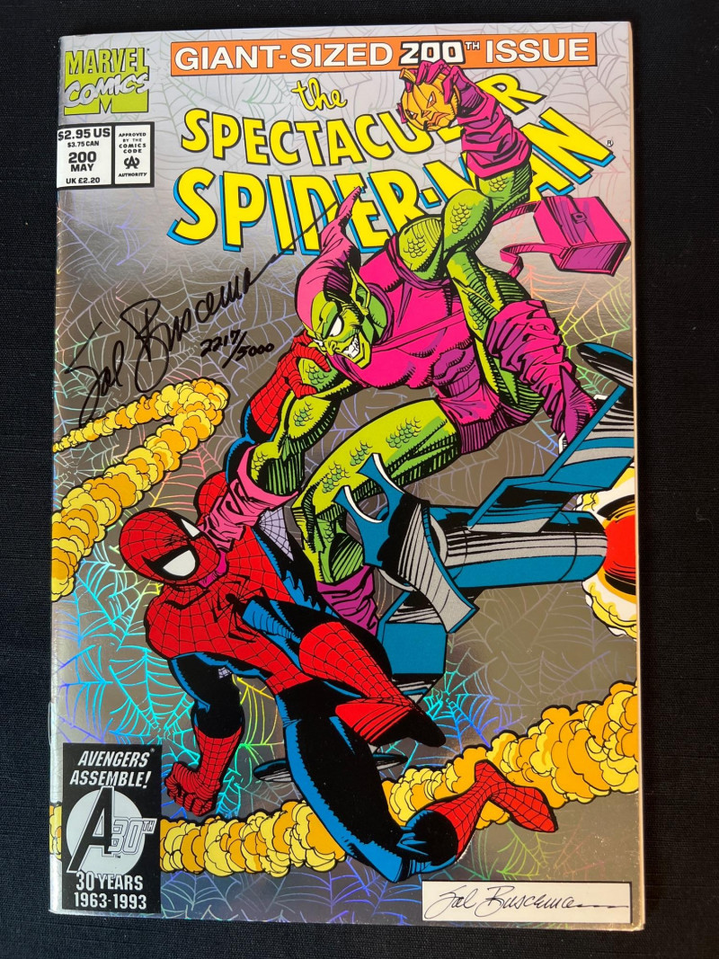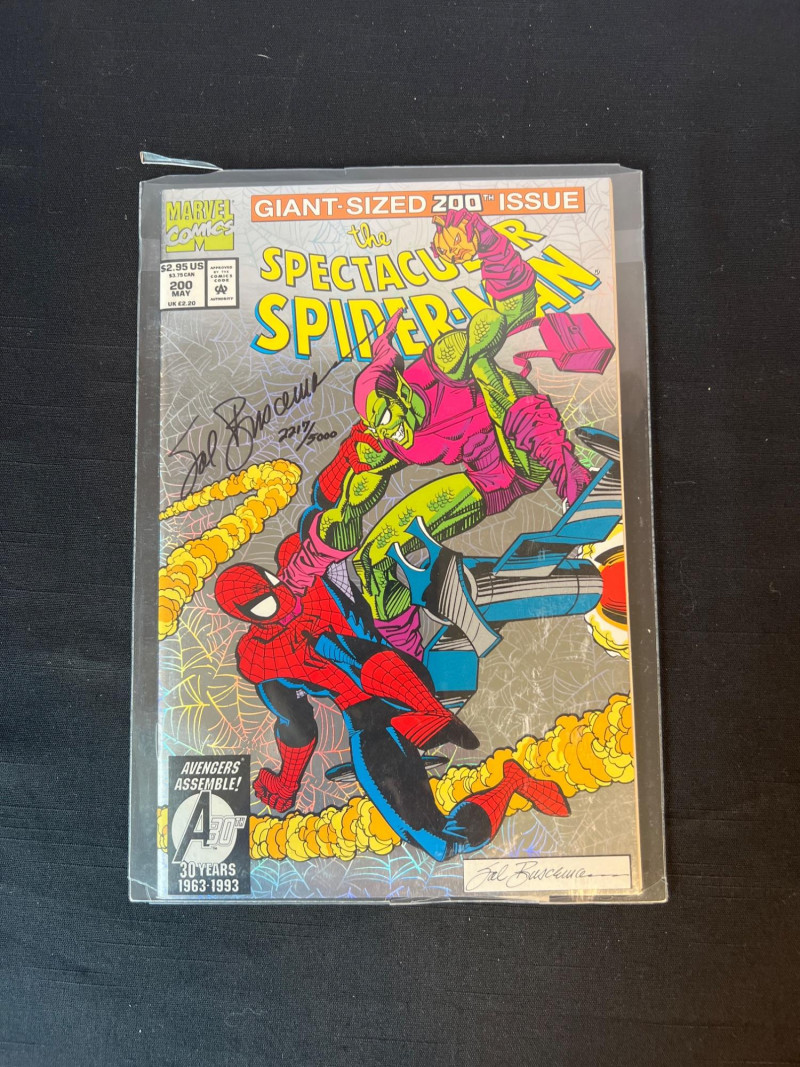 200th issue of The Spectacular Spider‑Man, signed by legendary Marvel artist Sal Buscema and individually numbered 2217/5000. Features a dramatic cover battle between Spider‑Man and the Green Goblin, with bold 1990s Marvel artwork and strong visual presentation. A standout signed edition for Spider‑Man collectors and fans of Buscema’s iconic run. Includes COA. Cellophane sleeve has been opened.