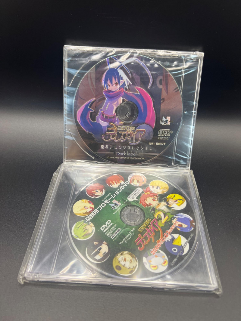 Two‑disc Disgaea collectible lot featuring one Japan‑import soundtrack CD and one promotional DVD: Makai Senki Disgaea – Arrange Collection ~Dark Label~ (2006)