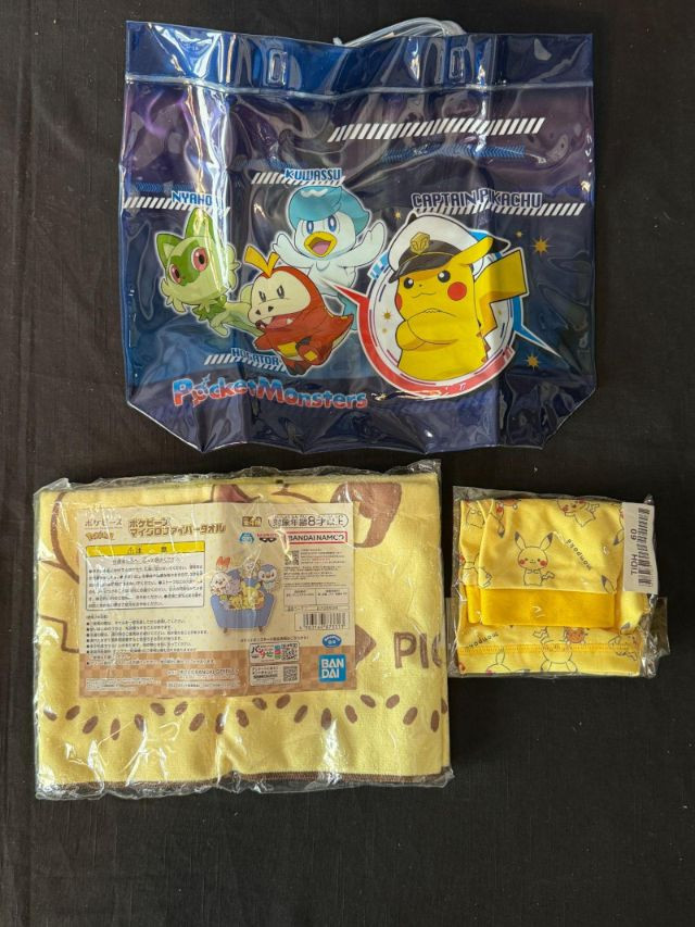 Adorable Pokémon toddler beach bundle, perfect for summer outings, pool days, or playtime in the sun. Includes: Pocket Monsters plastic beach bag featuring Sprigatito, Fuecoco, Quaxly, and Captain Pikachu — bright, lightweight, and easy for little hands to carry. Monpoké Pikachu towel (Japan import) — soft, cheerful yellow design with classic Pikachu artwork. Matching Pikachu toddler shorts (Japan import) — lightweight and beach‑ready, ideal for warm weather. A charming, coordinated set for any young Pokémon fan. All items are clean, vibrant, and ready for summer adventures.