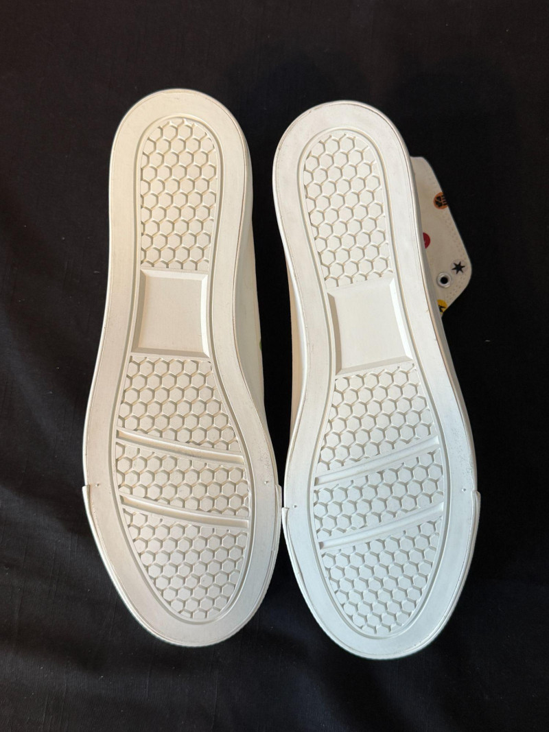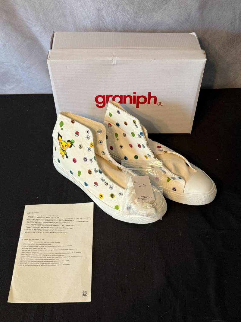 Adorable Pokémon Center × Graniph high‑top sneakers featuring an all‑over print of classic Pokémon symbols and a large Pichu graphic on the outer side. Clean white canvas with colorful detailing, paired with original Graniph shoebox, extra laces, and care‑instruction sheet. A stylish and collectible Japan‑exclusive release, perfect for Pokémon fans, fashion collectors, or anyone who loves unique character‑themed apparel.