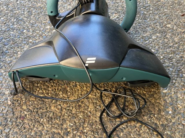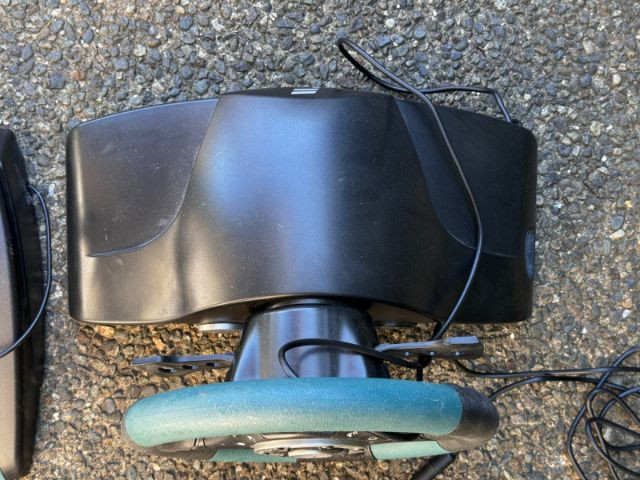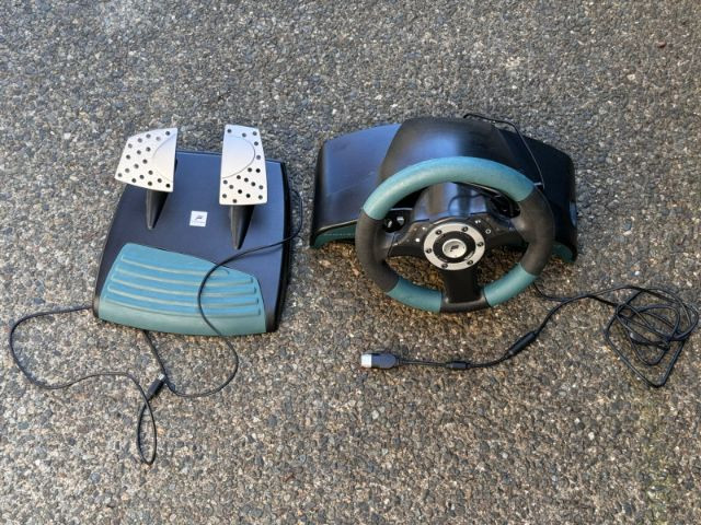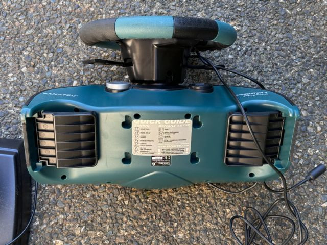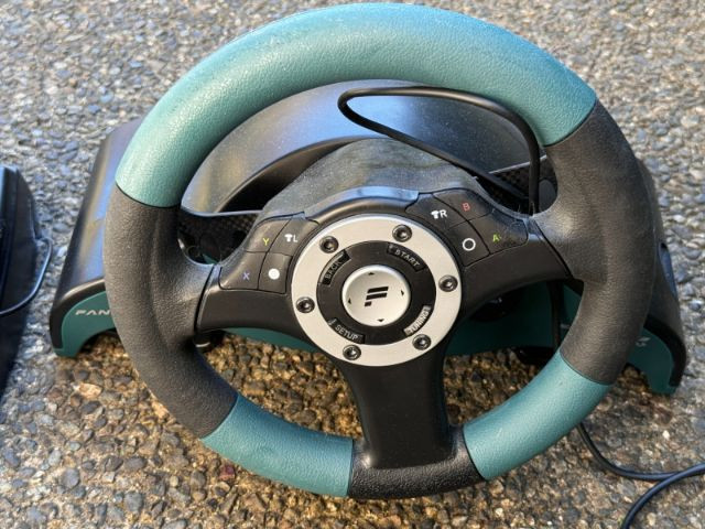 Fanatec Speedster 3 ForceShock racing wheel and pedal set, designed for immersive driving gameplay with force‑feedback effects and responsive steering control. Includes the two‑pedal base with metal accelerator and brake pedals, integrated mounting clamps, and factory cabling. A solid vintage Fanatec controller for racing enthusiasts and collectors of early console peripherals. Condition consistent with age and prior use.