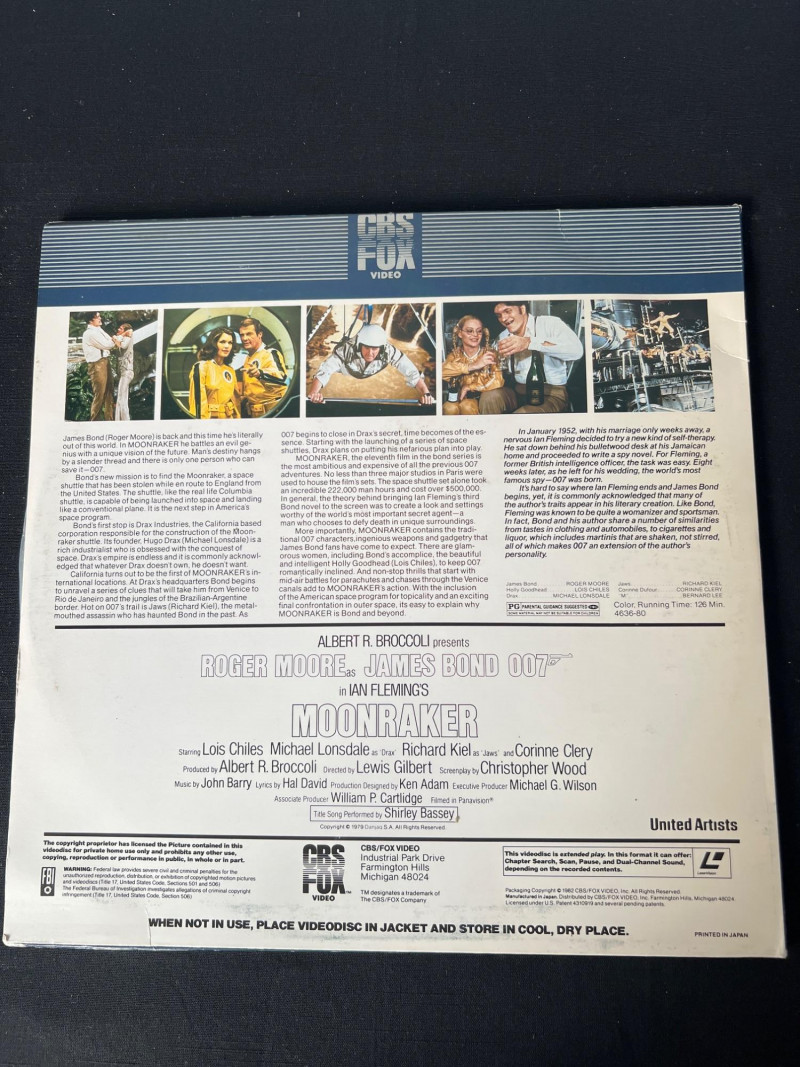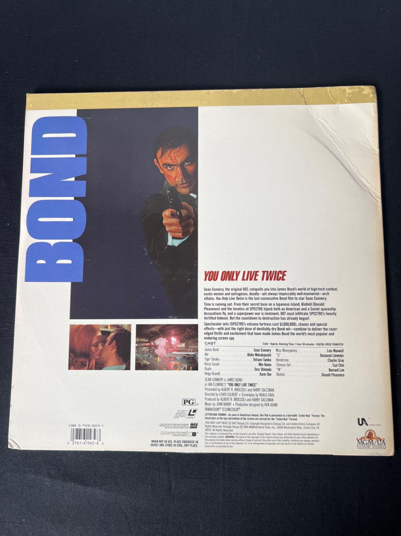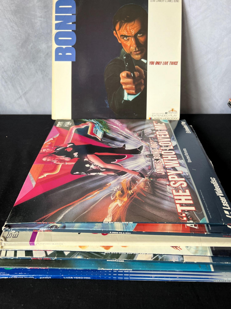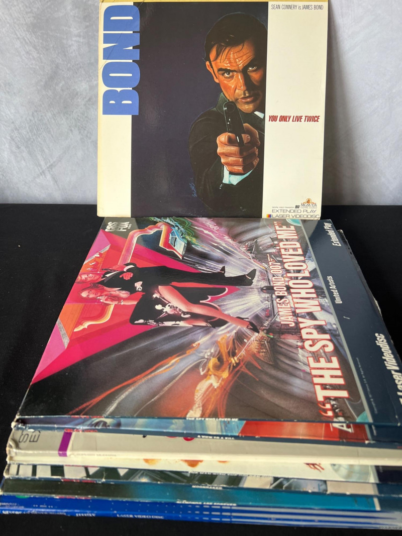 Collection of vintage James Bond LaserDiscs featuring classic titles from the Sean Connery and Roger Moore eras. This grouping includes iconic films such as: You Only Live Twice – Sean Connery in a high‑stakes Cold War–era mission with signature 1960s style. The Spy Who Loved Me – Roger Moore in one of the franchise’s most celebrated entries, featuring the Lotus Esprit and villain Jaws. A View to a Kill – Moore’s final Bond film, known for its 80s energy and memorable villain duo. Moonraker – A space‑themed Bond adventure with bold visuals and classic Moore charm. A strong, visually striking assortment ideal for collectors of 007 memorabilia, vintage home media, and fans of the franchise’s golden‑age style. These LaserDiscs showcase the bold artwork and format nostalgia that make Bond titles especially collectible. Note: Most vinyl records and LaserDiscs in this auction are visually graded Near Mint, with covers showing normal signs of handling, shelf wear, or age‑appropriate fading.