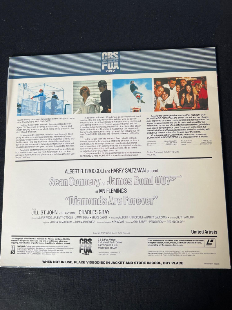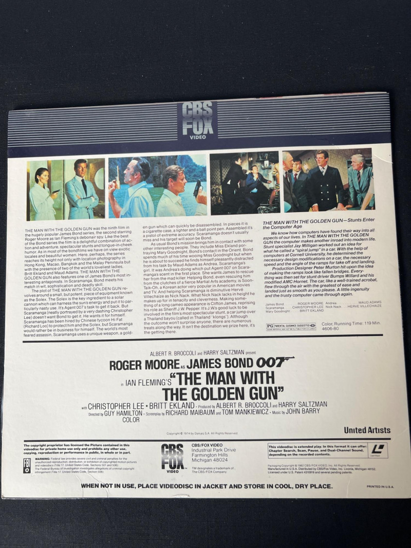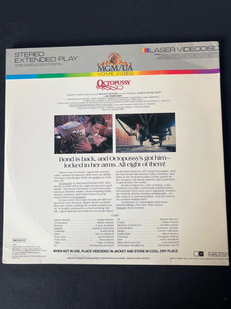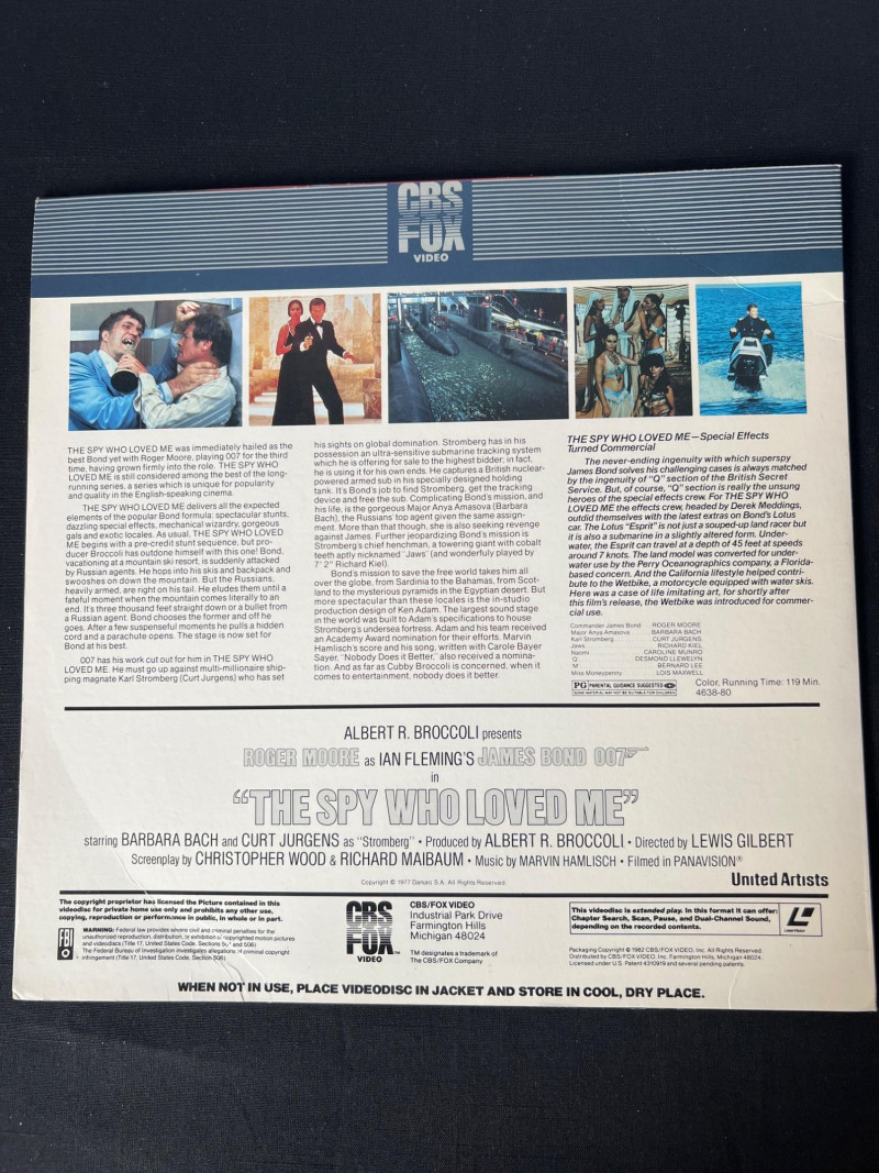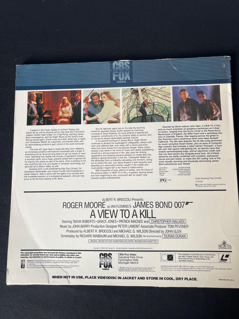 Collection of vintage James Bond LaserDiscs featuring classic titles from the Sean Connery and Roger Moore eras. This grouping includes iconic films such as: You Only Live Twice – Sean Connery in a high‑stakes Cold War–era mission with signature 1960s style. The Spy Who Loved Me – Roger Moore in one of the franchise’s most celebrated entries, featuring the Lotus Esprit and villain Jaws. A View to a Kill – Moore’s final Bond film, known for its 80s energy and memorable villain duo. Moonraker – A space‑themed Bond adventure with bold visuals and classic Moore charm. A strong, visually striking assortment ideal for collectors of 007 memorabilia, vintage home media, and fans of the franchise’s golden‑age style. These LaserDiscs showcase the bold artwork and format nostalgia that make Bond titles especially collectible. Note: Most vinyl records and LaserDiscs in this auction are visually graded Near Mint, with covers showing normal signs of handling, shelf wear, or age‑appropriate fading.