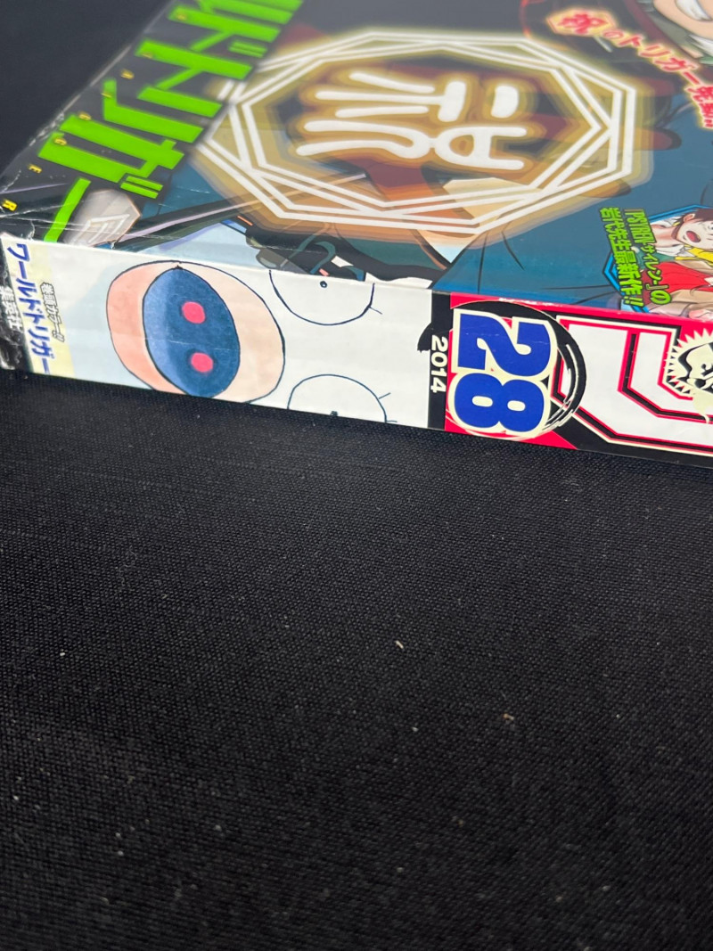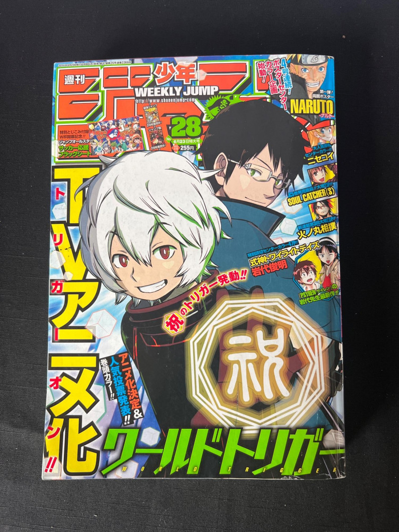 Two original Weekly Shōnen Jump Japanese magazine issues featuring standout series from the 2010s era. The 2013 Issue #45 showcases World Trigger on the cover with early‑run artwork and supporting features including Naruto and Soul Catcher(s). The 2014 Issue #33 highlights Haikyuu!! with Shōyō Hinata in a dynamic volleyball cover pose. Both issues present vibrant, high‑impact cover art and represent key moments in each series’ rise within Shōnen Jump’s lineup. Ideal for manga collectors, anime fans, and retro pop‑culture enthusiasts.