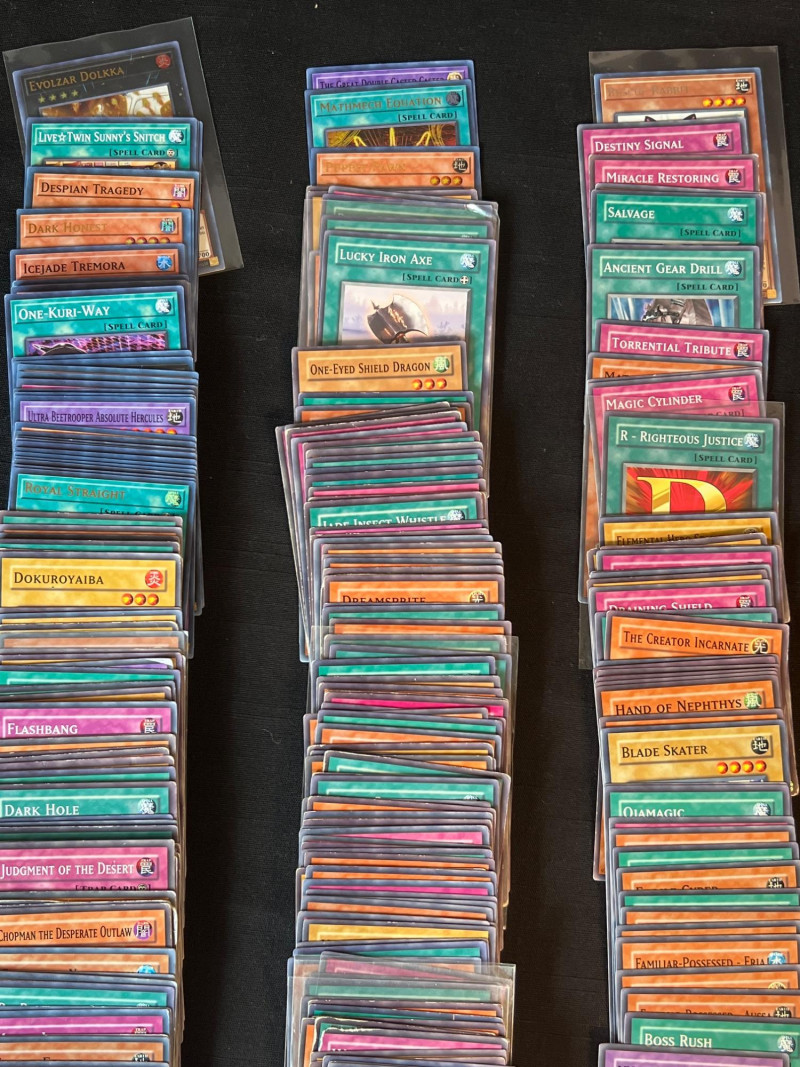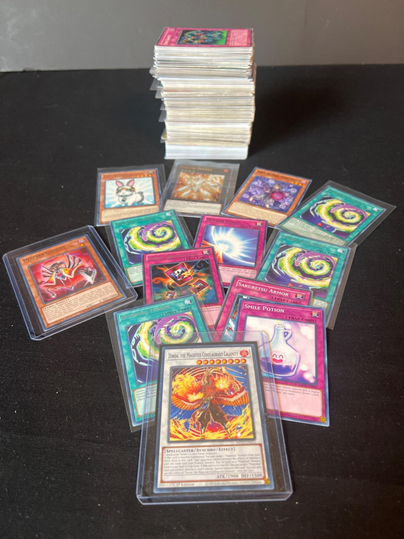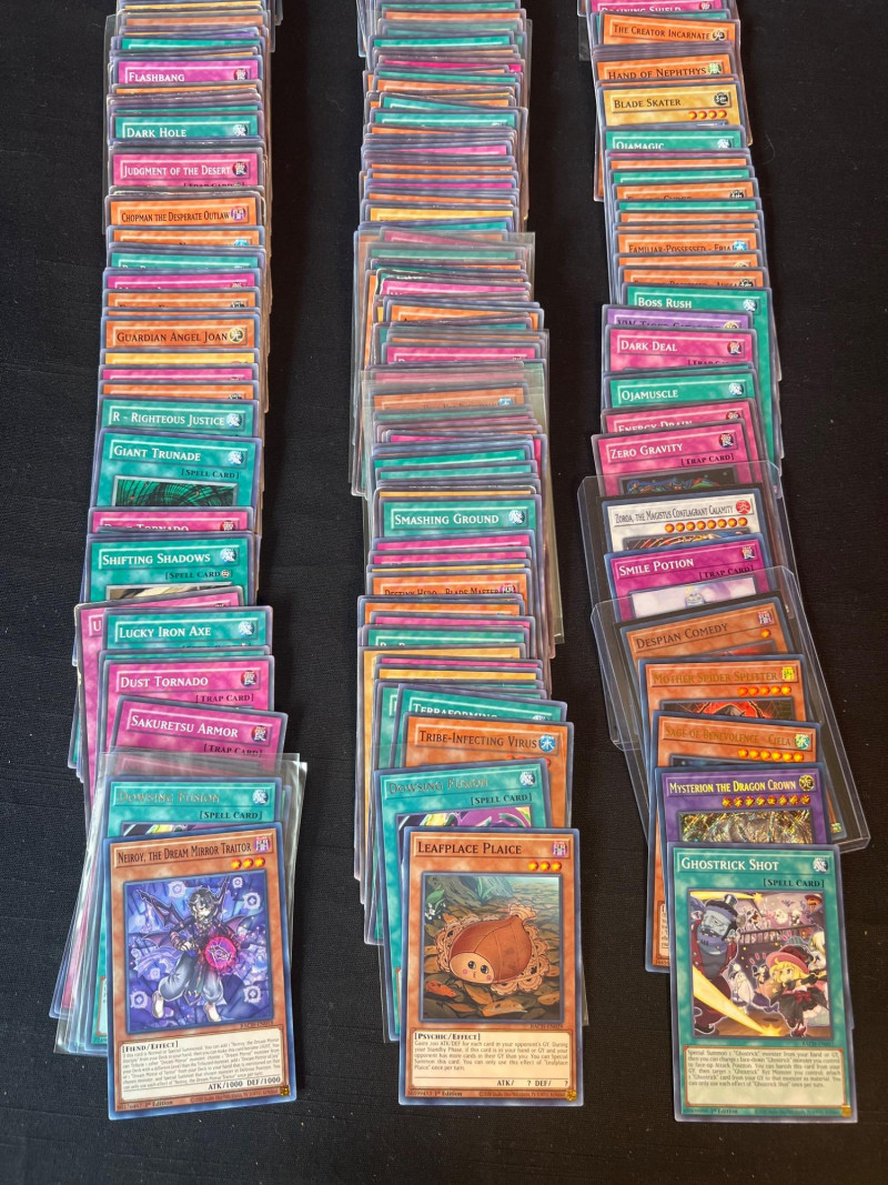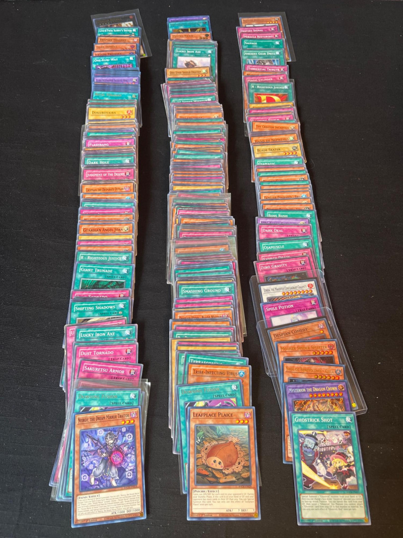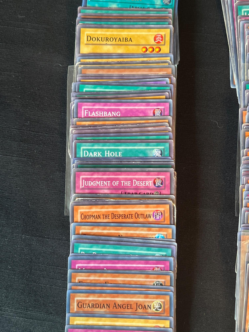 Assortment of loose Yu‑Gi‑Oh! trading cards including a mix of Monster, Spell, and Trap cards. Several cards are sleeved and displayed in organized stacks. Includes recognizable titles such as Dark Hole, Smashing Ground, Guardian Angel Joan, and other modern and classic gameplay cards. Conditions vary; cards are ungraded. A solid mixed group for collectors, deck builders, or players seeking bulk additions.