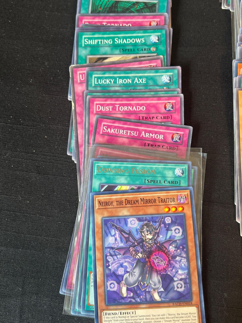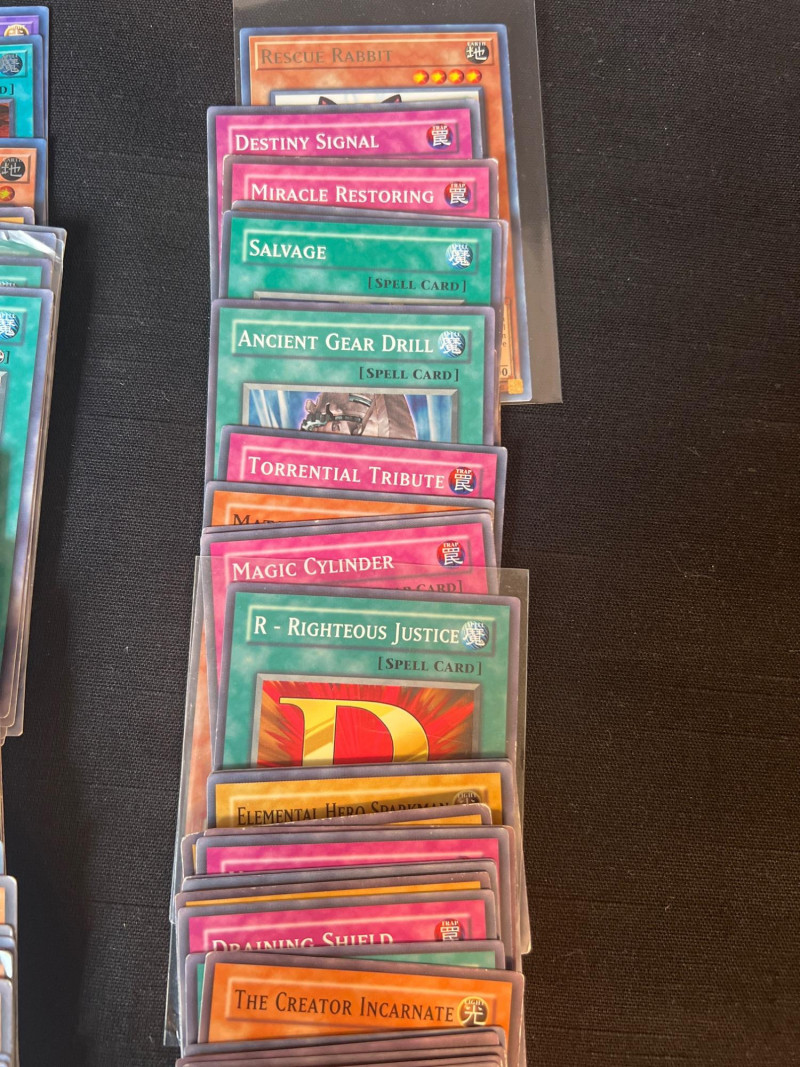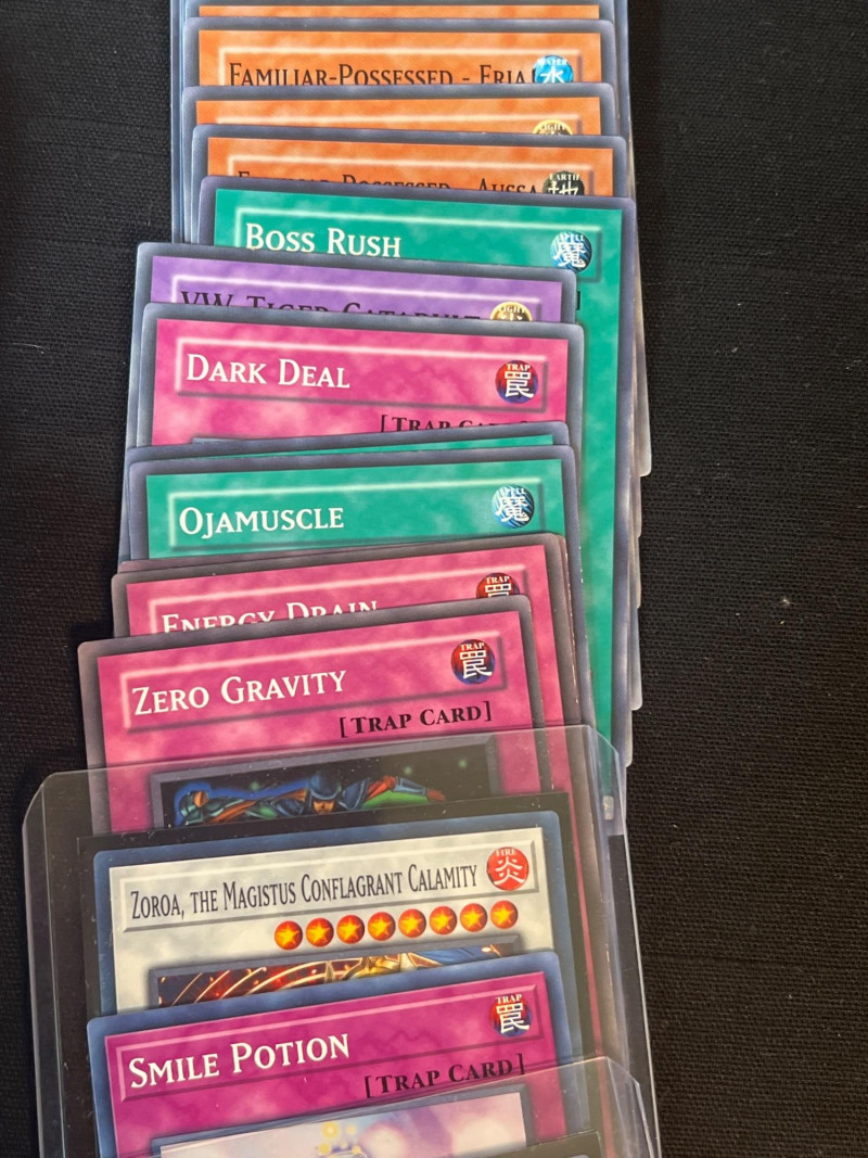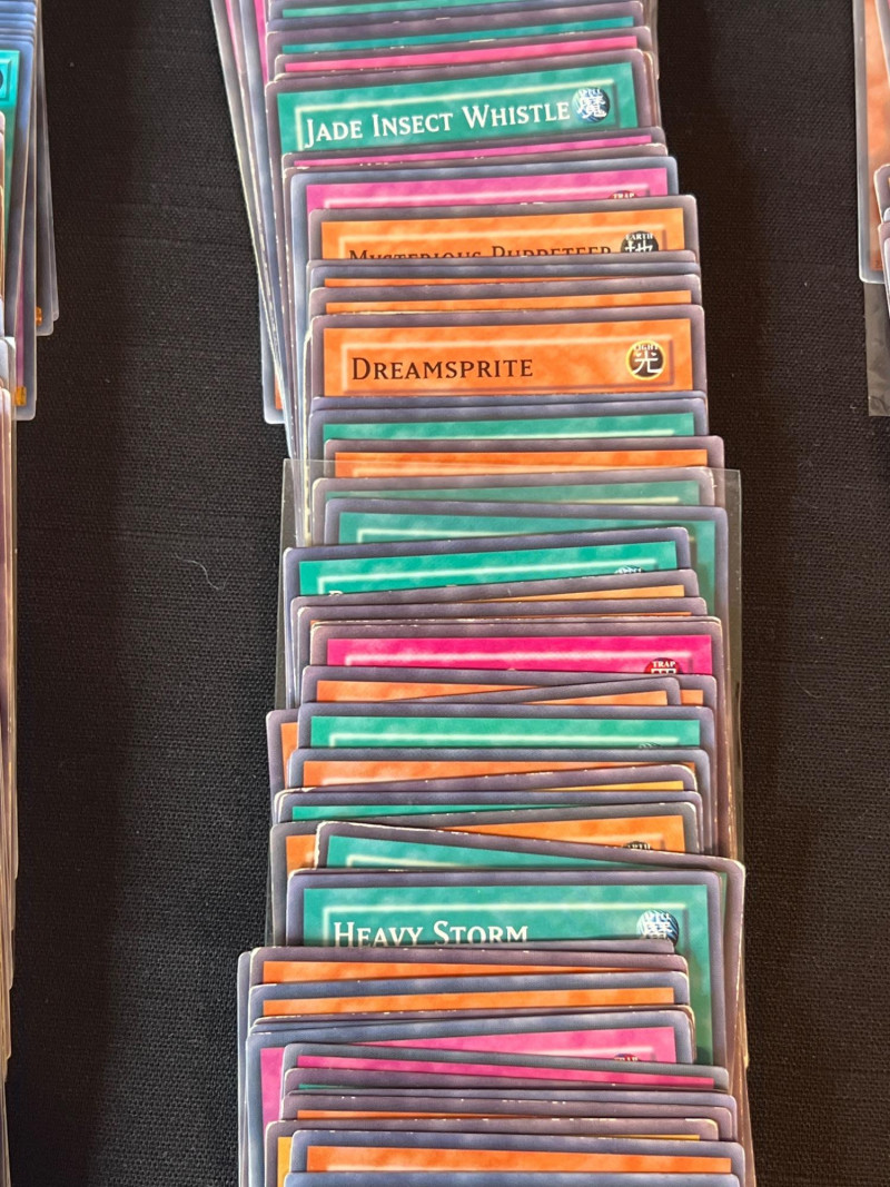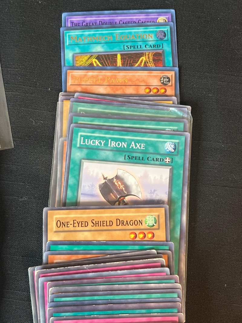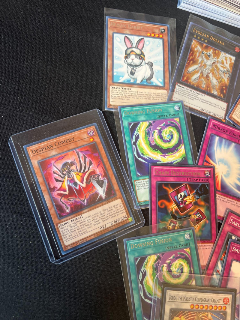 Assortment of loose Yu‑Gi‑Oh! trading cards including a mix of Monster, Spell, and Trap cards. Several cards are sleeved and displayed in organized stacks. Includes recognizable titles such as Dark Hole, Smashing Ground, Guardian Angel Joan, and other modern and classic gameplay cards. Conditions vary; cards are ungraded. A solid mixed group for collectors, deck builders, or players seeking bulk additions.