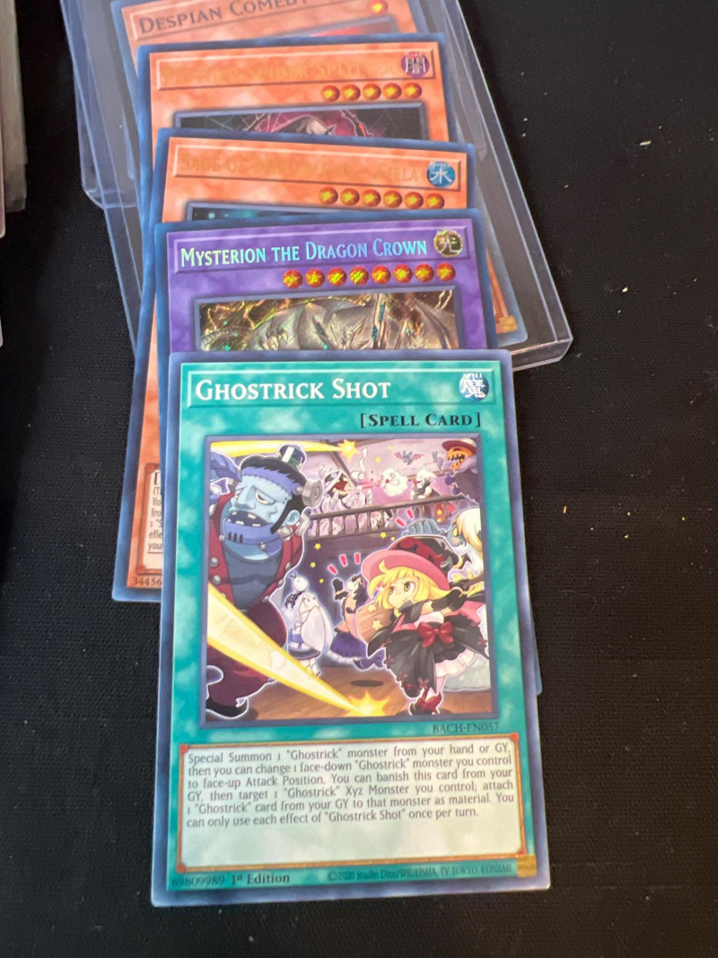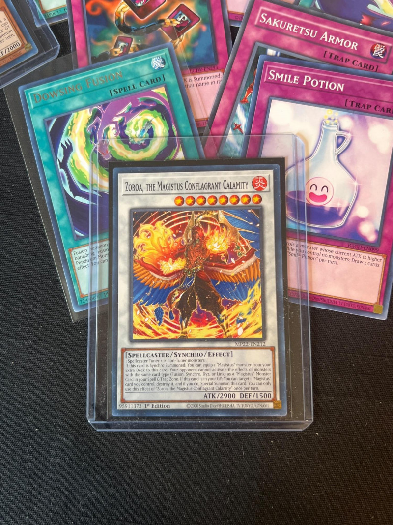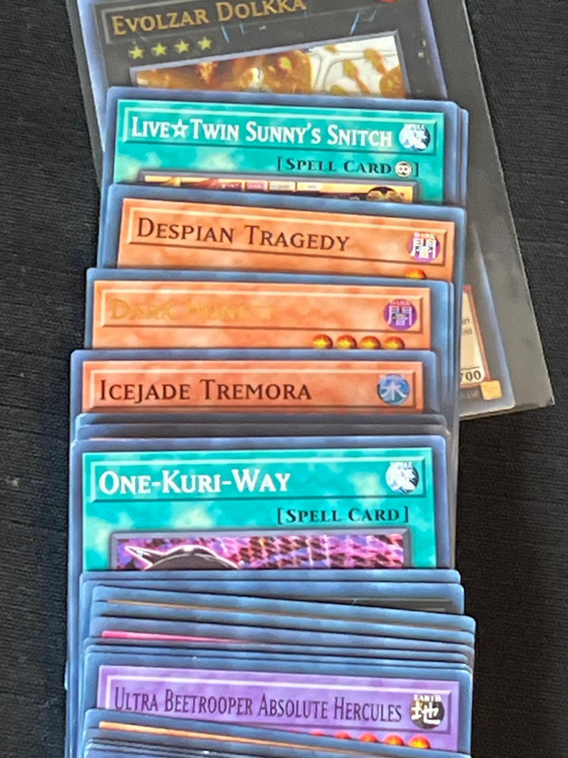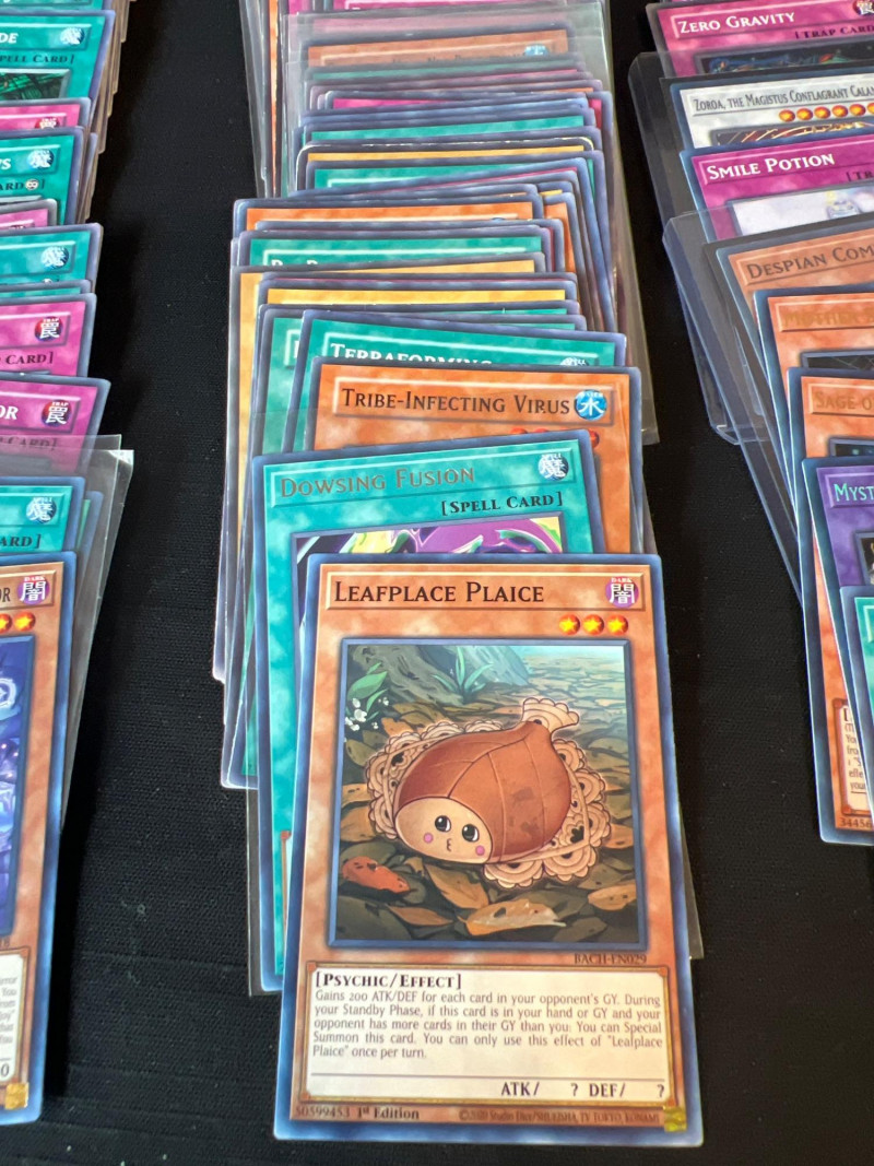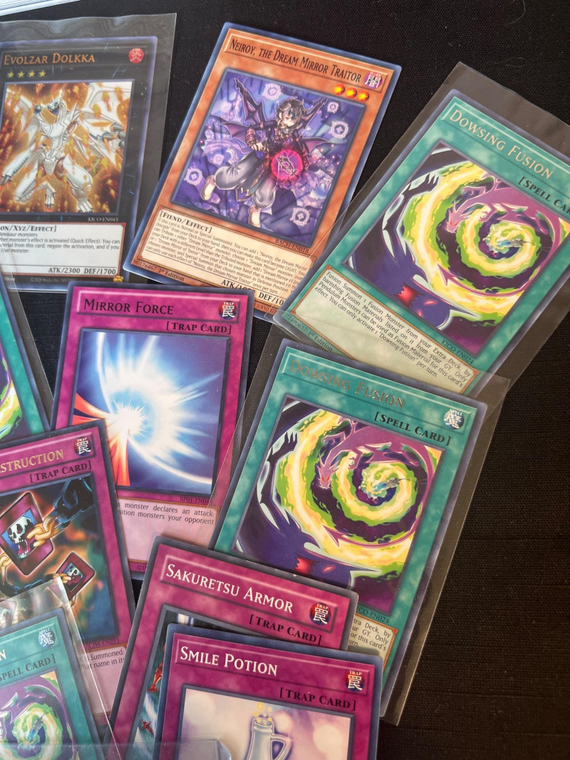 Assortment of loose Yu‑Gi‑Oh! trading cards including a mix of Monster, Spell, and Trap cards. Several cards are sleeved and displayed in organized stacks. Includes recognizable titles such as Dark Hole, Smashing Ground, Guardian Angel Joan, and other modern and classic gameplay cards. Conditions vary; cards are ungraded. A solid mixed group for collectors, deck builders, or players seeking bulk additions.