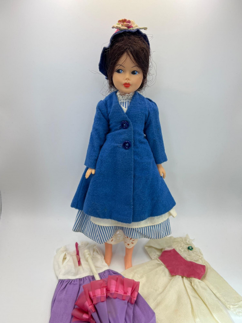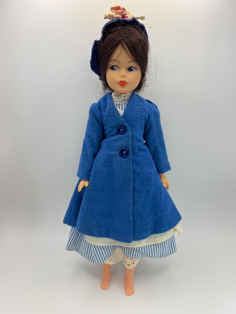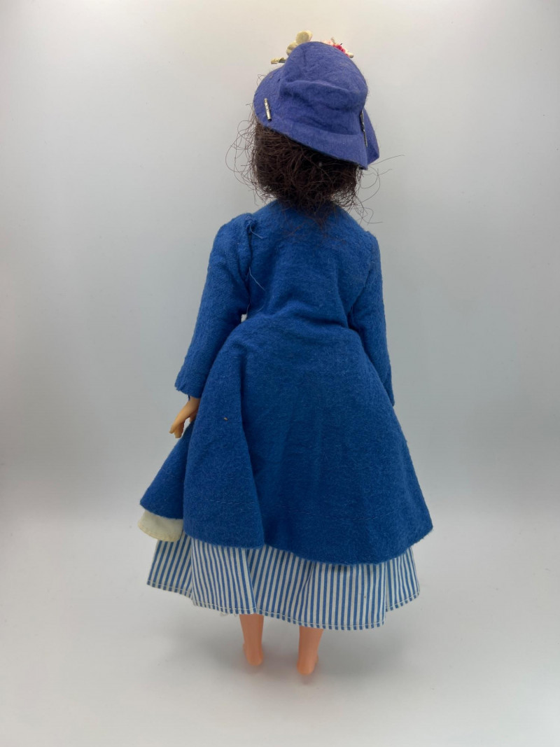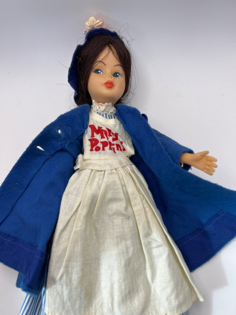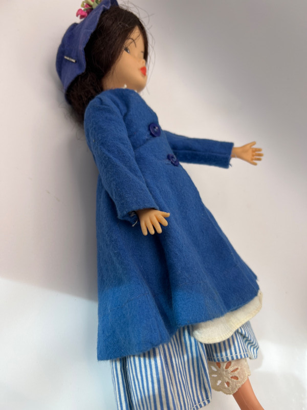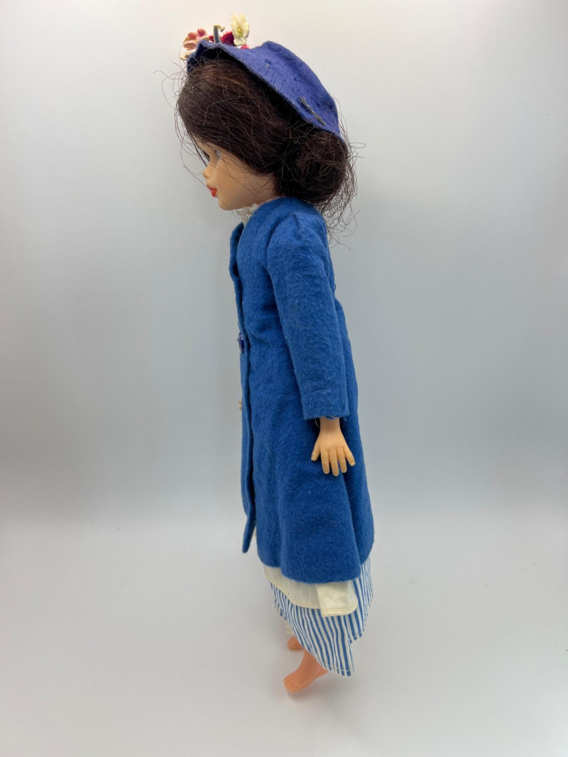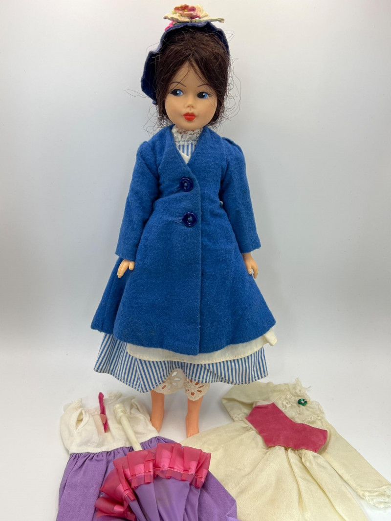 A vintage 12-inch Mary Poppins doll by Horsman (1964-1967), dressed in her original blue coat, matching hat, striped dress, and lace-trimmed bloomers. Her painted features, dark hair, and bright blue eyes reflect the classic mid‑century Horsman style—sweet, expressive, and unmistakably storybook. Additional garments accompany her, including pastel dresses and skirts that expand her display wardrobe. A charming piece for collectors of Horsman, character dolls, or film-inspired vintage figures. Condition consistent with age and gentle handling. MISSING: stockings, shoes, purse