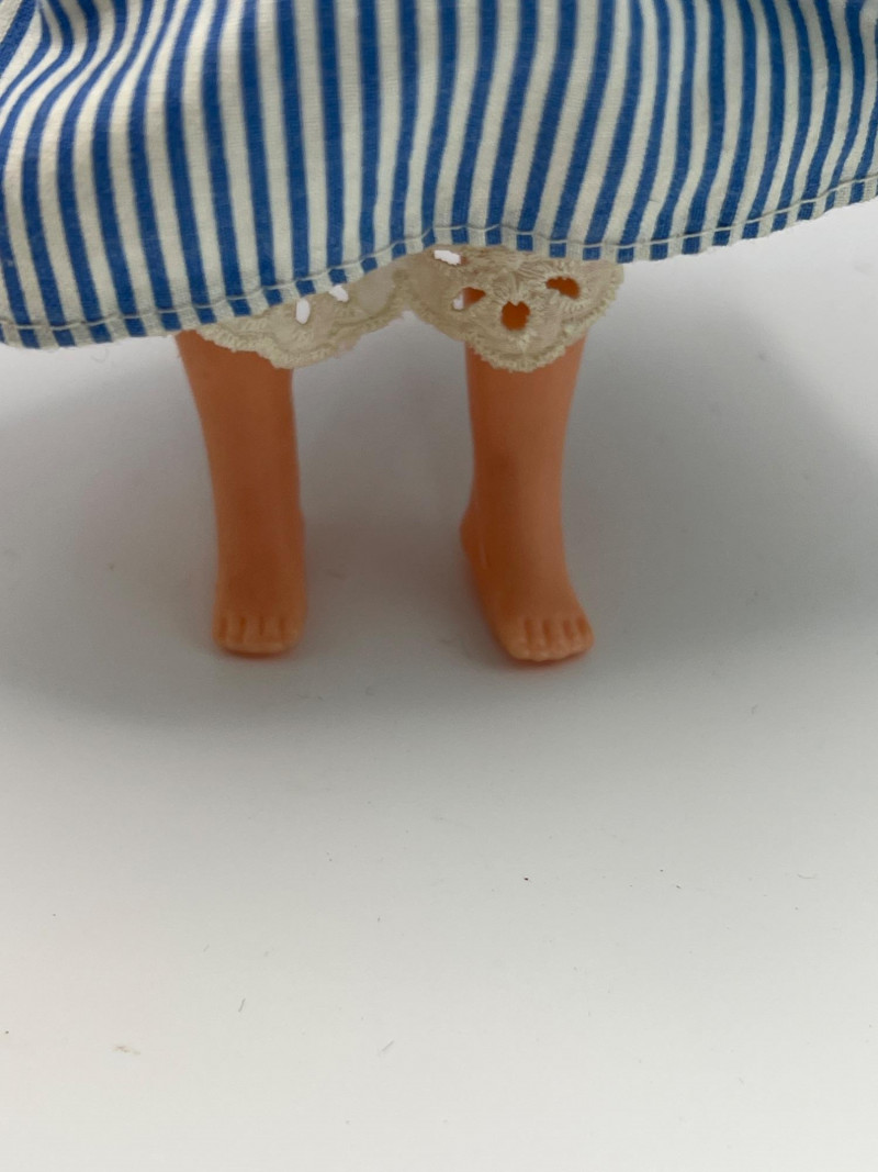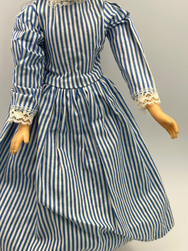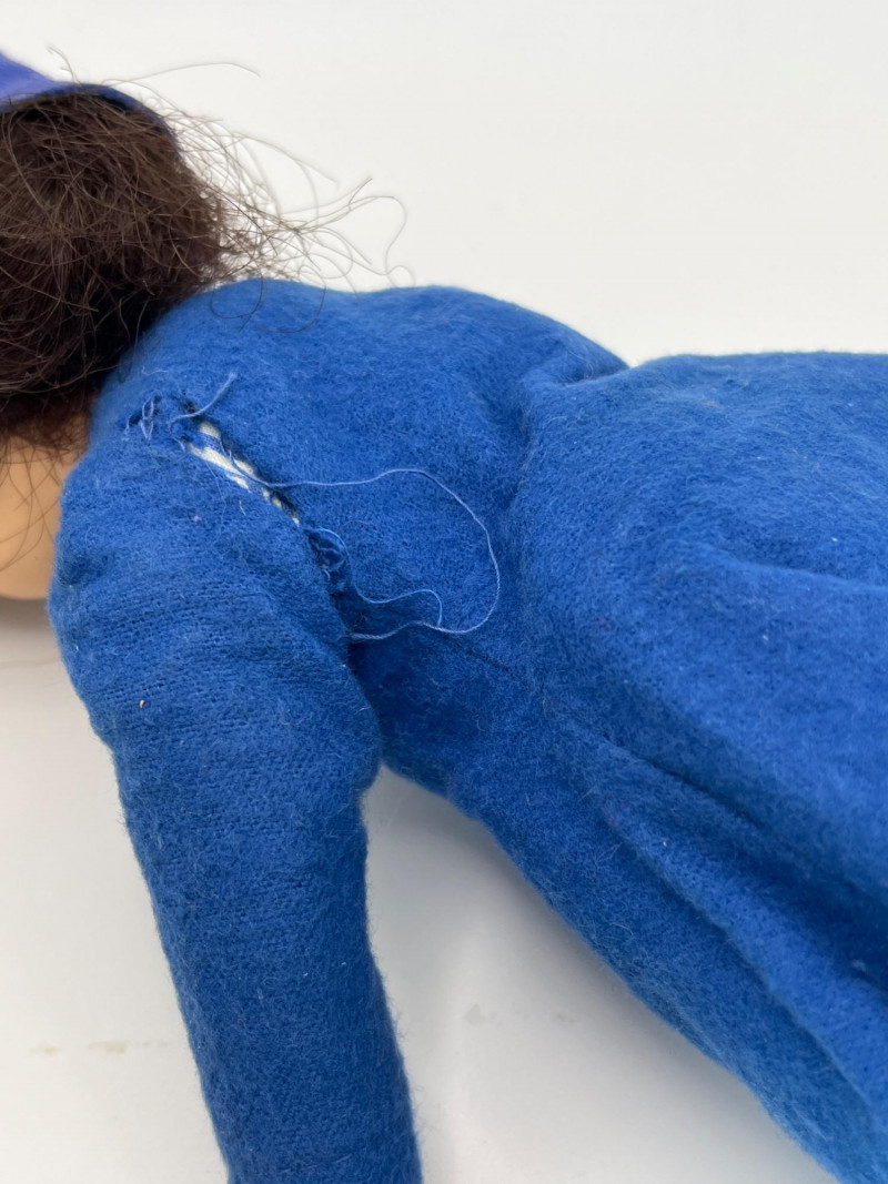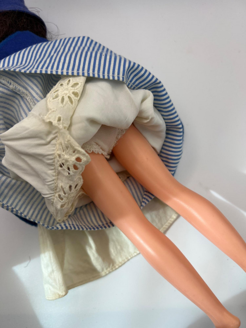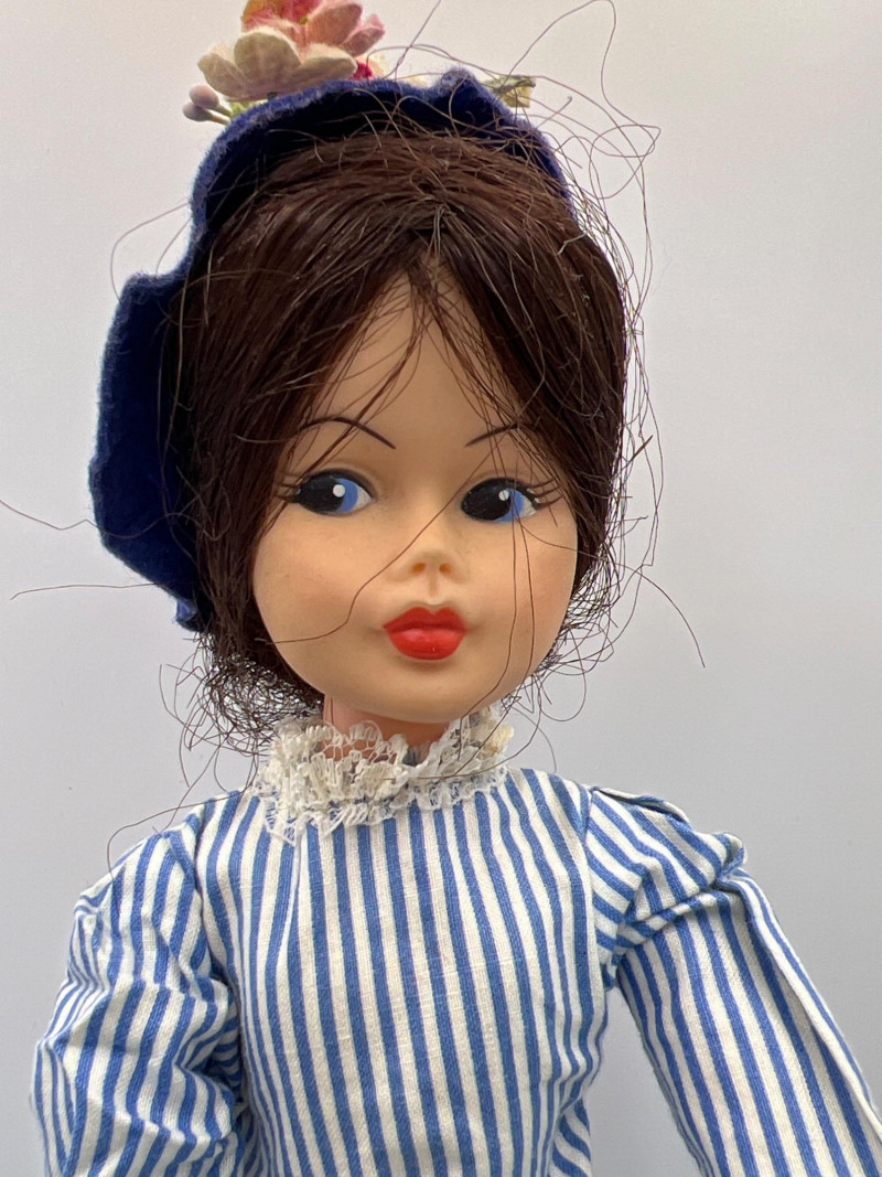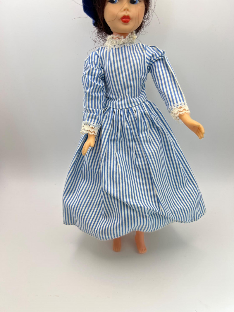 A vintage 12-inch Mary Poppins doll by Horsman (1964-1967), dressed in her original blue coat, matching hat, striped dress, and lace-trimmed bloomers. Her painted features, dark hair, and bright blue eyes reflect the classic mid‑century Horsman style—sweet, expressive, and unmistakably storybook. Additional garments accompany her, including pastel dresses and skirts that expand her display wardrobe. A charming piece for collectors of Horsman, character dolls, or film-inspired vintage figures. Condition consistent with age and gentle handling. MISSING: stockings, shoes, purse